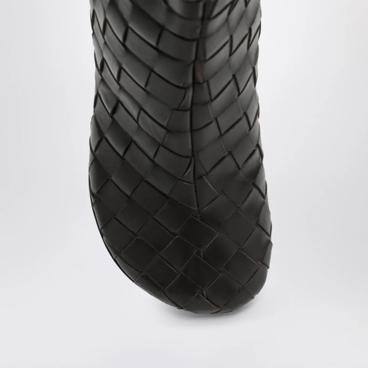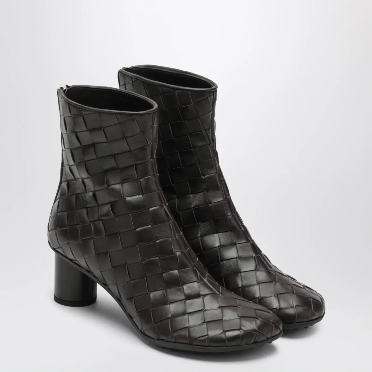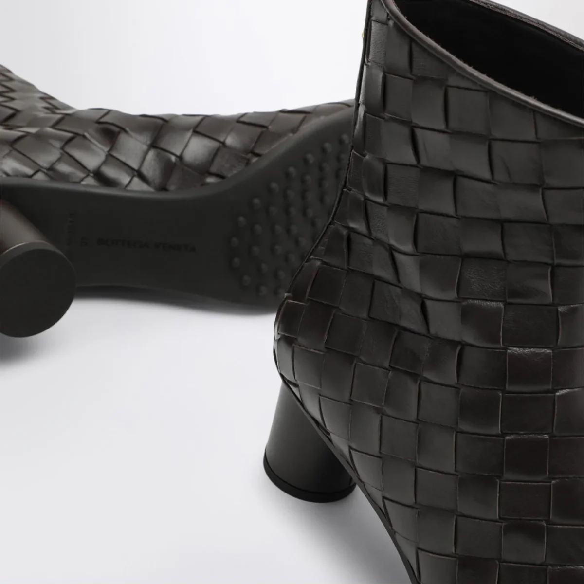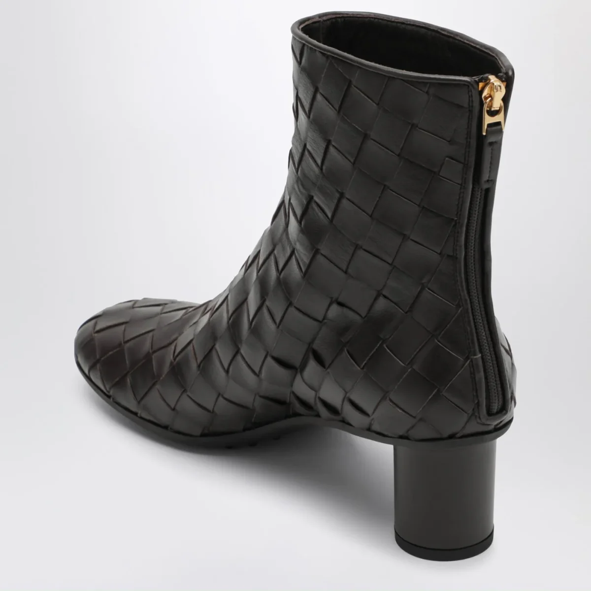 Stivaletto di Bottega Veneta in pelle con motivo Intrecciato color Fondente, caratterizzato da punta tonda, chiusura posteriore con zip, tacco cilindrico, suola in gomma e cuoio ed elementi metallici con finitura oro.