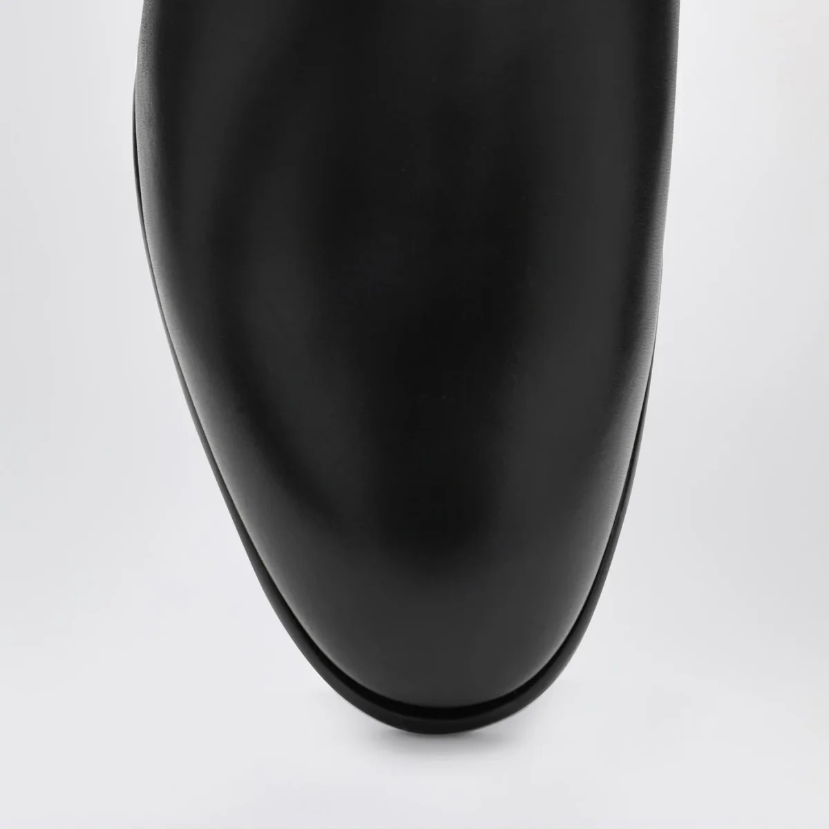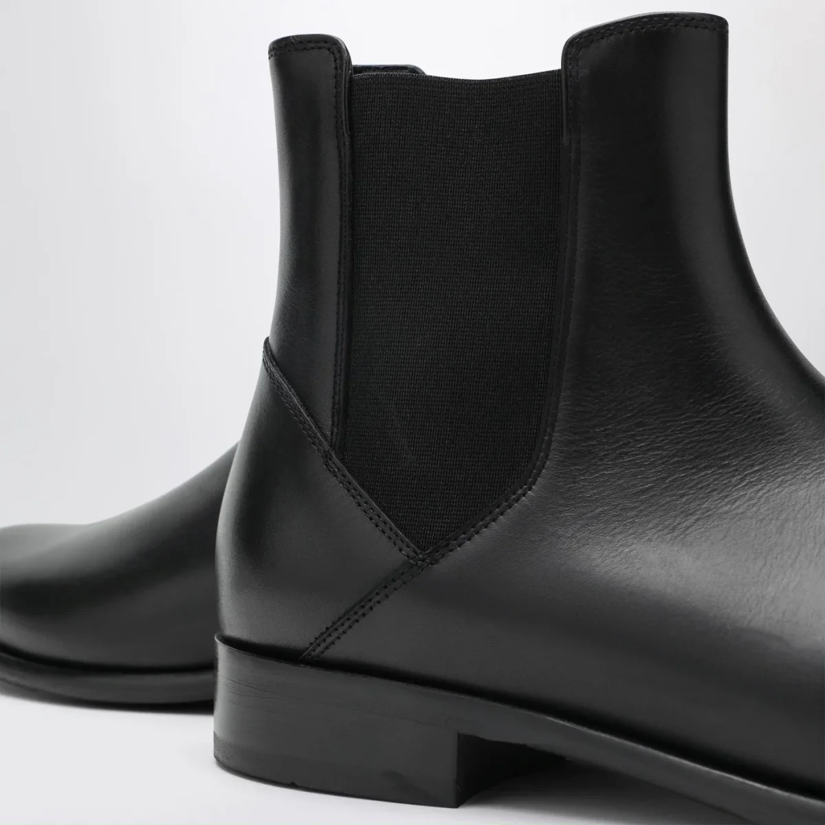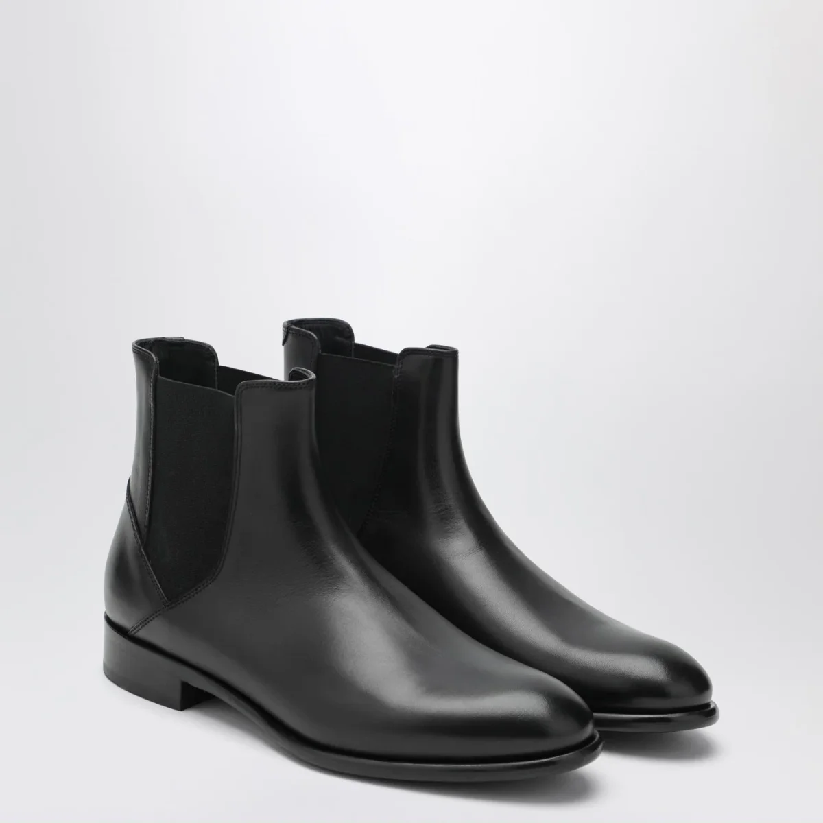 Stivaletto di Doucal’s in pelle liscia nero, caratterizzato da punta arrotondata, inserti elasticizzati ai lati e suola in cuoio.
