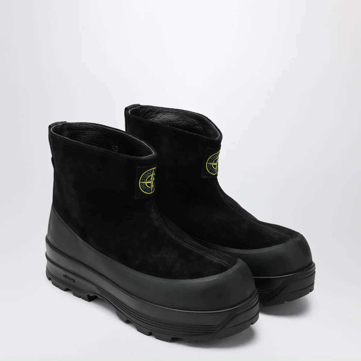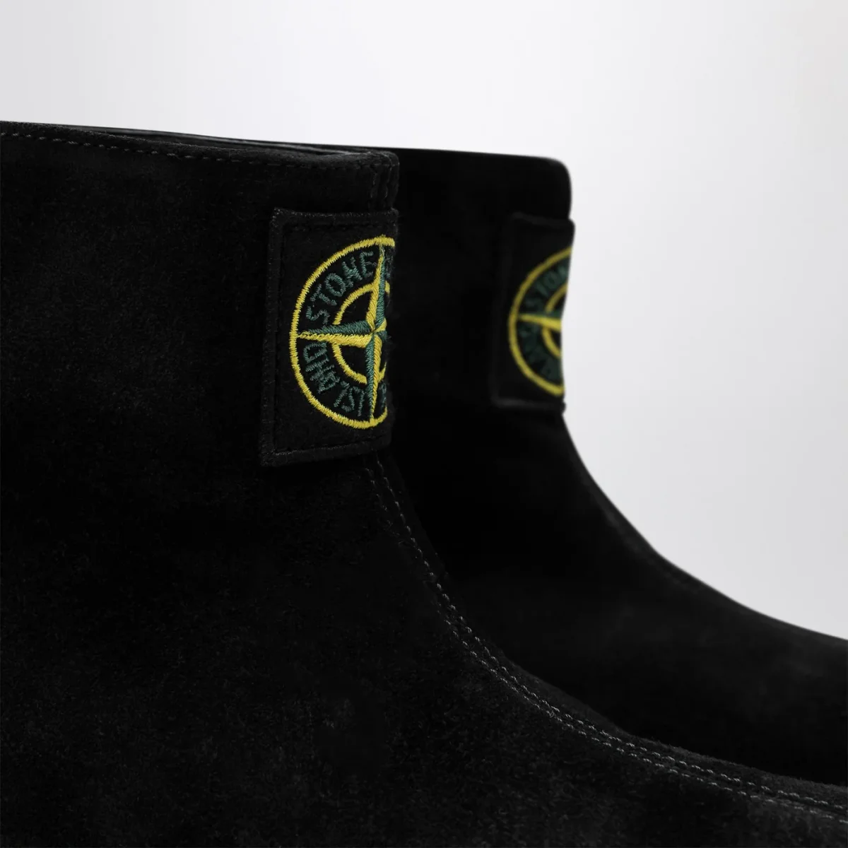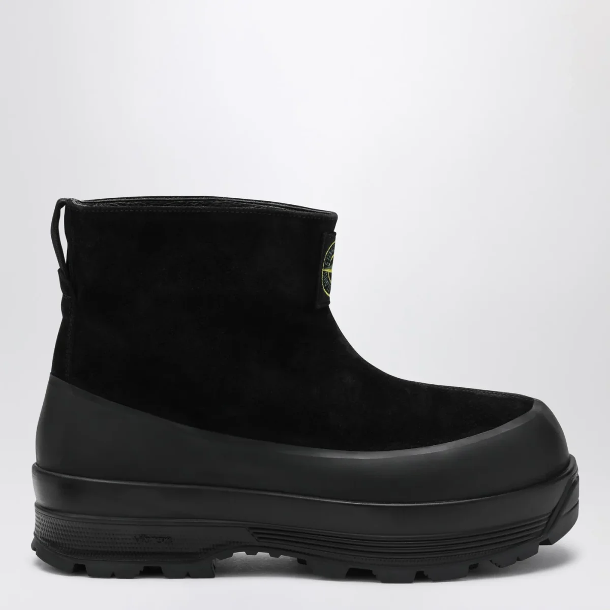 Stivaletto di Stone Island in pelle scamosciata nero, caratterizzato da patch logo Compass sul davanti, passante posteriore e suola Vibram.