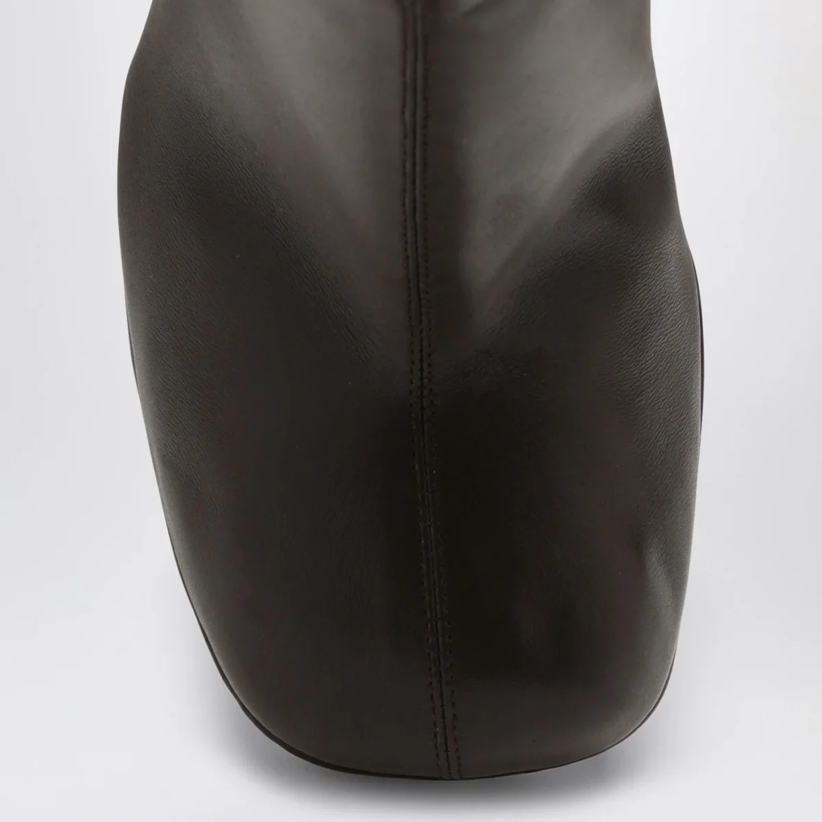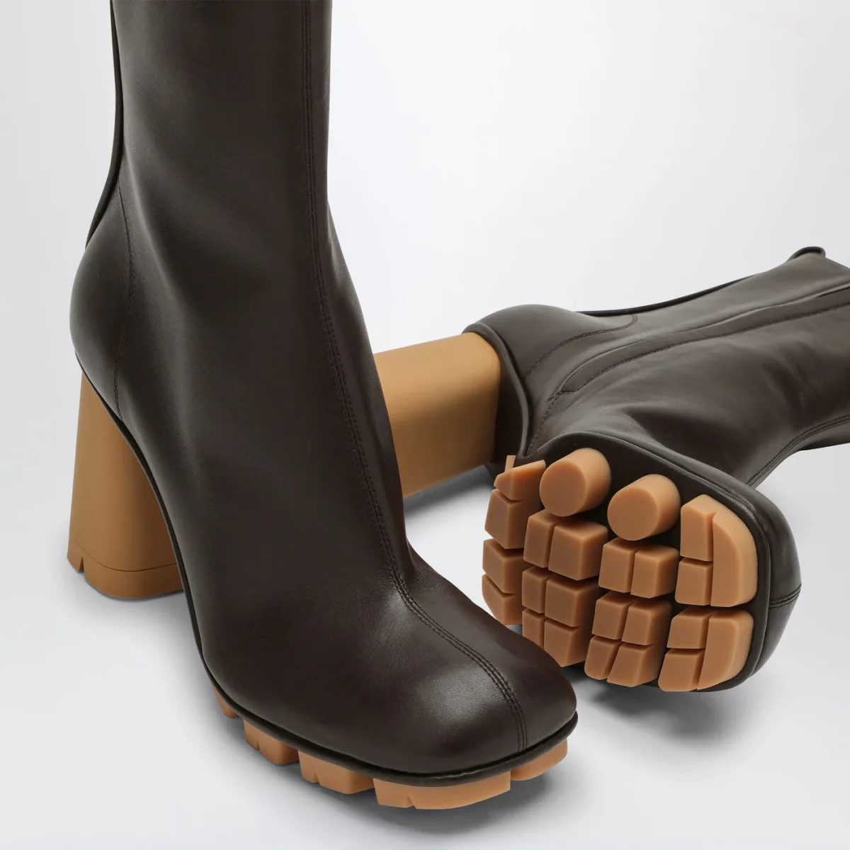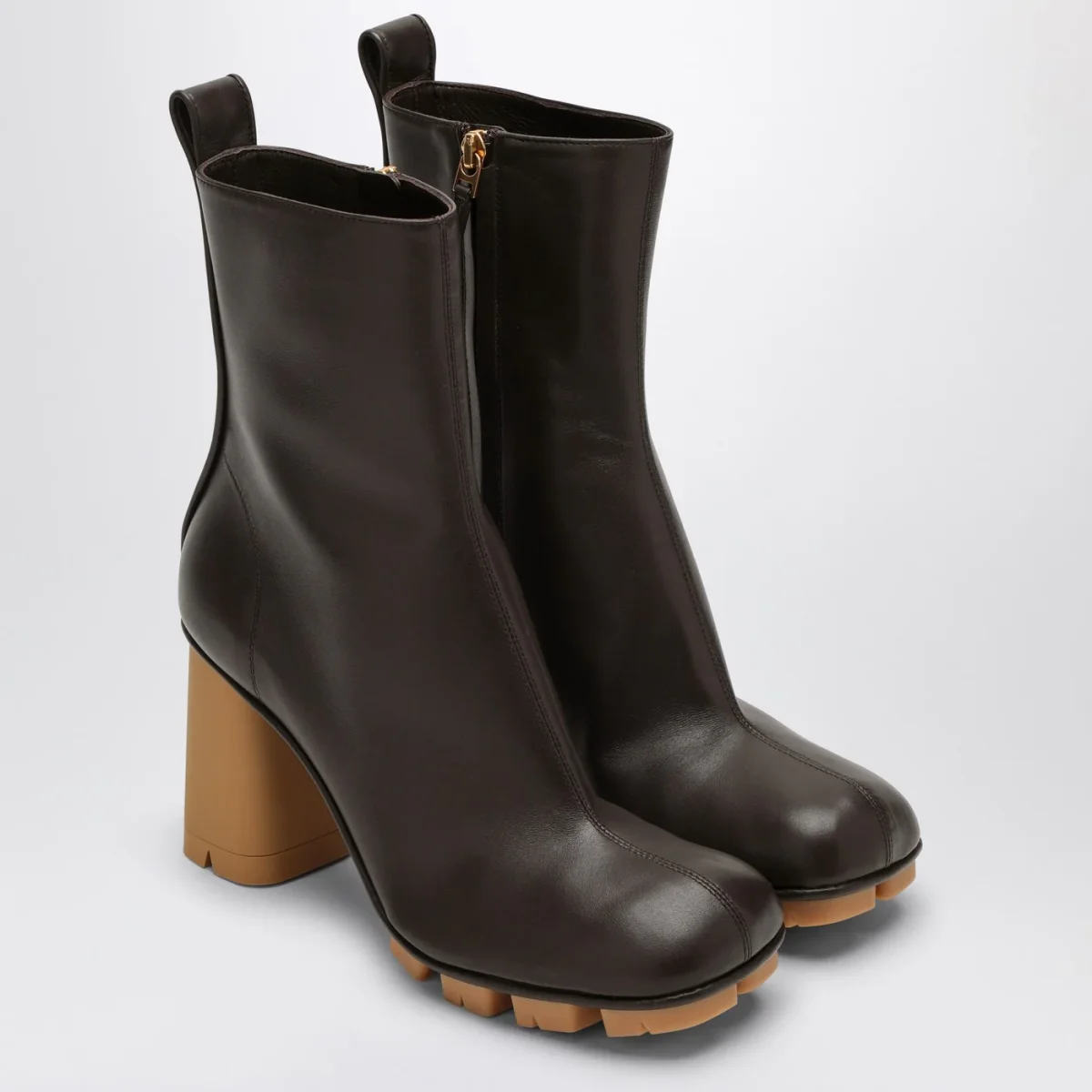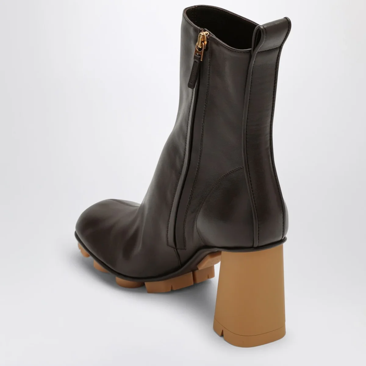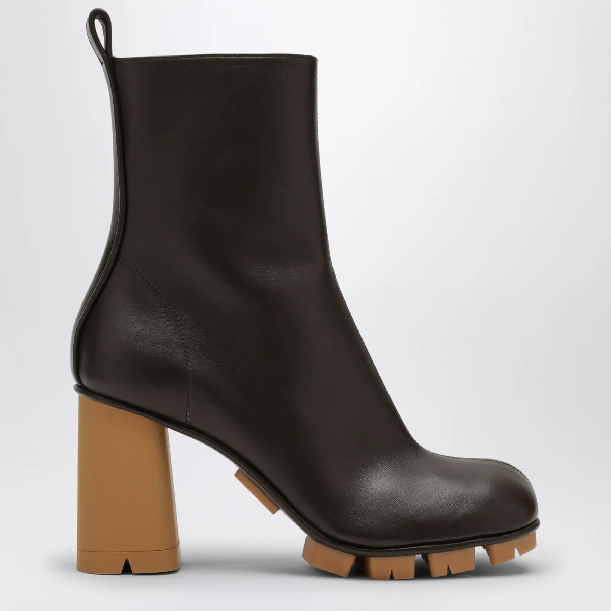 Stivaletto di Bottega Veneta in pelle di agnello liscia marrone scuro, caratterizzato da zip laterale, punta tonda, tacco ampio, linguetta posteriore e suola oversize in gomma a contrasto.