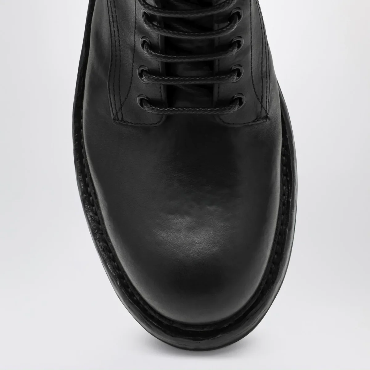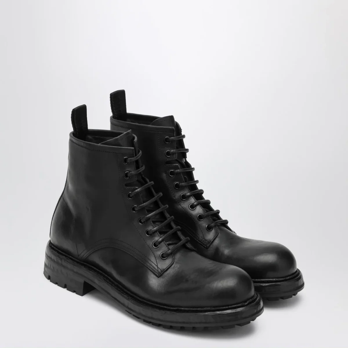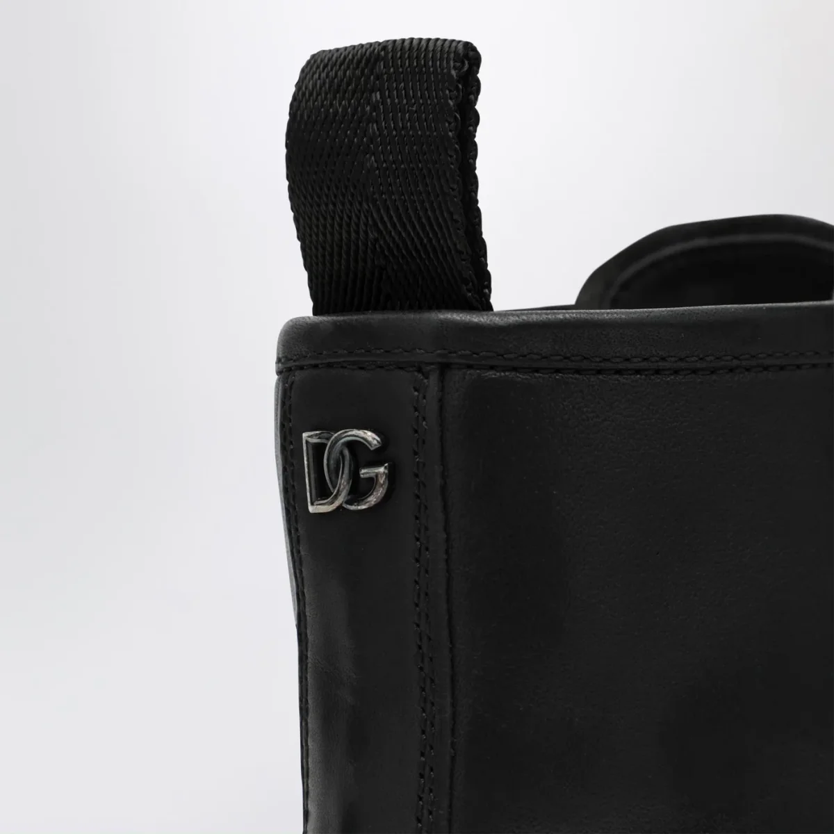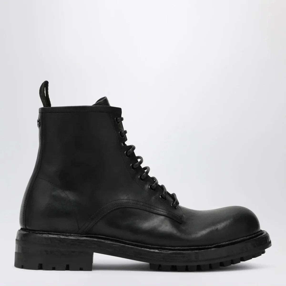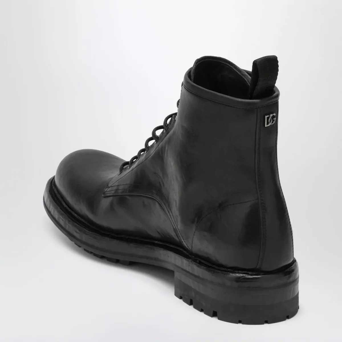 Stivaletto di Dolce & Gabbana in pelle di vitello nero, caratterizzato da chiusura frontale con stringhe, tirante posteriore in tessuto, punta tonda, dettaglio logo in metallo sul retro e suola in gomma.
