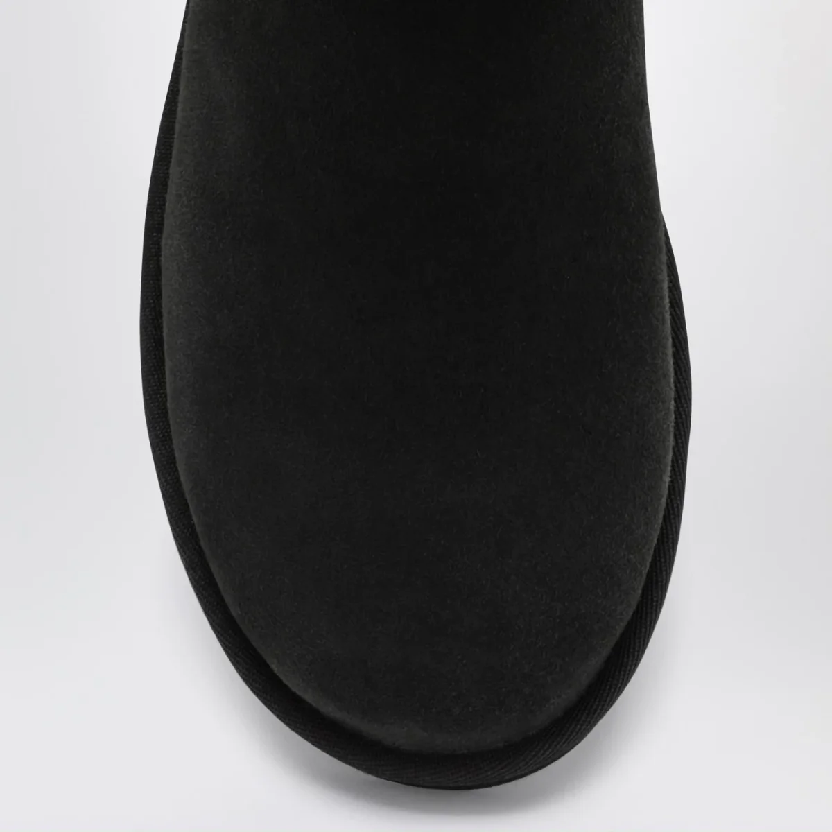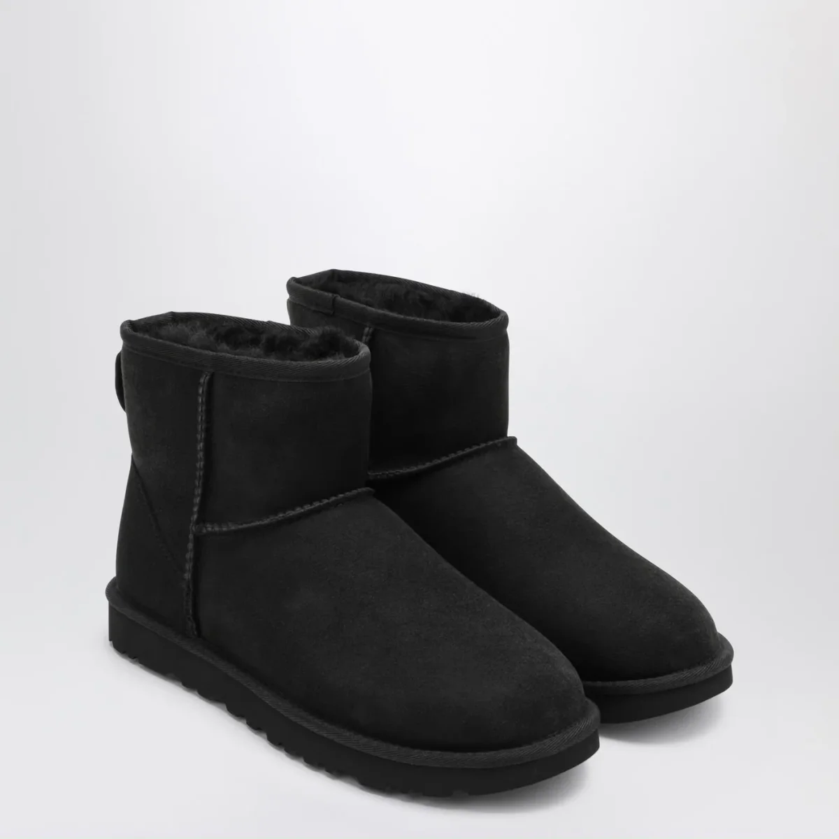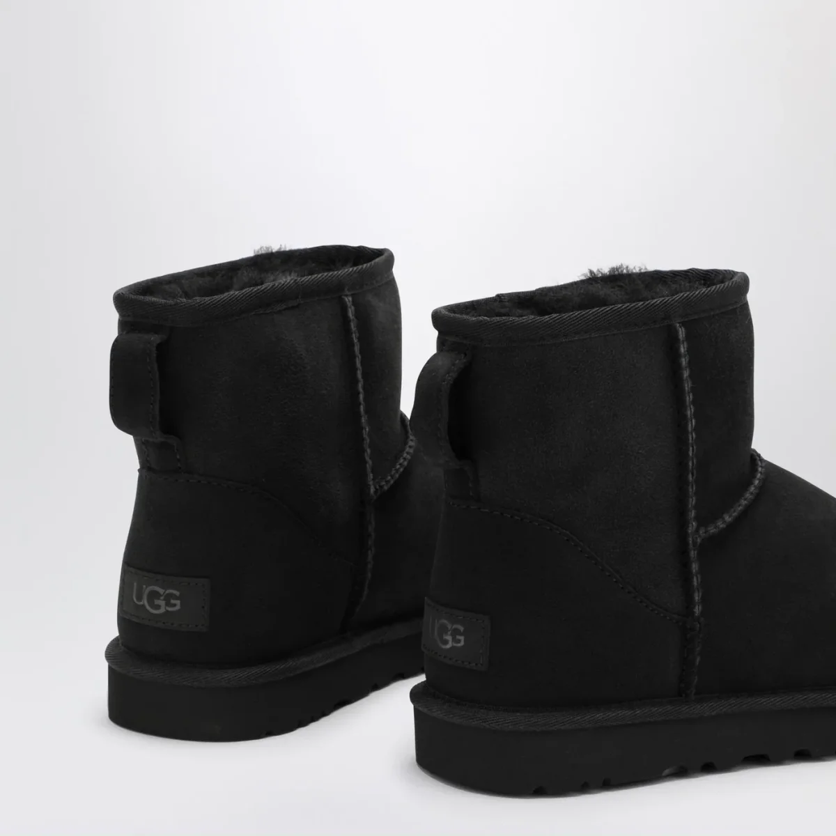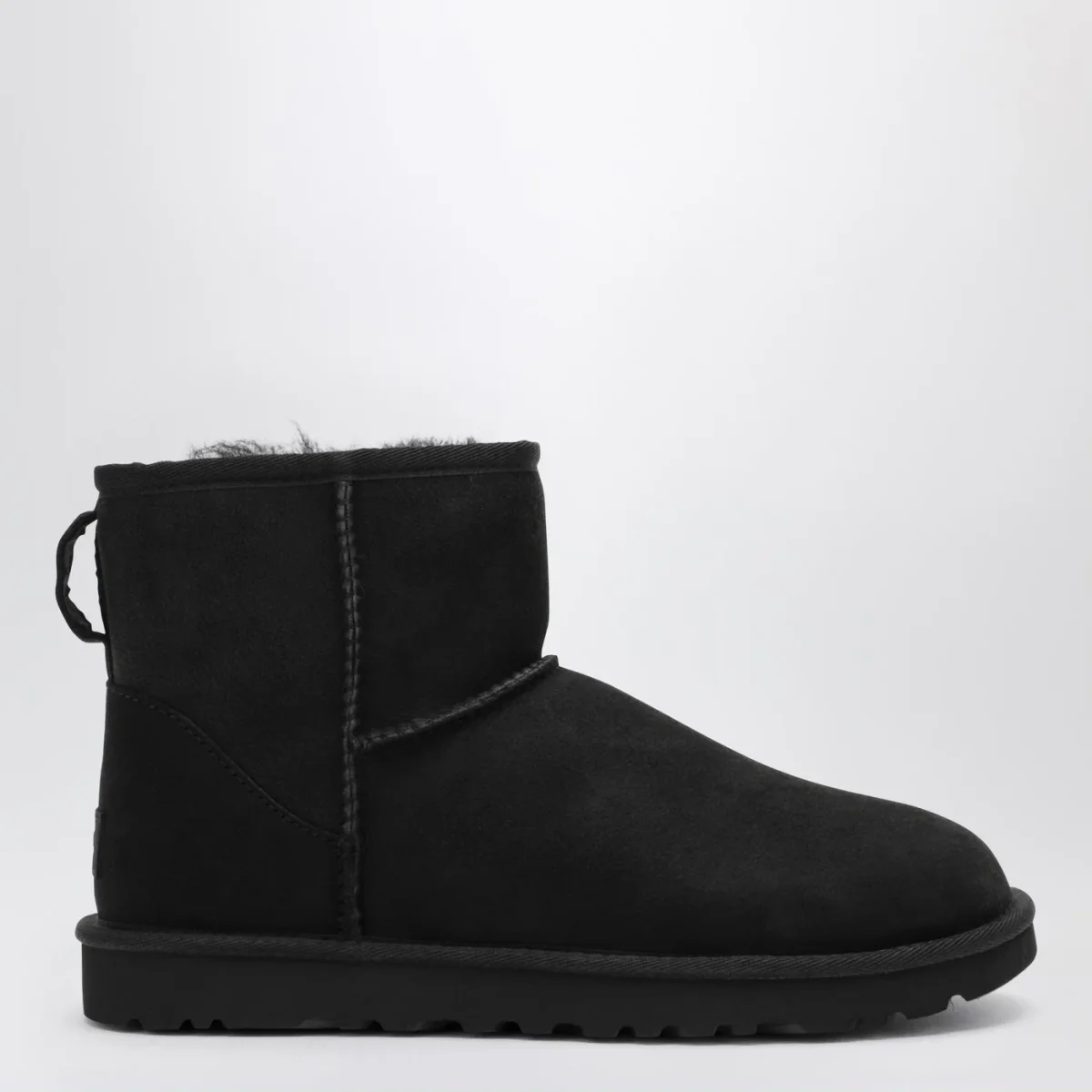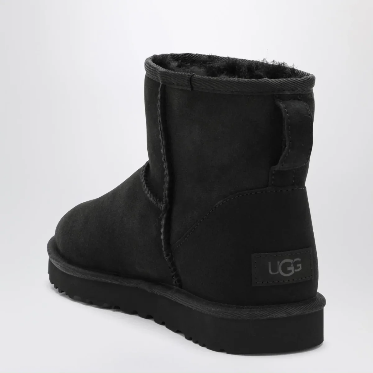 Stivali di UGG in montone rovesciato e pelle scamosciata neri, caratterizzati da punta tonda, tirante posteriore, cuciture overlock, soletta in montone, bordo in nylon, patch con logo lettering posteriore e suola Treadlite by UGG.