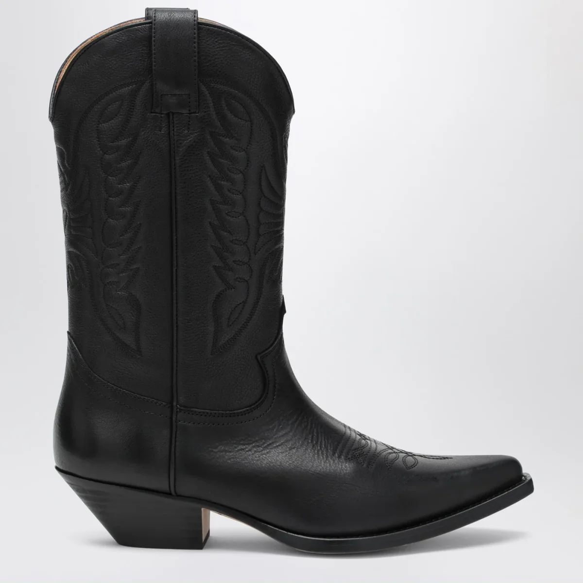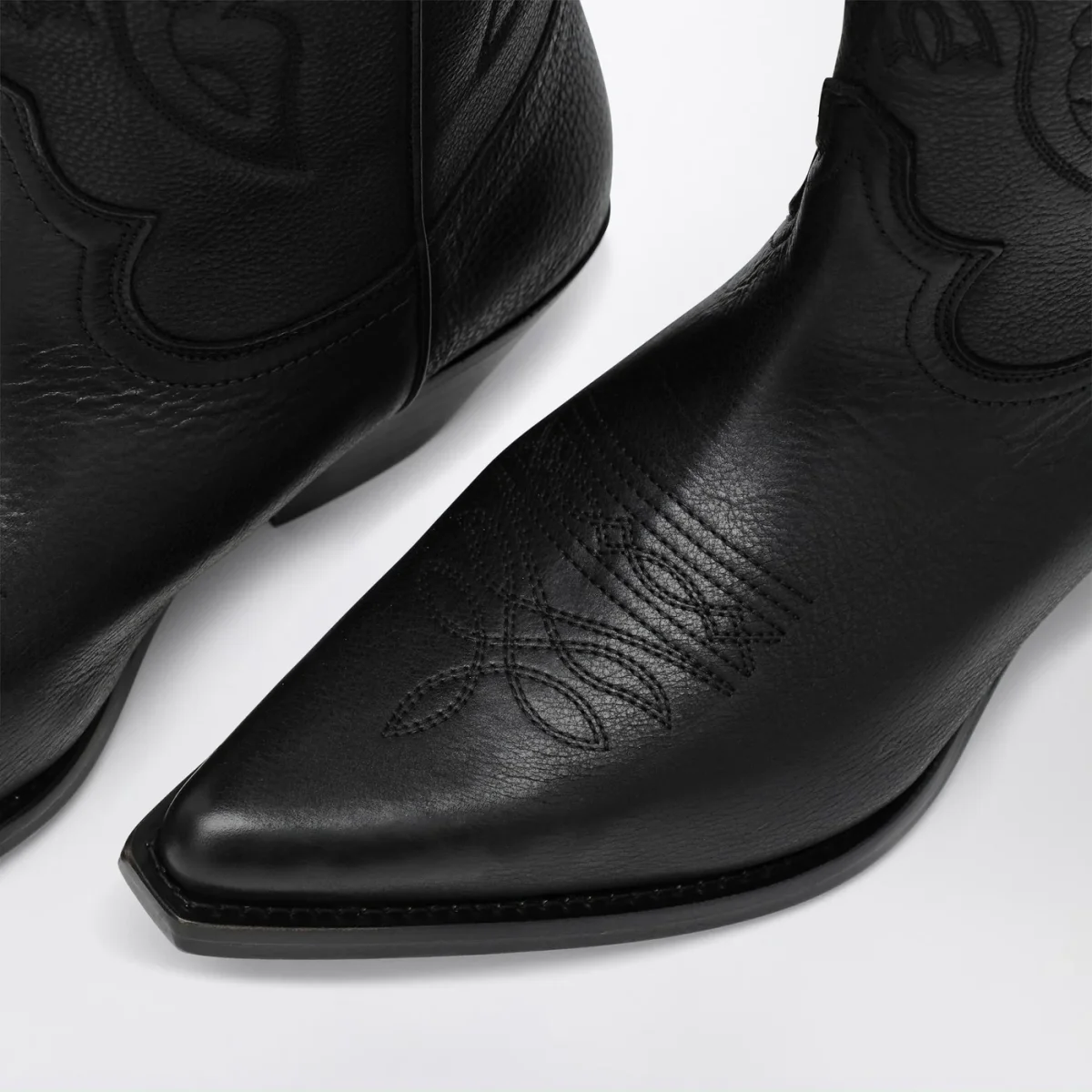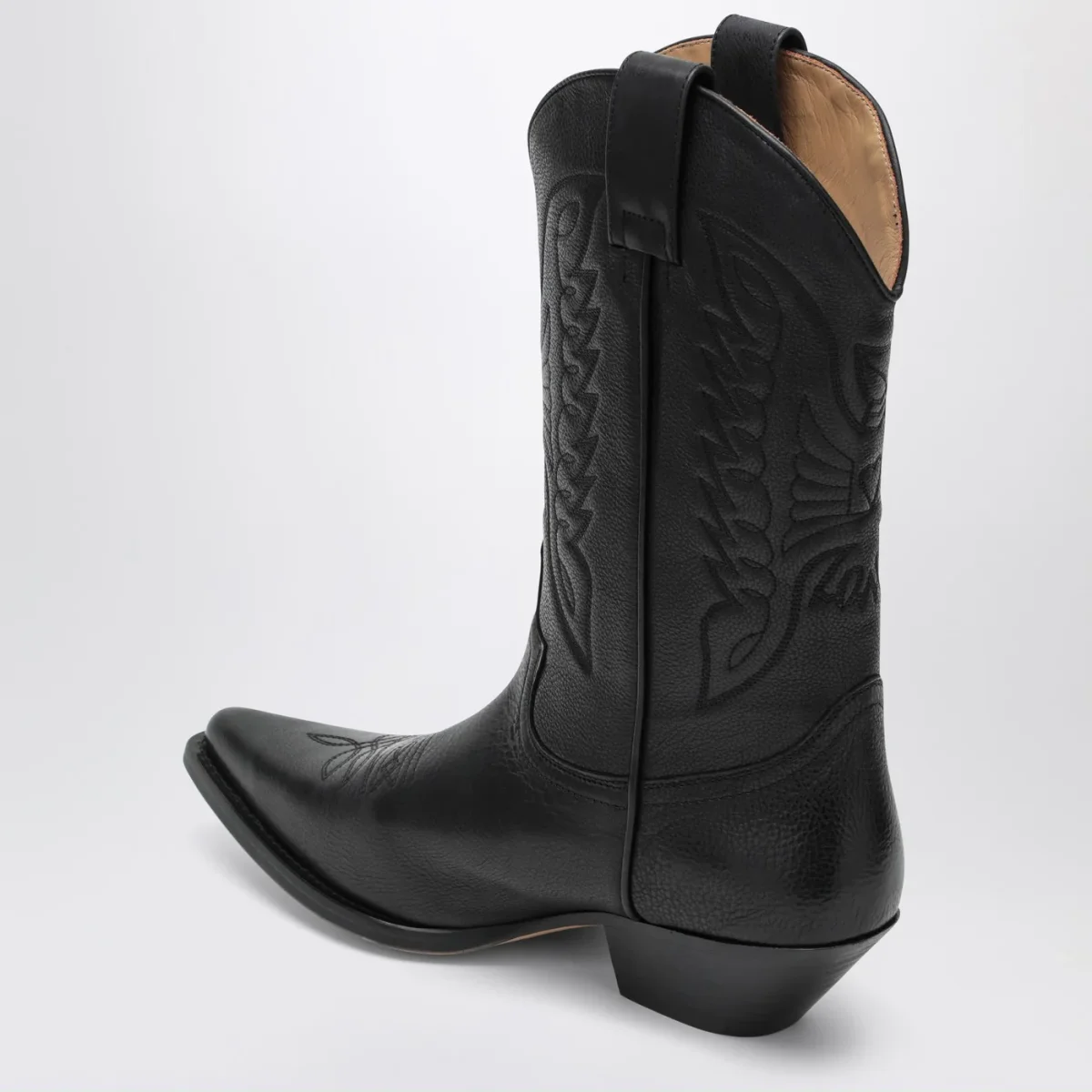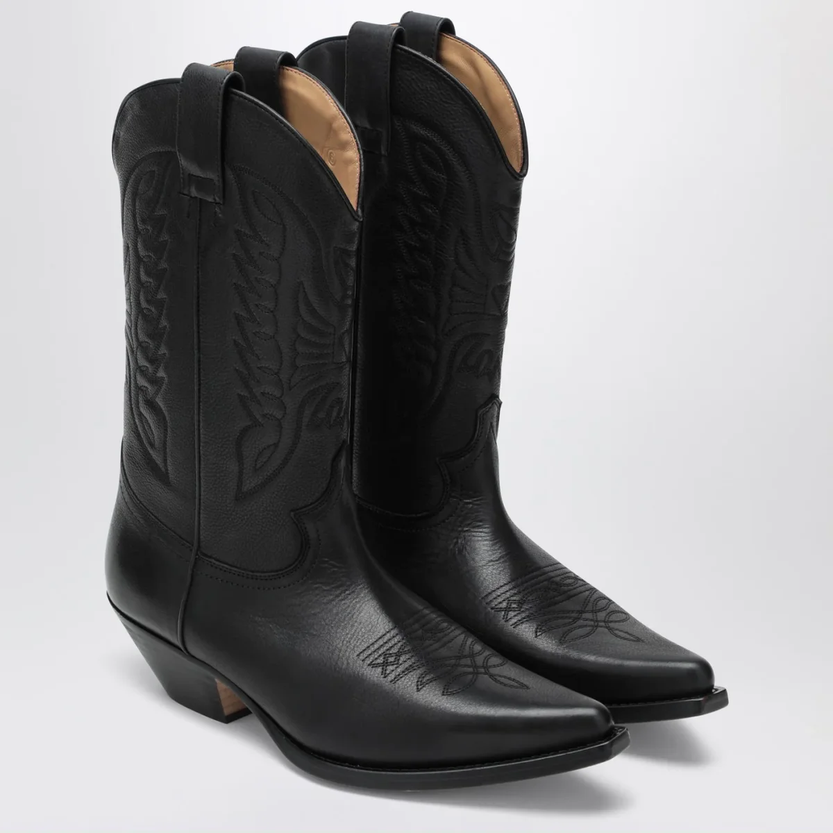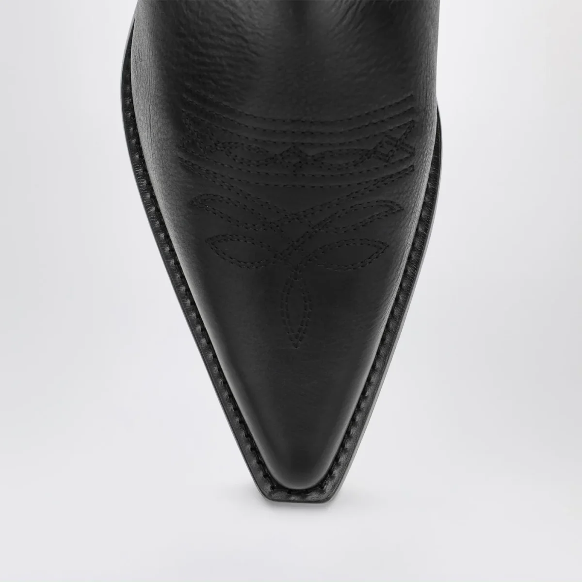 Stivali da cowboy di MM6 Maison Margiela in pelle neri, caratterizzati da gambale con motivi ricamati, punta affusolata, tacco a blocco e suola in cuoio.