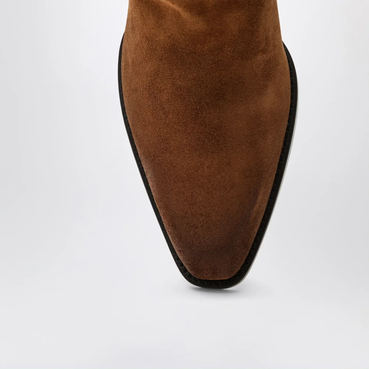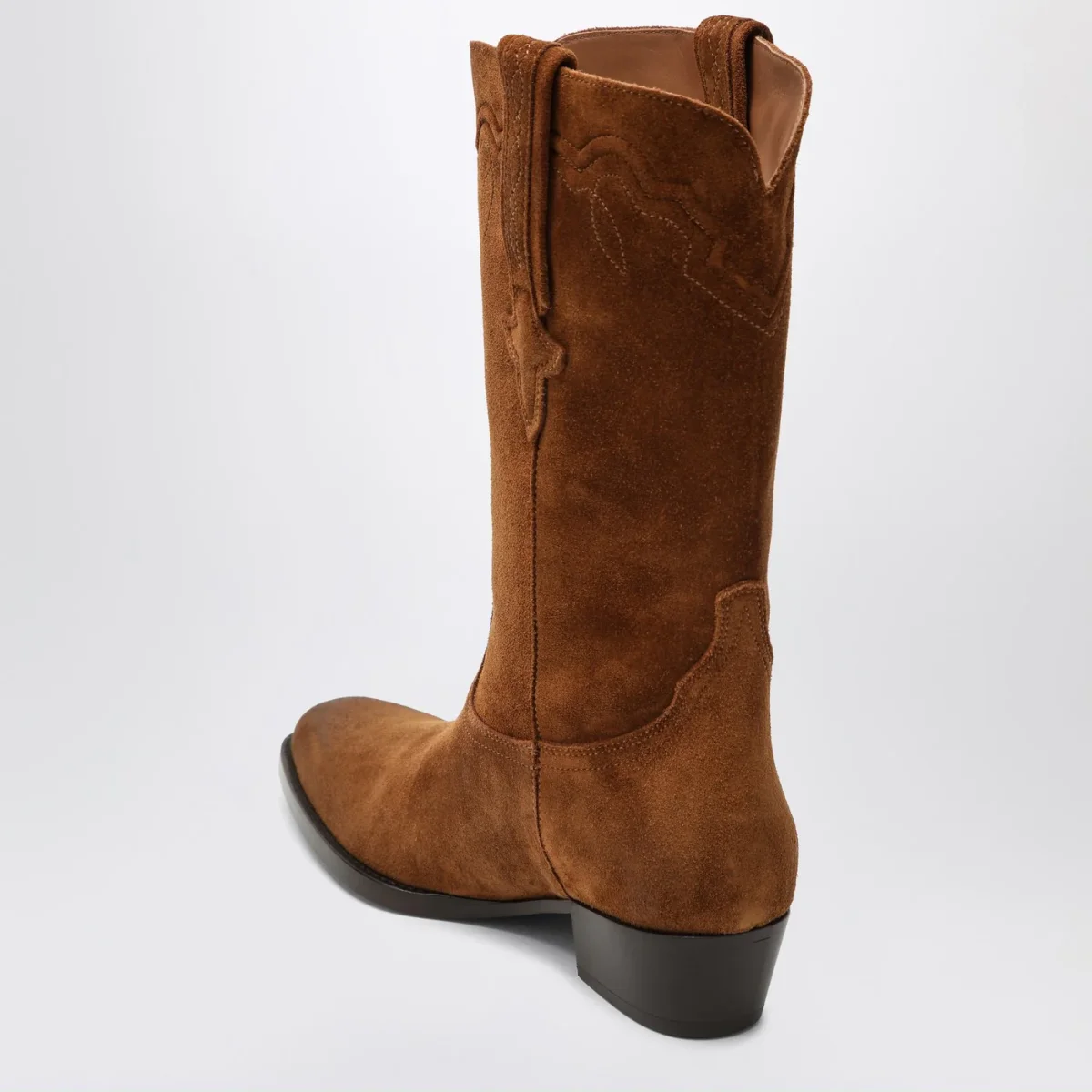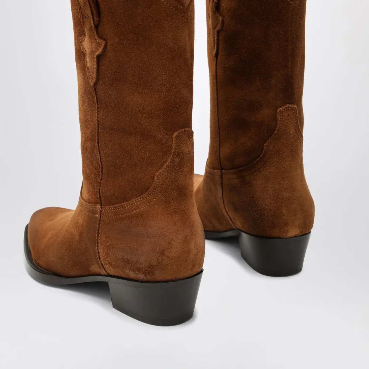 Stivali di Paris Texas in pelle di vitello scamosciata color Cognac, caratterizzati da design a punta quadrata con ricami in stile western e suola in cuoio.