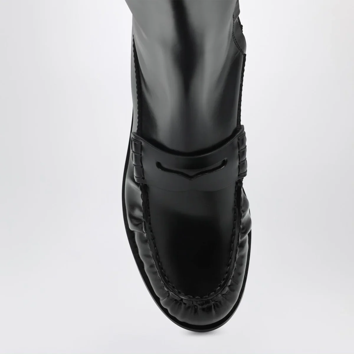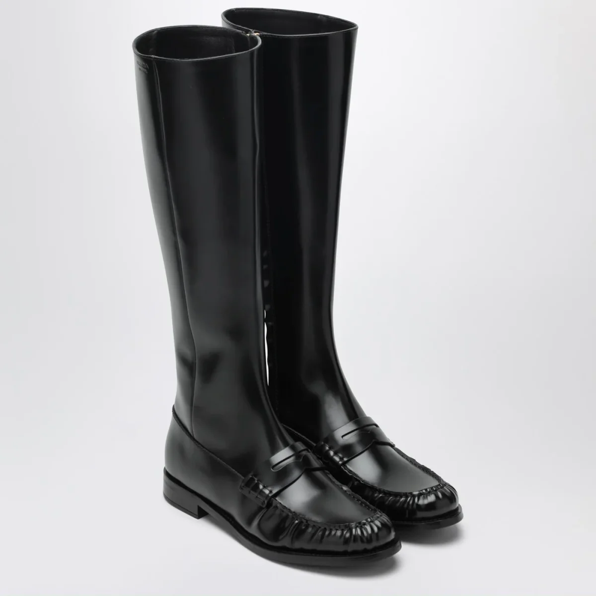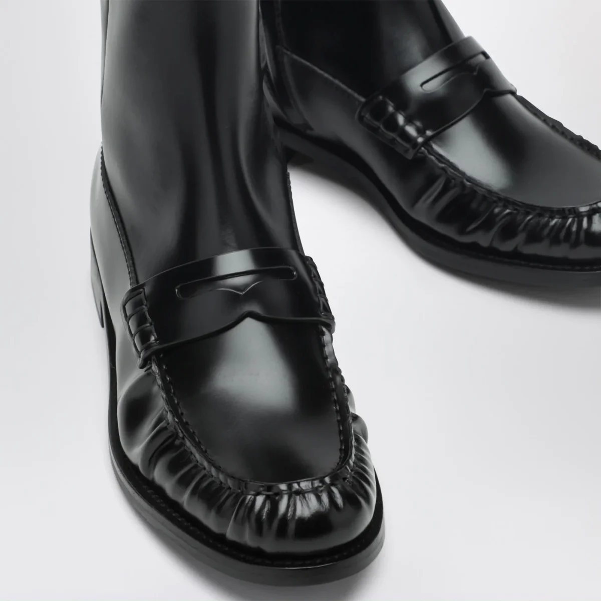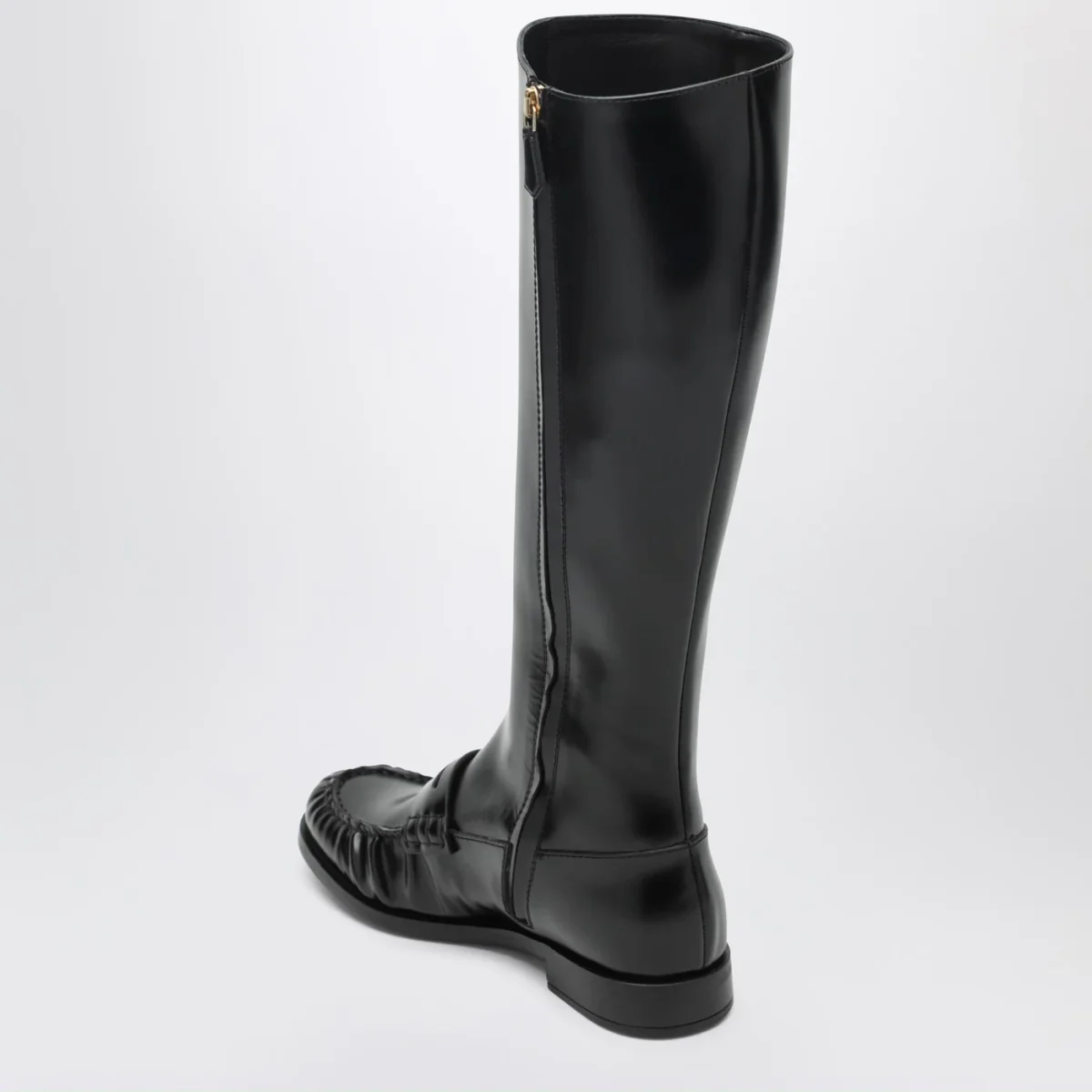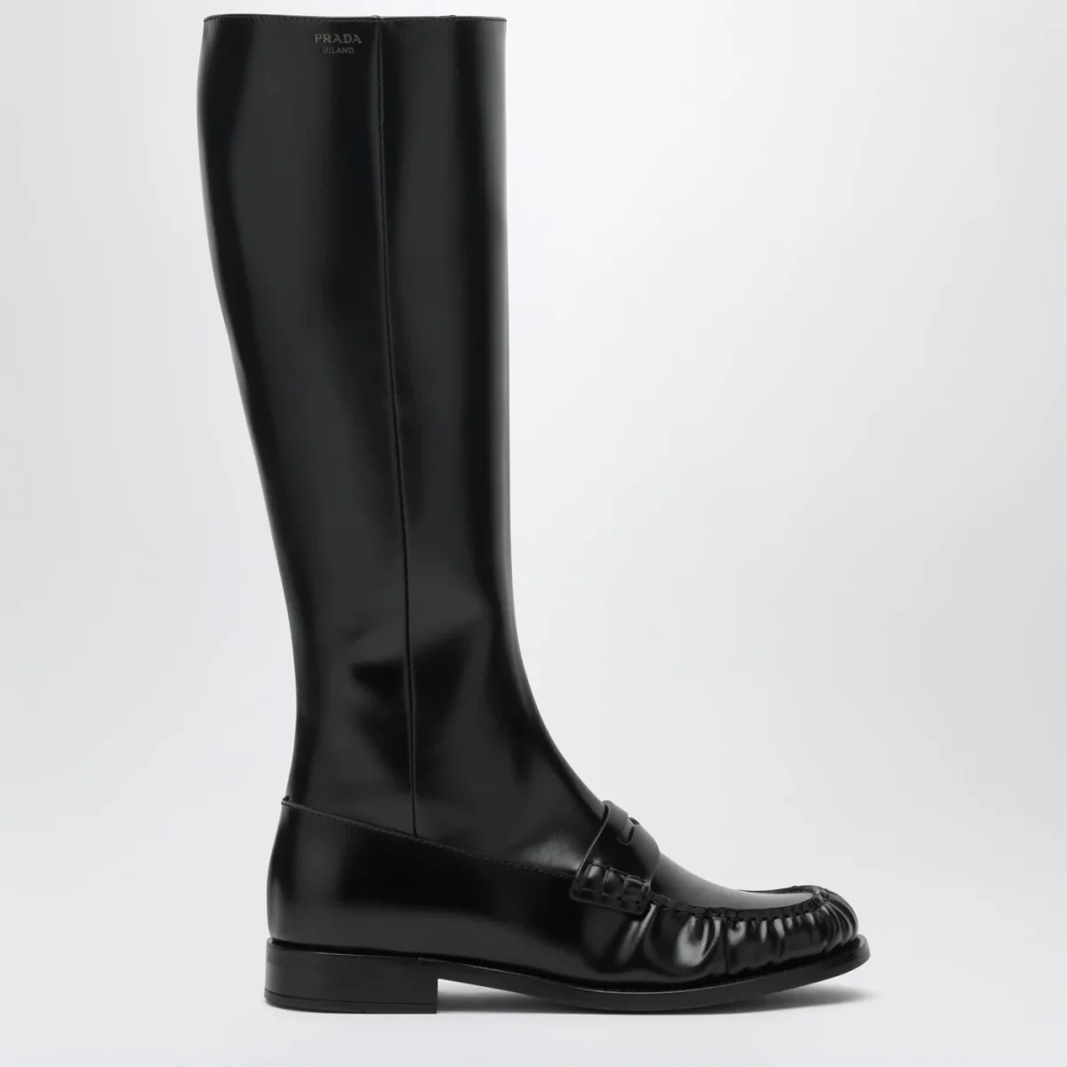 Stivali di Prada in pelle lucida neri, caratterizzati da design mocassino, tomaia con fascetta Penny, gambale alto al ginocchio, chiusura interna con zip e suola in cuoio.