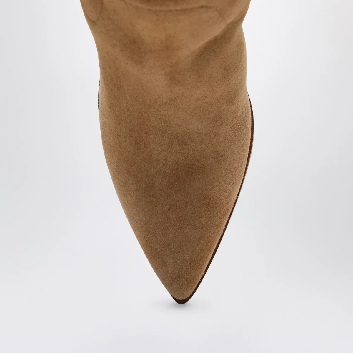 Stivali texani di Aquazzura in pelle scamosciata color cammello, caratterizzati da design a punta, cuciture tono su tono, fettuccia laterale, tacco texano e suola in cuoio.