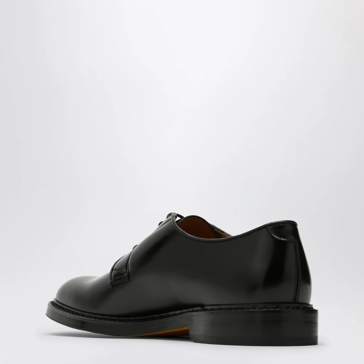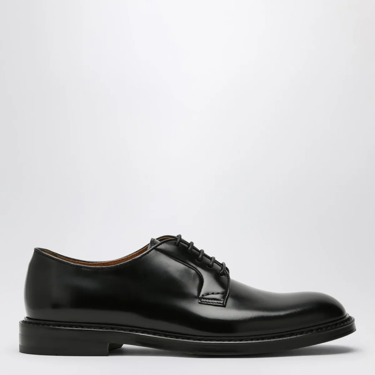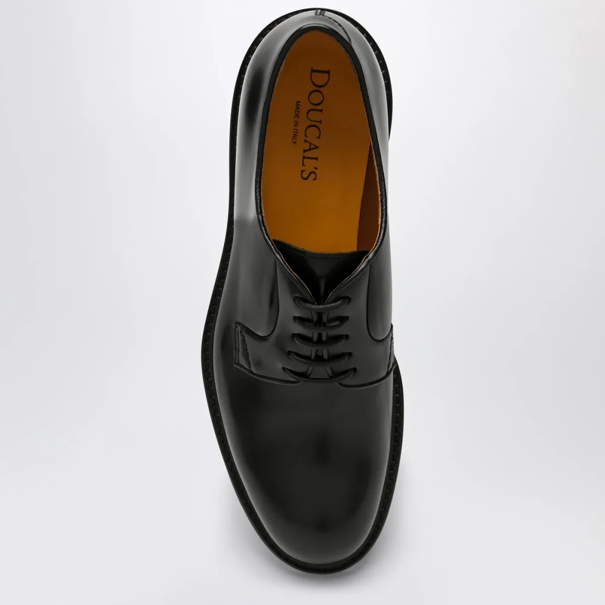 Scarpa stringata di Doucal’s in pelle liscia nera, con chiusura tramite stringhe, punta arrotondata e suola in gomma.