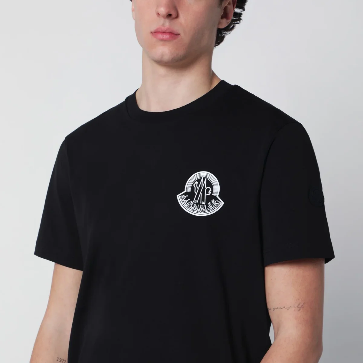 T-shirt di Moncler in cotone nera• maniche corte• girocollo a costine• stampa con logo lettering sul petto a contrasto