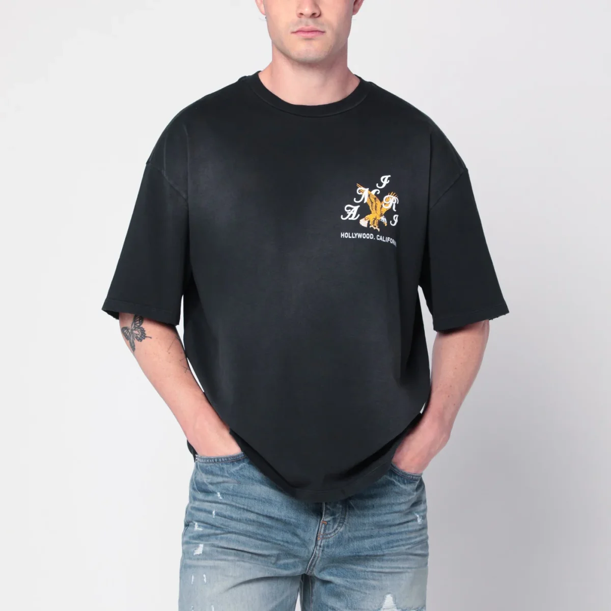 T-shirt ampia di Amiri in cotone nera, caratterizzata da girocollo a costine, maniche corte e stampa logo con aquila sul petto.