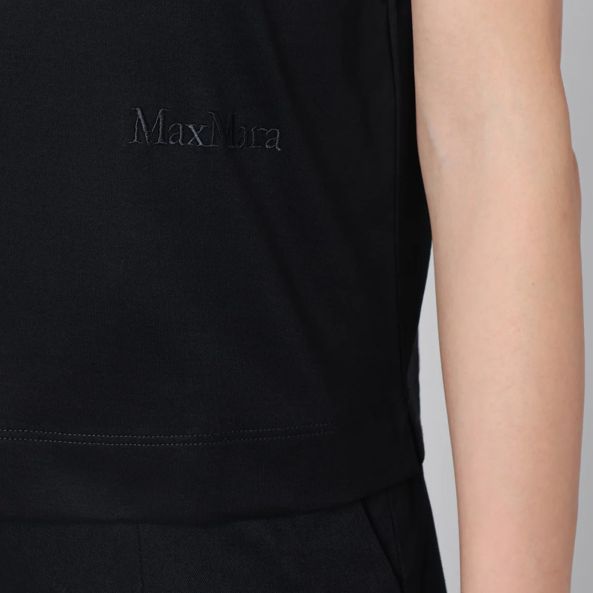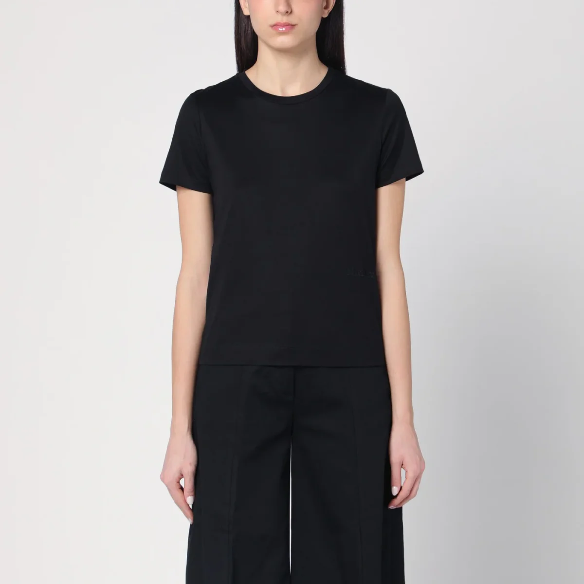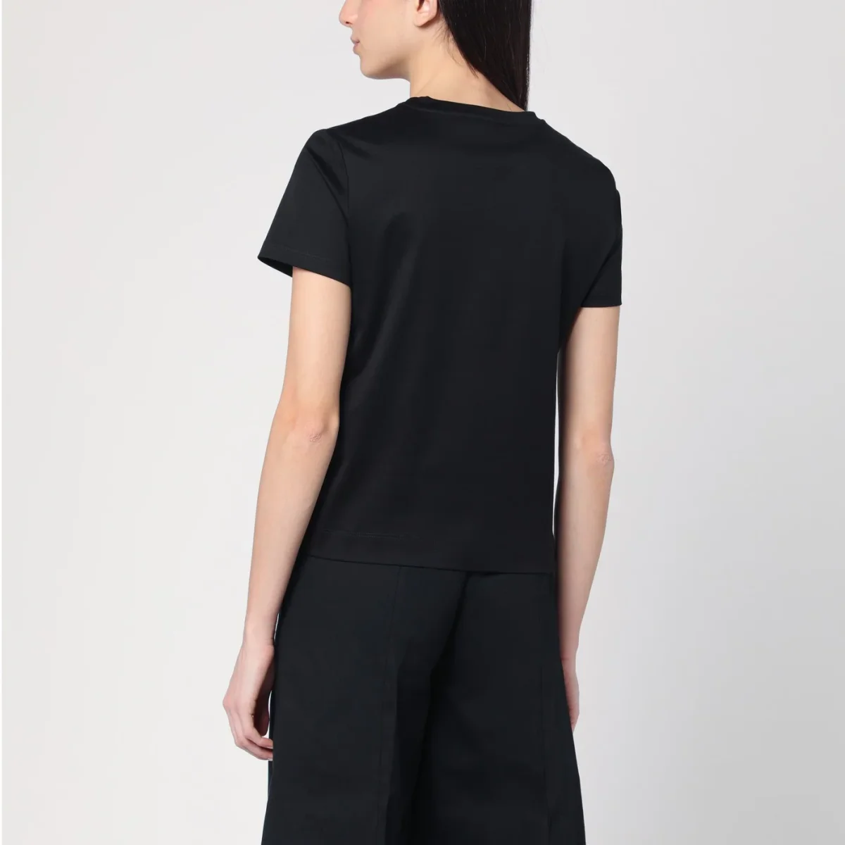 T-shirt girocollo di Max Mara in cotone nera, caratterizzata da manica corta, spacchetti laterali e logo lettering ricamato sul lato tono su tono.