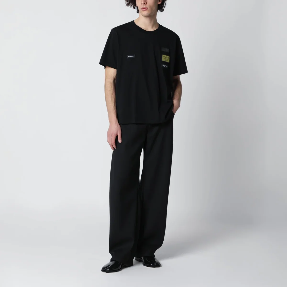 T-shirt nera in cotone con etichette