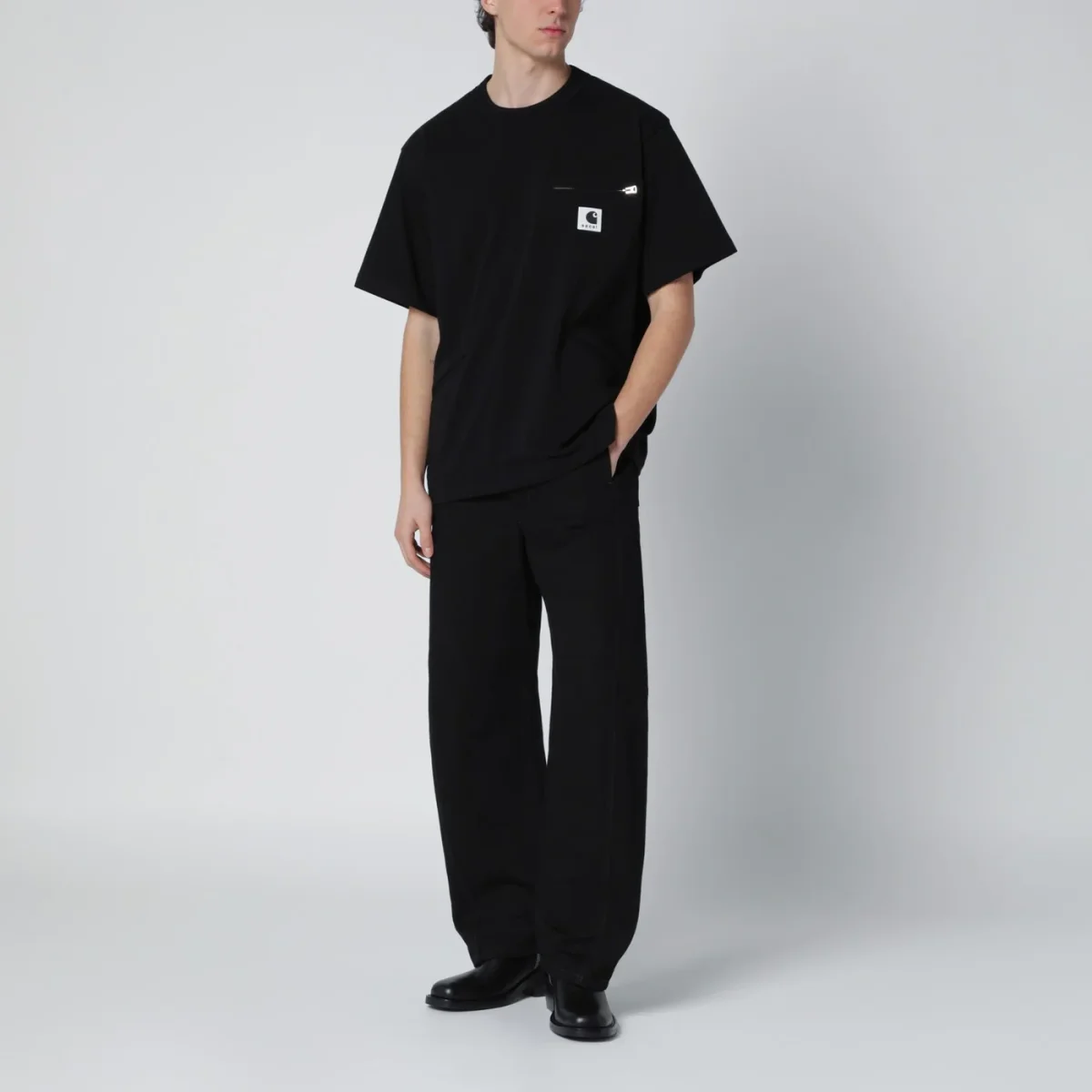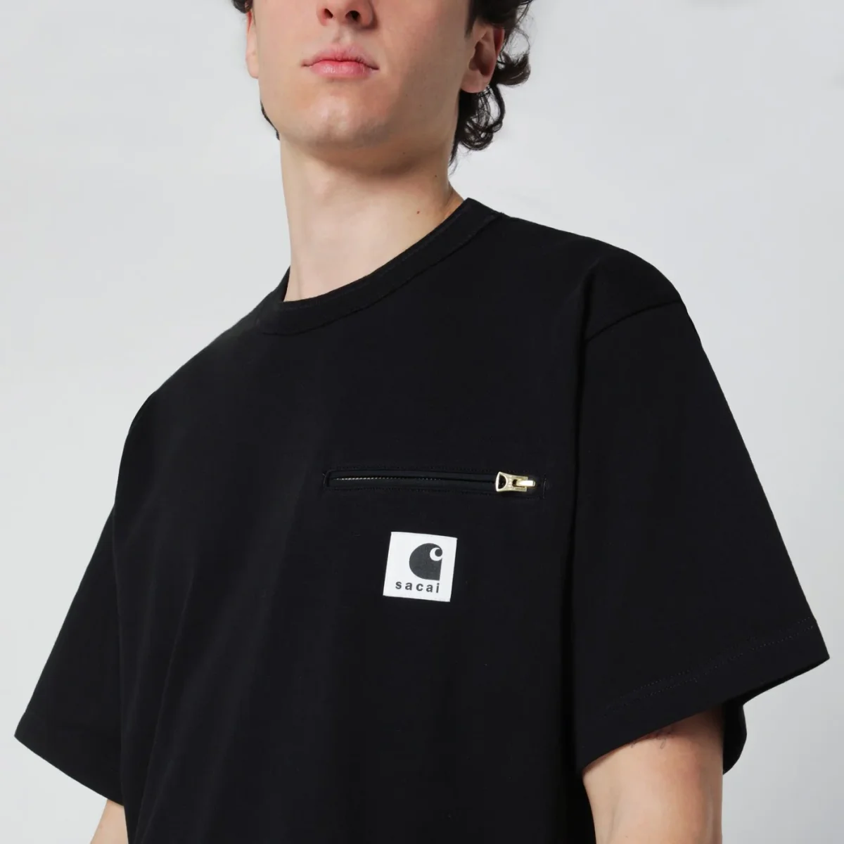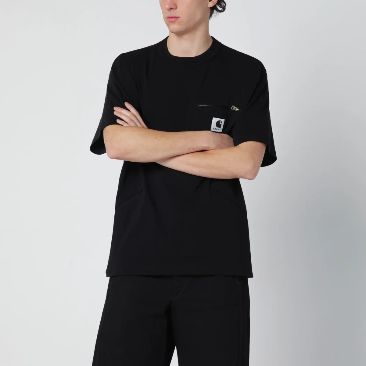 T-shirt di Carhartt WIP realizzata in collaborazione con Sacai in jersey di cotone nera, caratterizzata da girocollo a costine, maniche corte, una tasca con zip sul petto con patch logo e due tasche a filetto sul davanti.