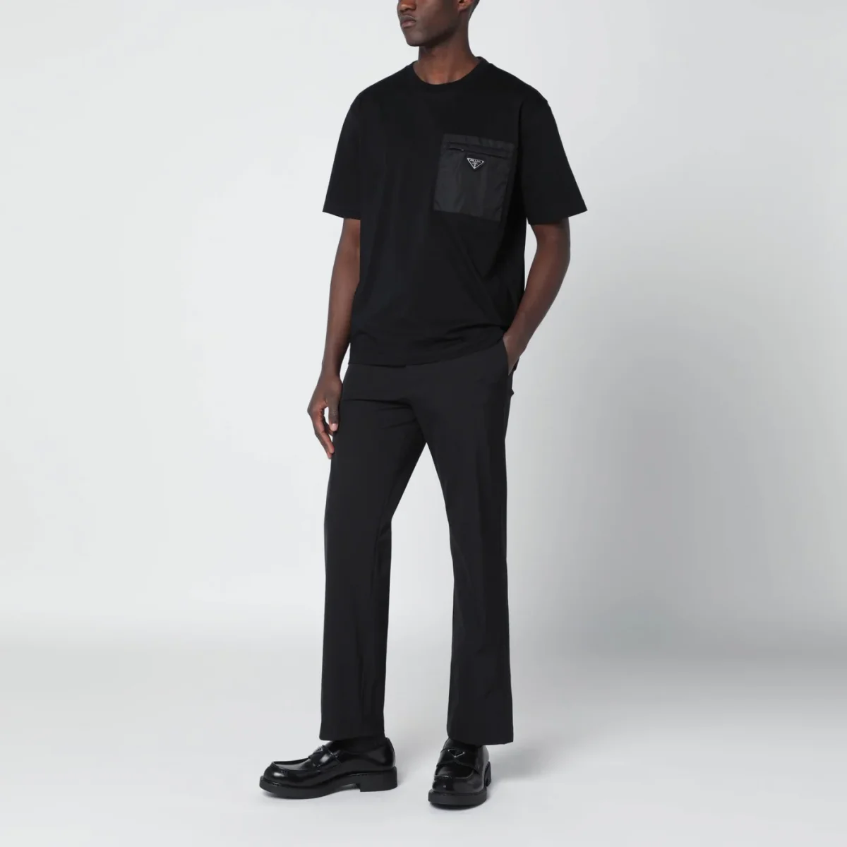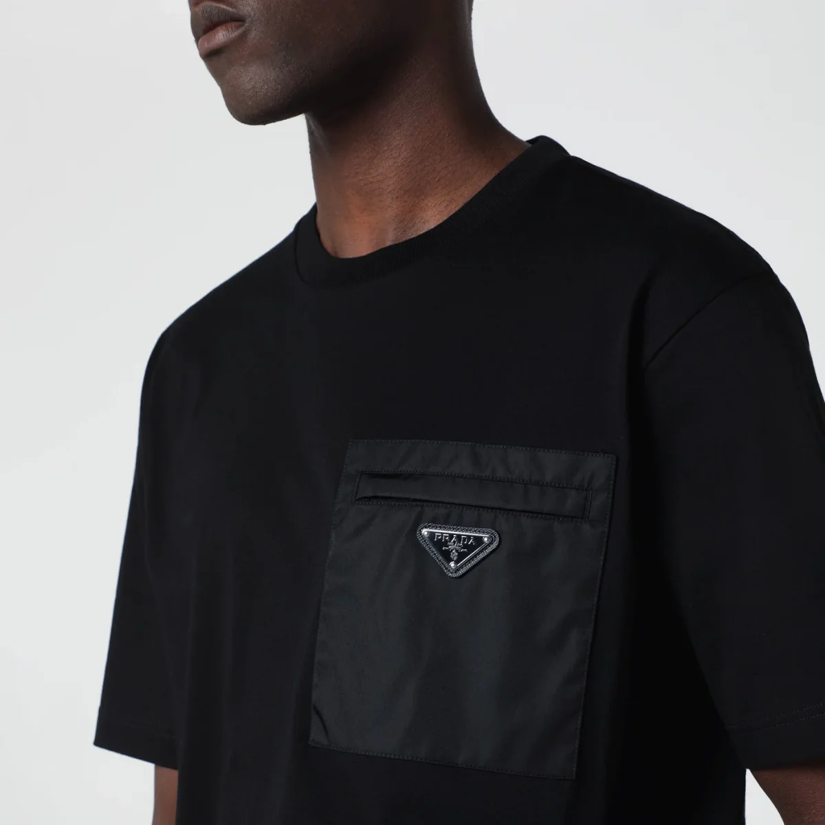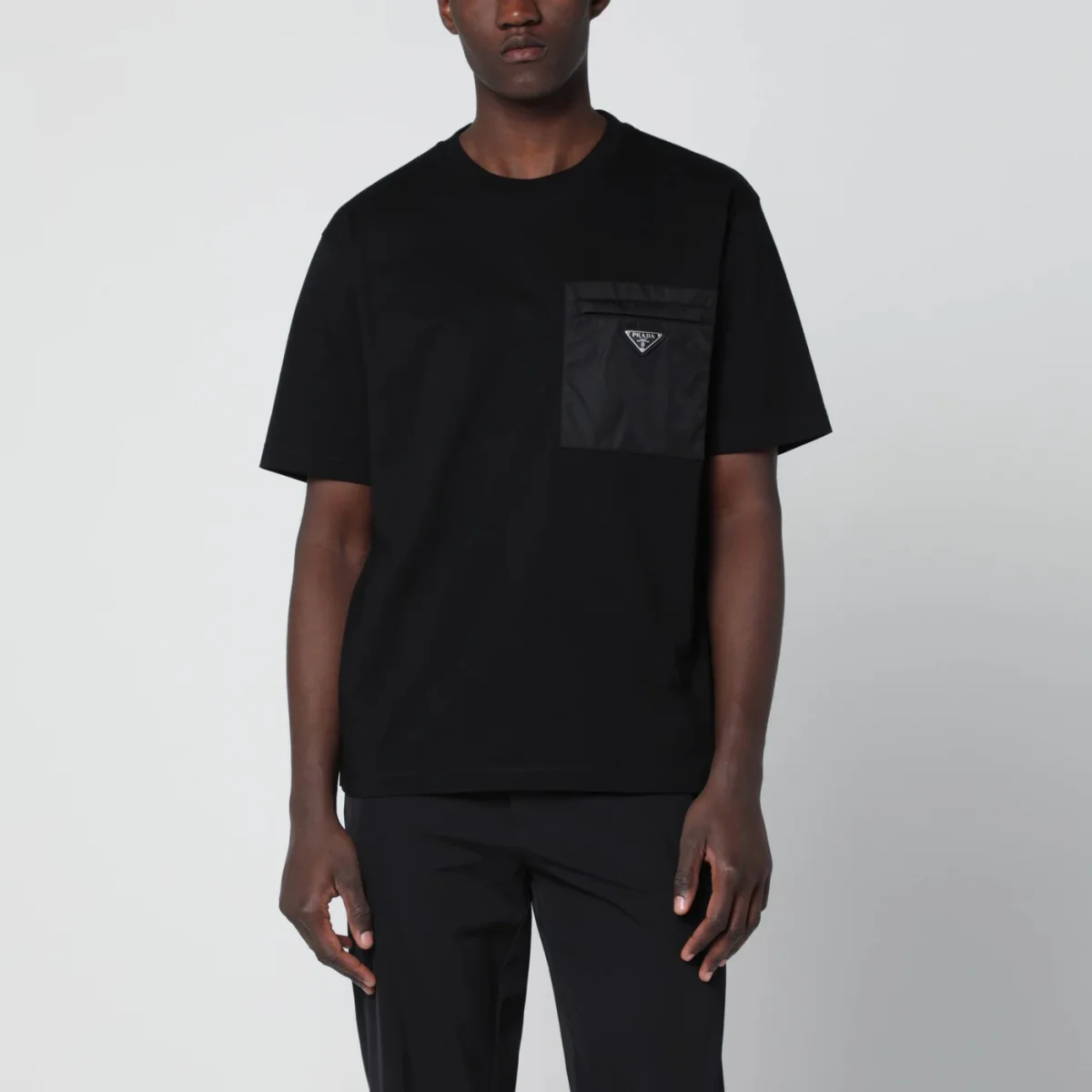 T-shirt girocollo di Prada in cotone nera• una tasca applicata sul petto con zip in Re-Nylon• manica corta• triangolo logo in metallo smaltato sul davanti• orlo dritto
