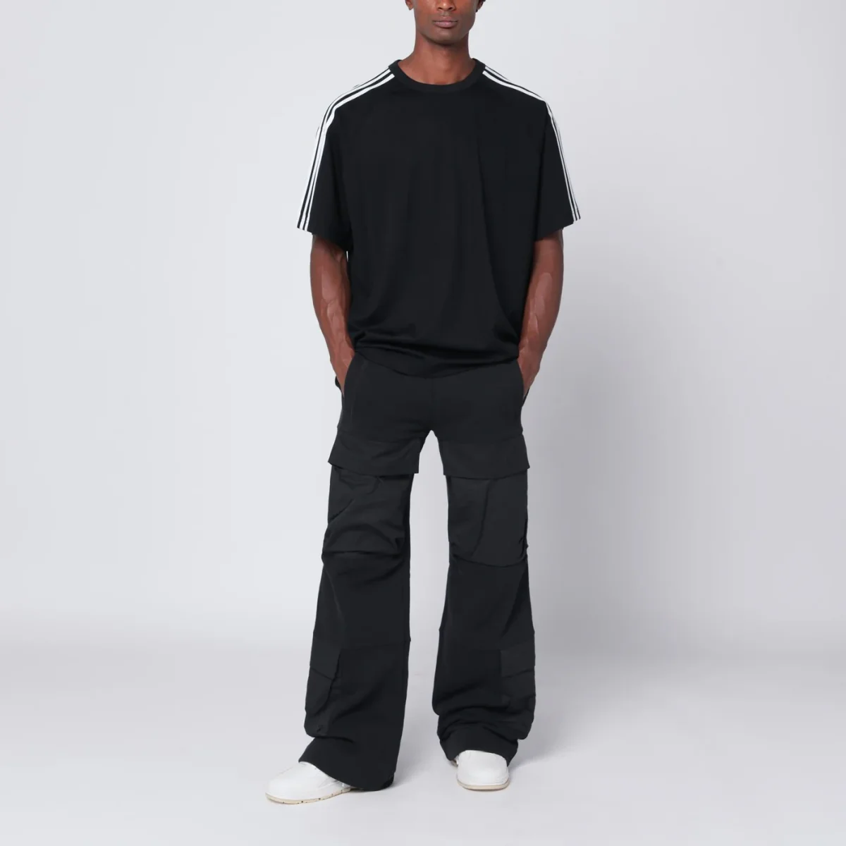 T-shirt di adidas Y-3 in misto lana e nylon nera, caratterizzata da girocollo a costine, maniche corte con bande bianche a contrasto e stampa logo tono su tono sul davanti.