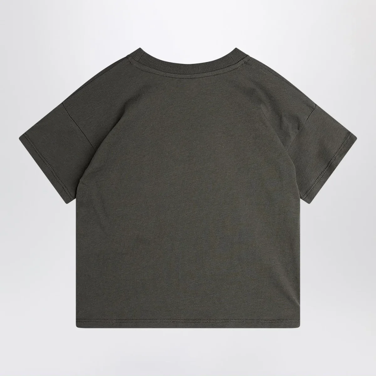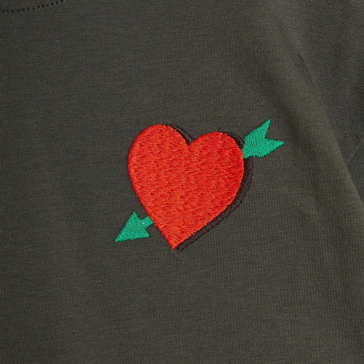 T-shirt di Mini Rodini in cotone organico nera slavata, caratterizzata da manica corta, girocollo a costine e cuore con freccia ricamato sul petto.