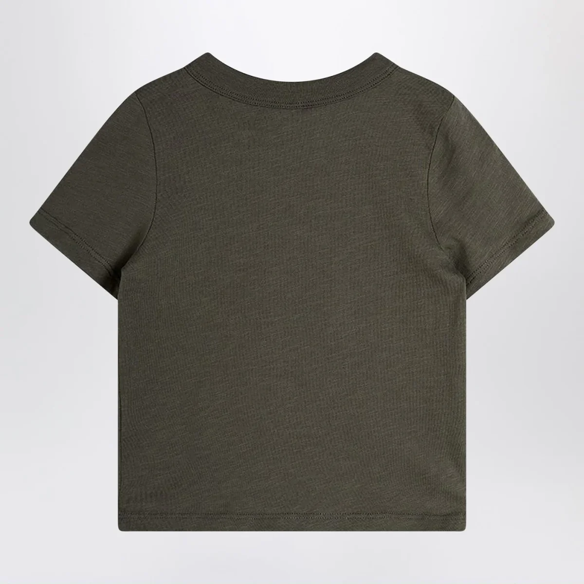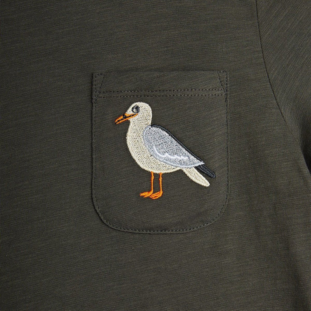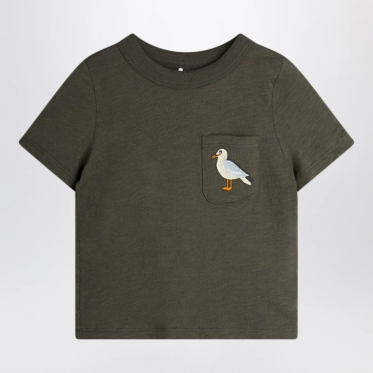 T-shirt girocollo di Mini Rodini in cotone organico nera slavata, caratterizzata da manica corta e una tasca applicata sul petto con ricamo gabbiano.
