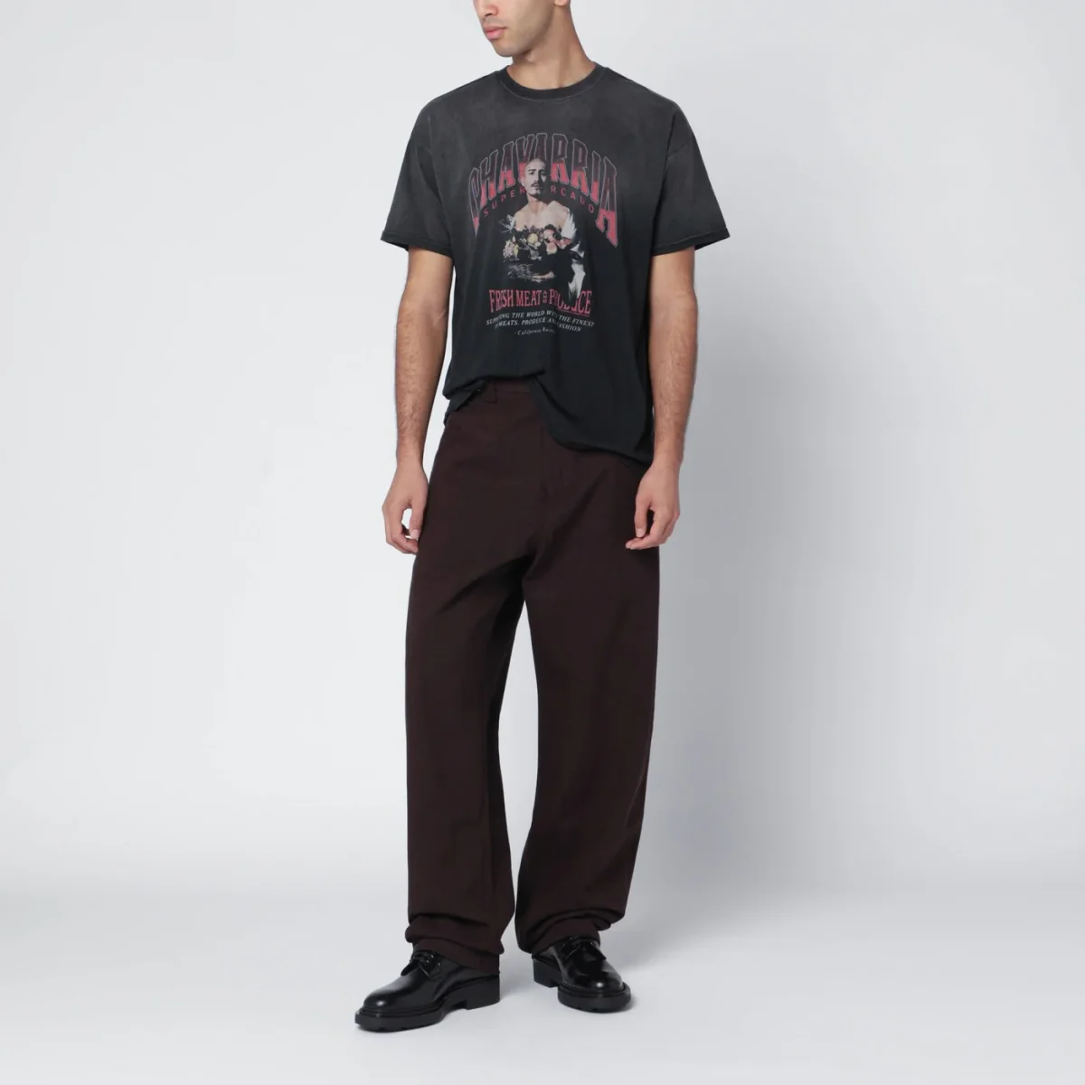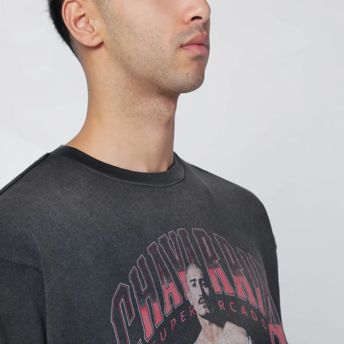 T-shirt di Willy Chavarria in cotone nera effetto vintage, caratterizzata da girocollo a costine, maniche corte, spalle scese, vestibilità ampia e grafica slavata sul petto.