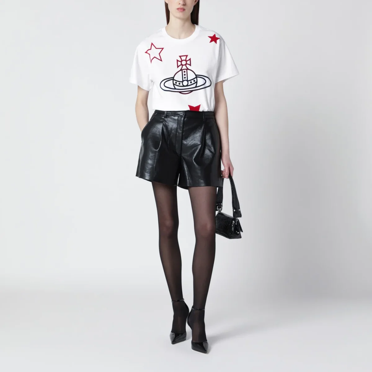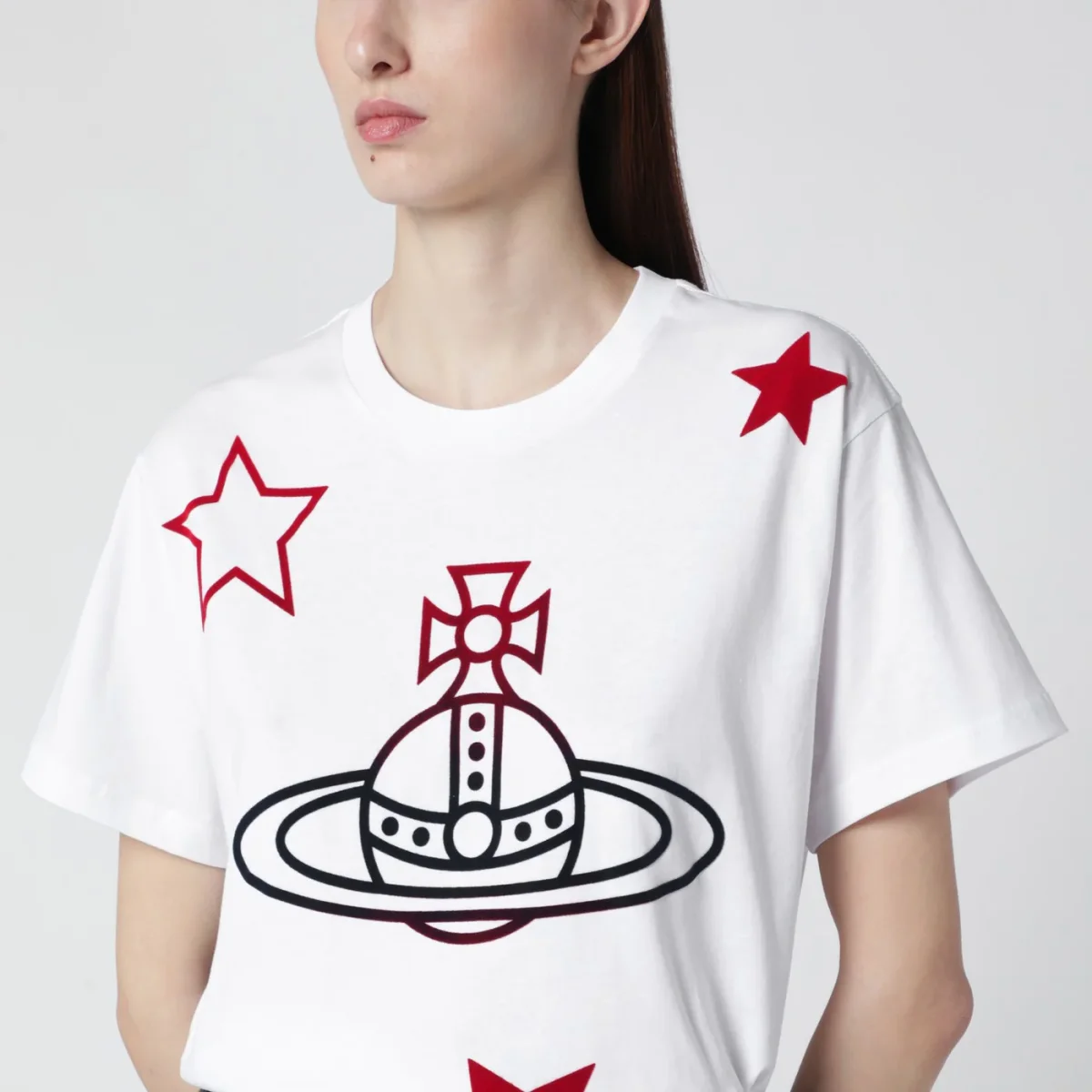 T-shirt di Vivienne Westwood in cotone bianca, caratterizzata da girocollo a costine, maniche corte e stelle e logo Orb sul davanti a contrasto.