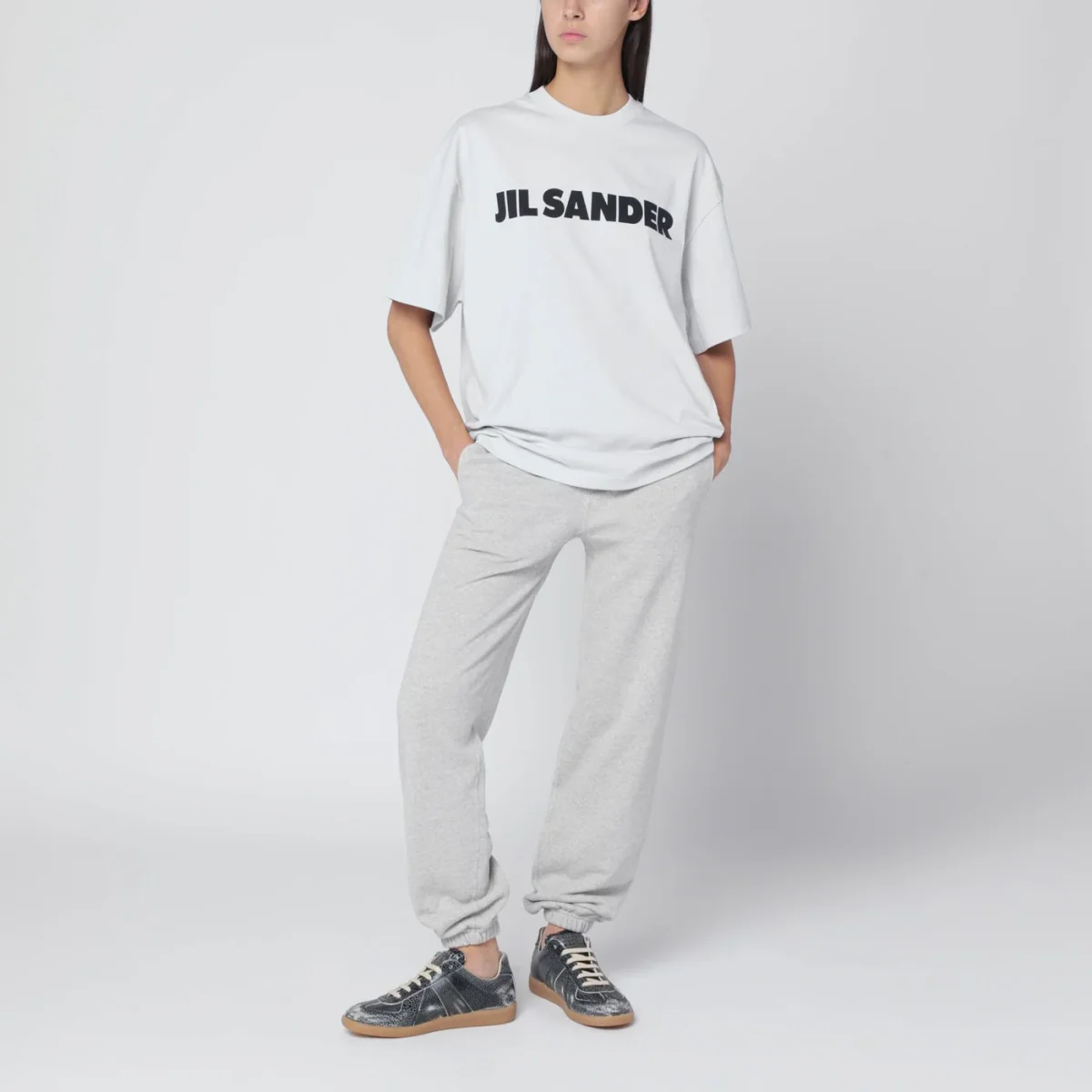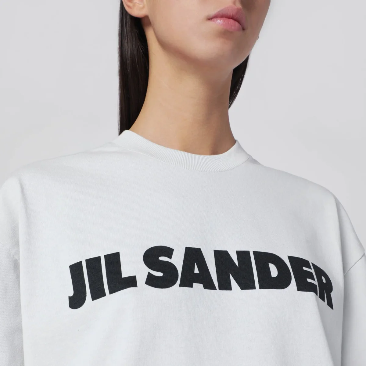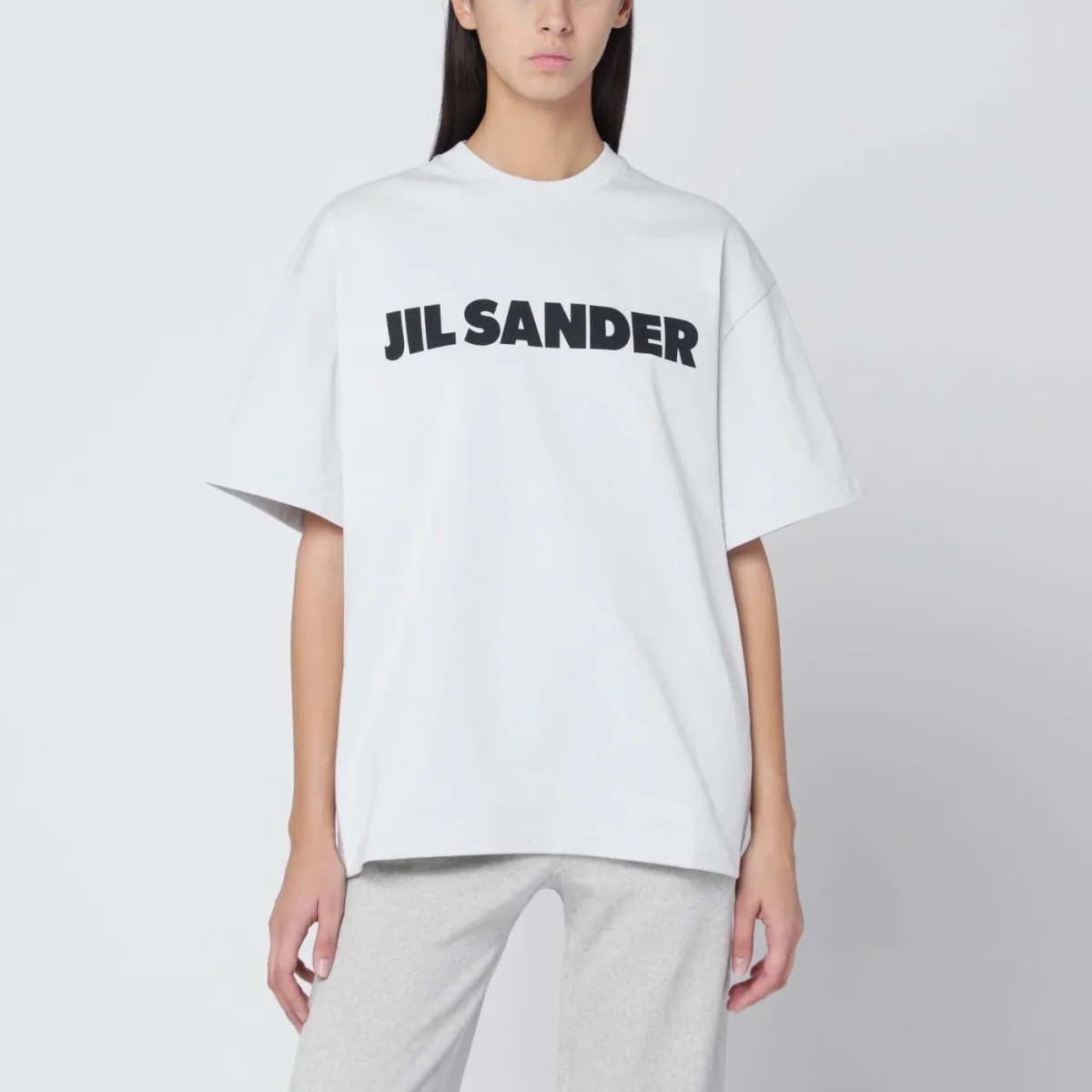 T-shirt di Jil Sander in cotone grigia chiara, caratterizzata da maniche corte ampie, girocollo a costine, stampa con logo lettering sul davanti a contrasto e vestibilità oversize.