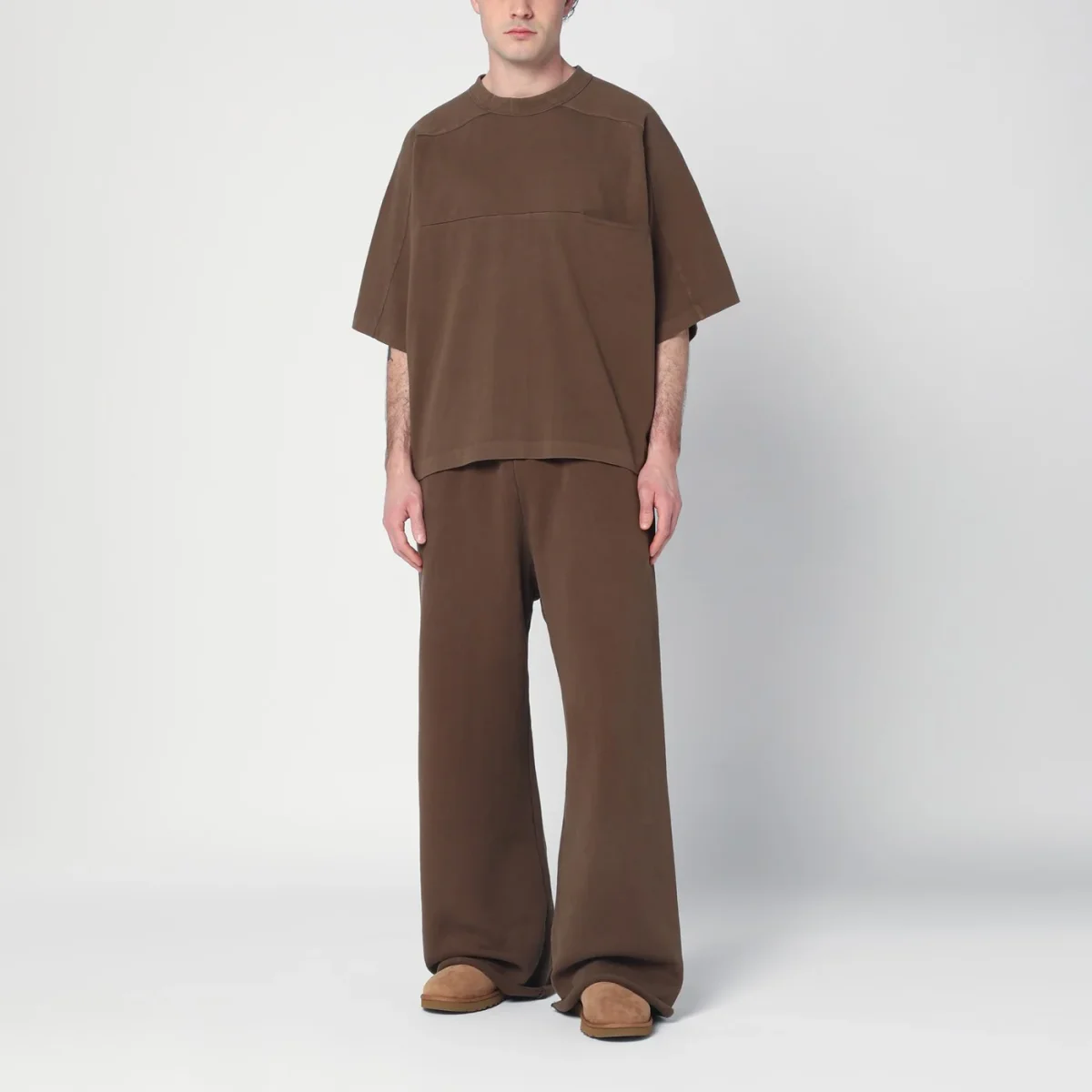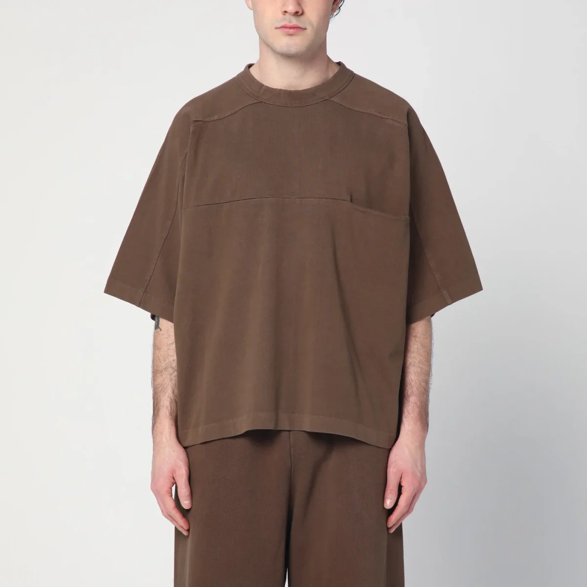 T-shirt girocollo oversize di Entire Studios in jersey di cotone marrone, caratterizzata da manica corta ampia e una tasca sul petto.