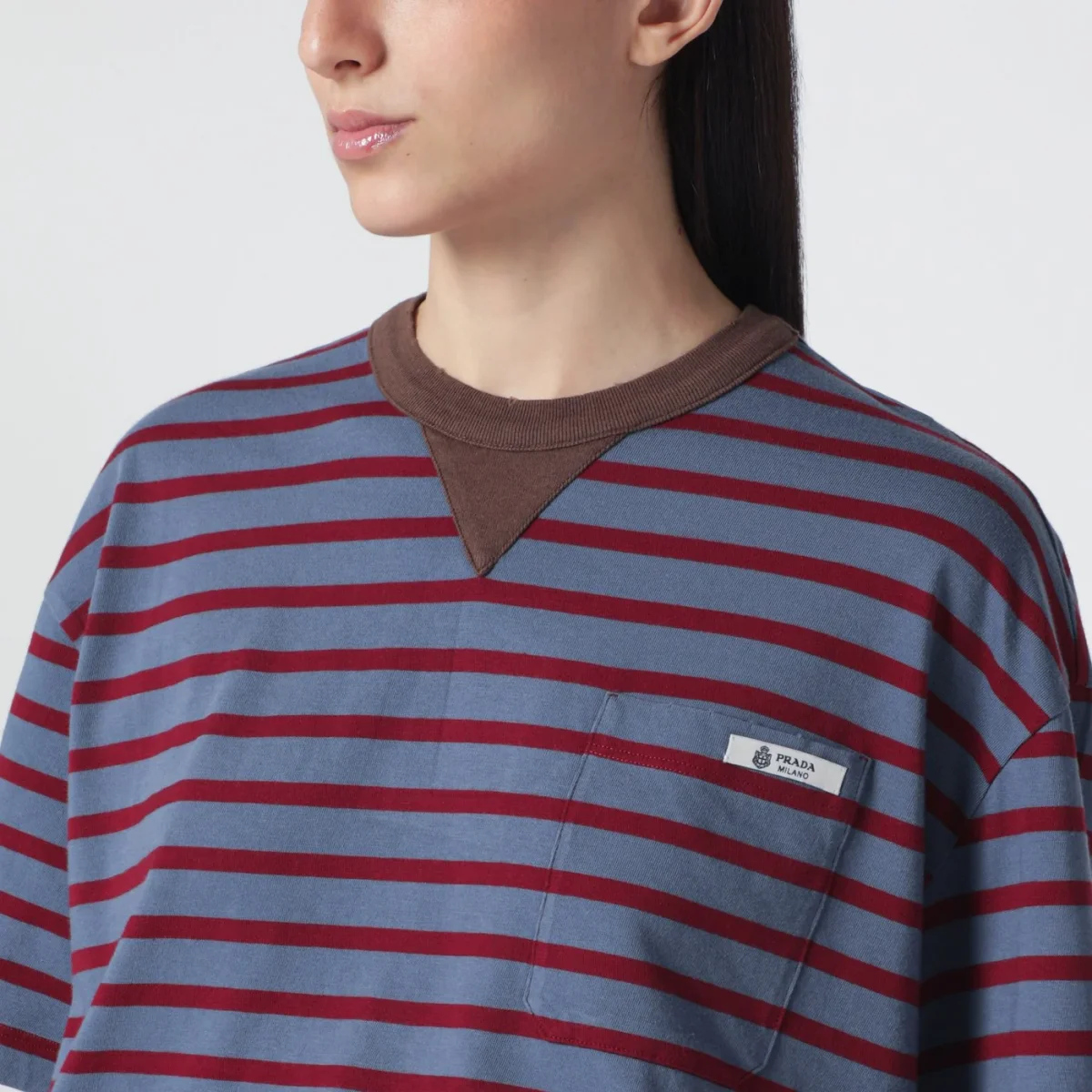 T-shirt di Prada in jersey di cotone a righe avio e amaranto• vestibilità oversize• girocollo a costine• maniche corte• una tasca applicata sul davanti con etichetta logo