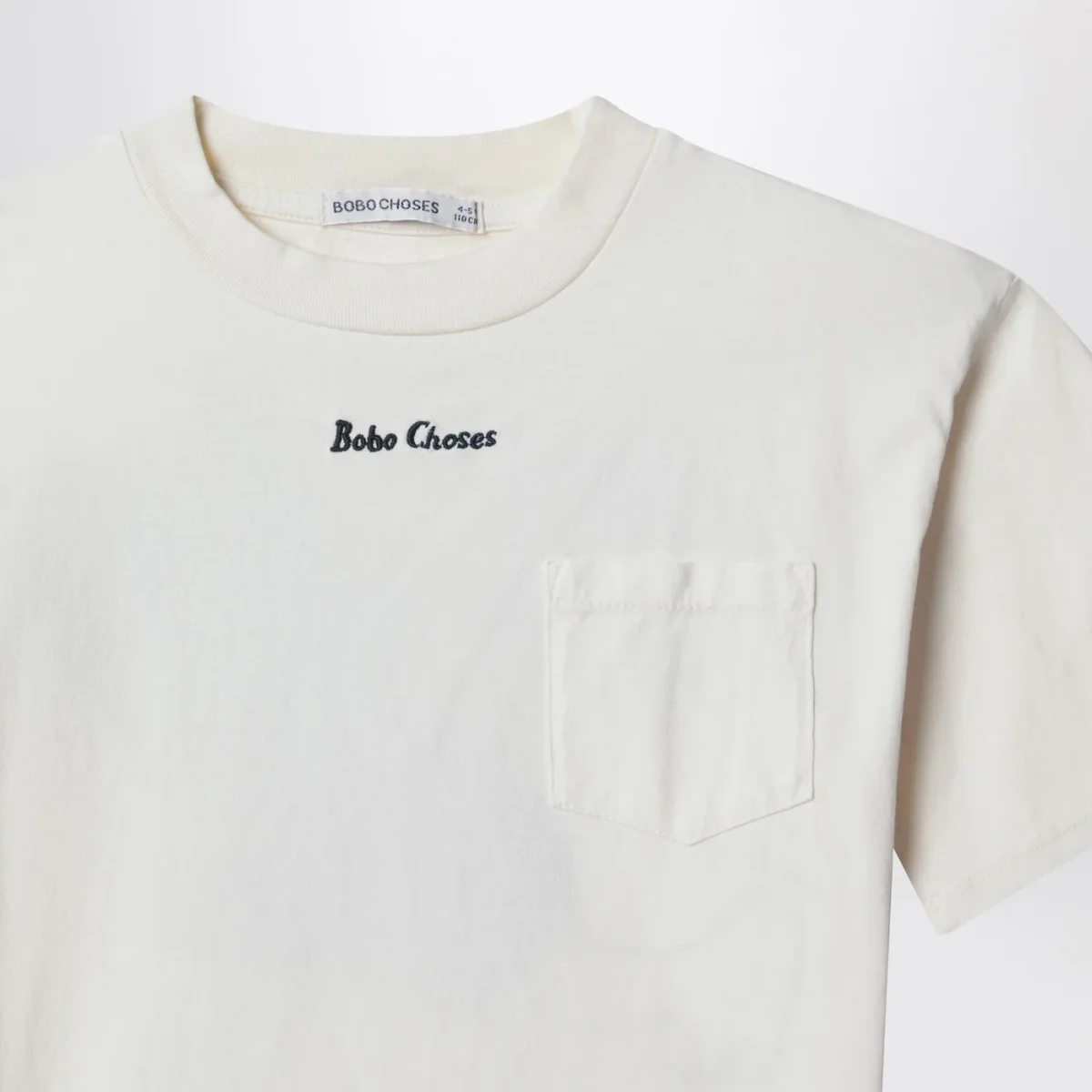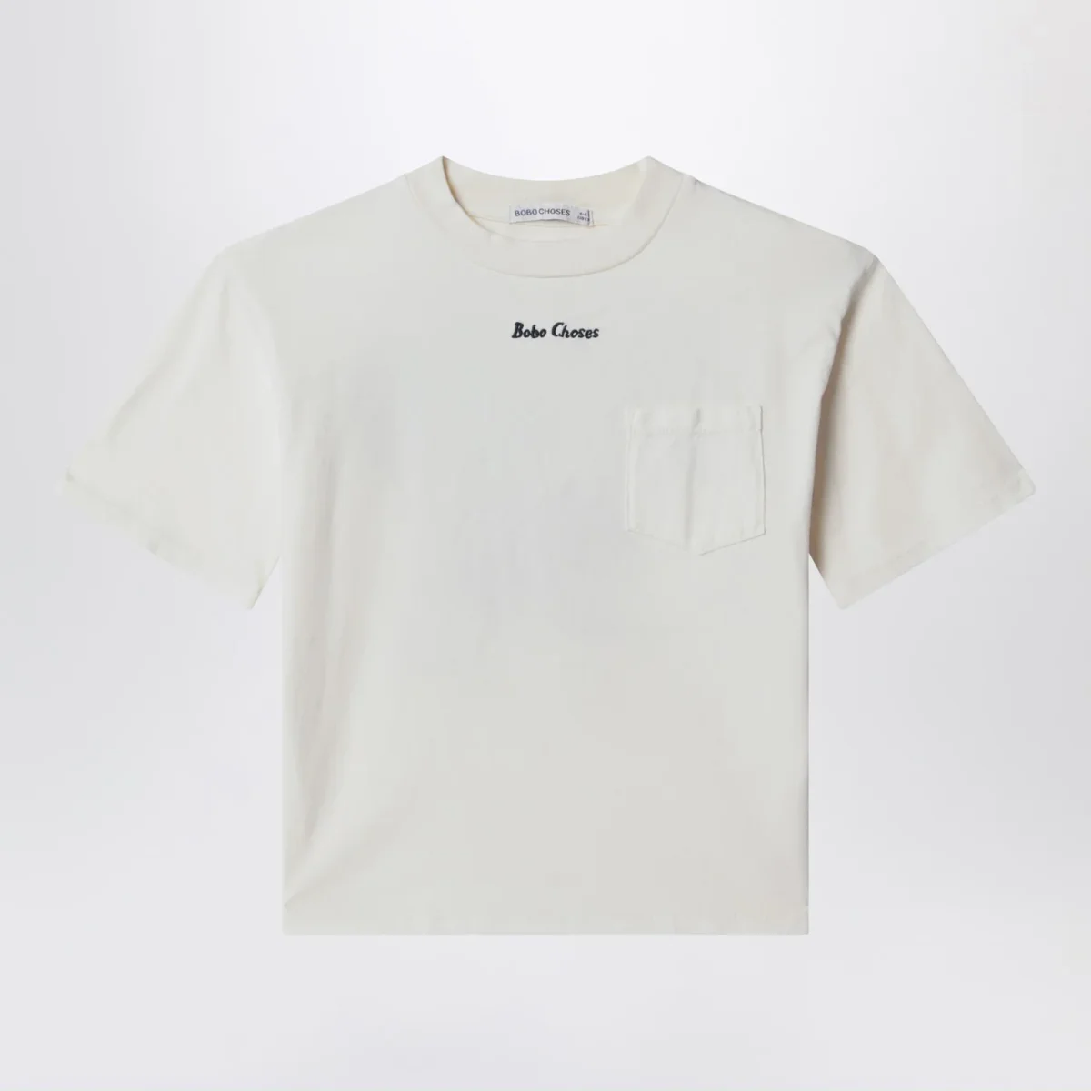 T-shirt di Bobo Choses in cotone color panna• maniche corte• un taschino applicato sul petto• ricamo logo lettering a contrasto sul davanti• stampa posteriore• vestibilità ampia• scollo rotondo