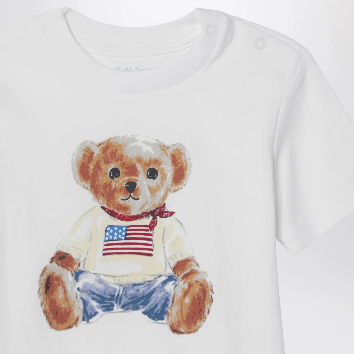T-shirt di Polo Ralph Lauren in cotone bianca, caratterizzata da maniche corte di cui una con logo lettering, stampa Polo Bear sul davanti e girocollo a costine.