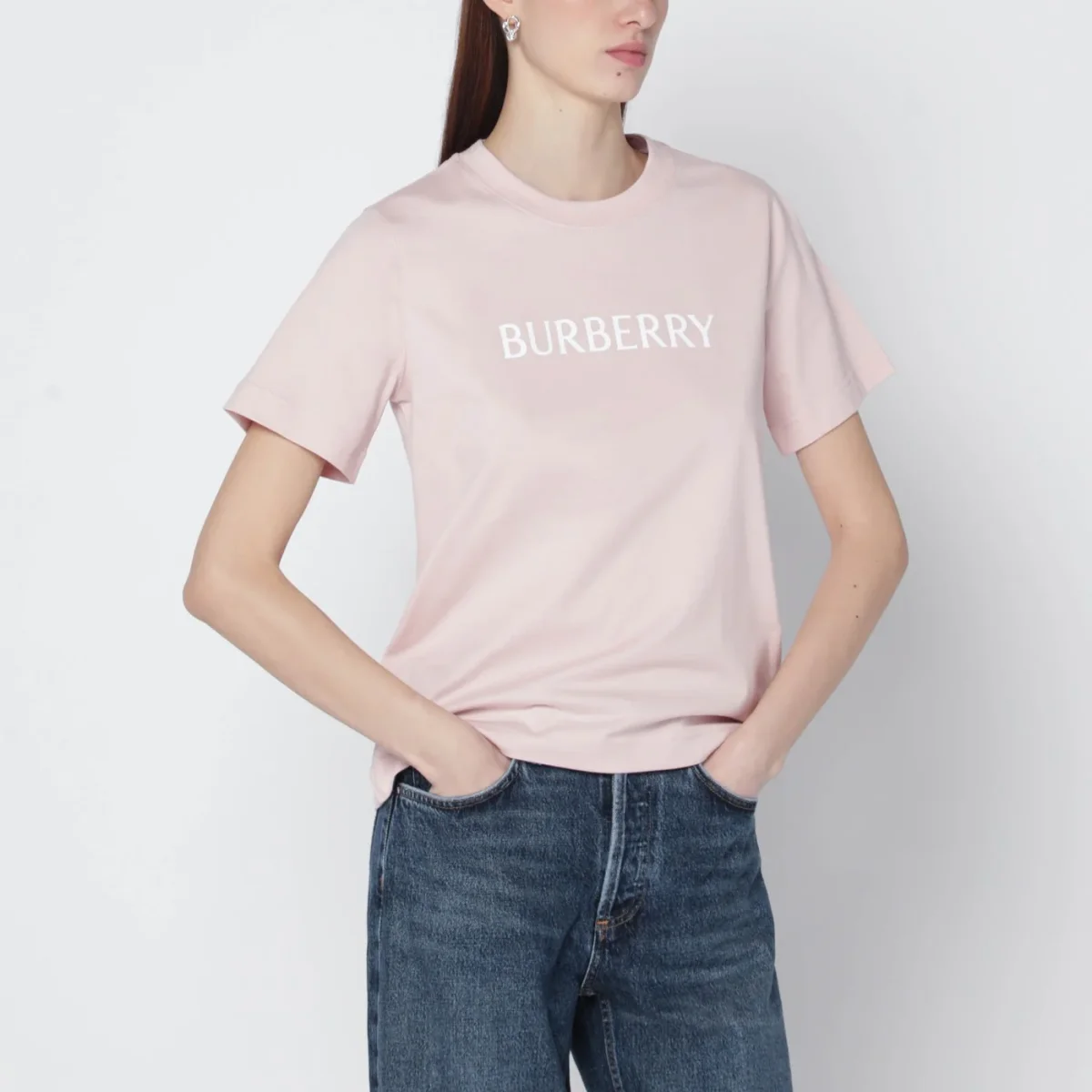 T-shirt di Burberry in cotone rosa chiara• maniche corte• girocollo a costine• stampa logo lettering sul petto a contrasto