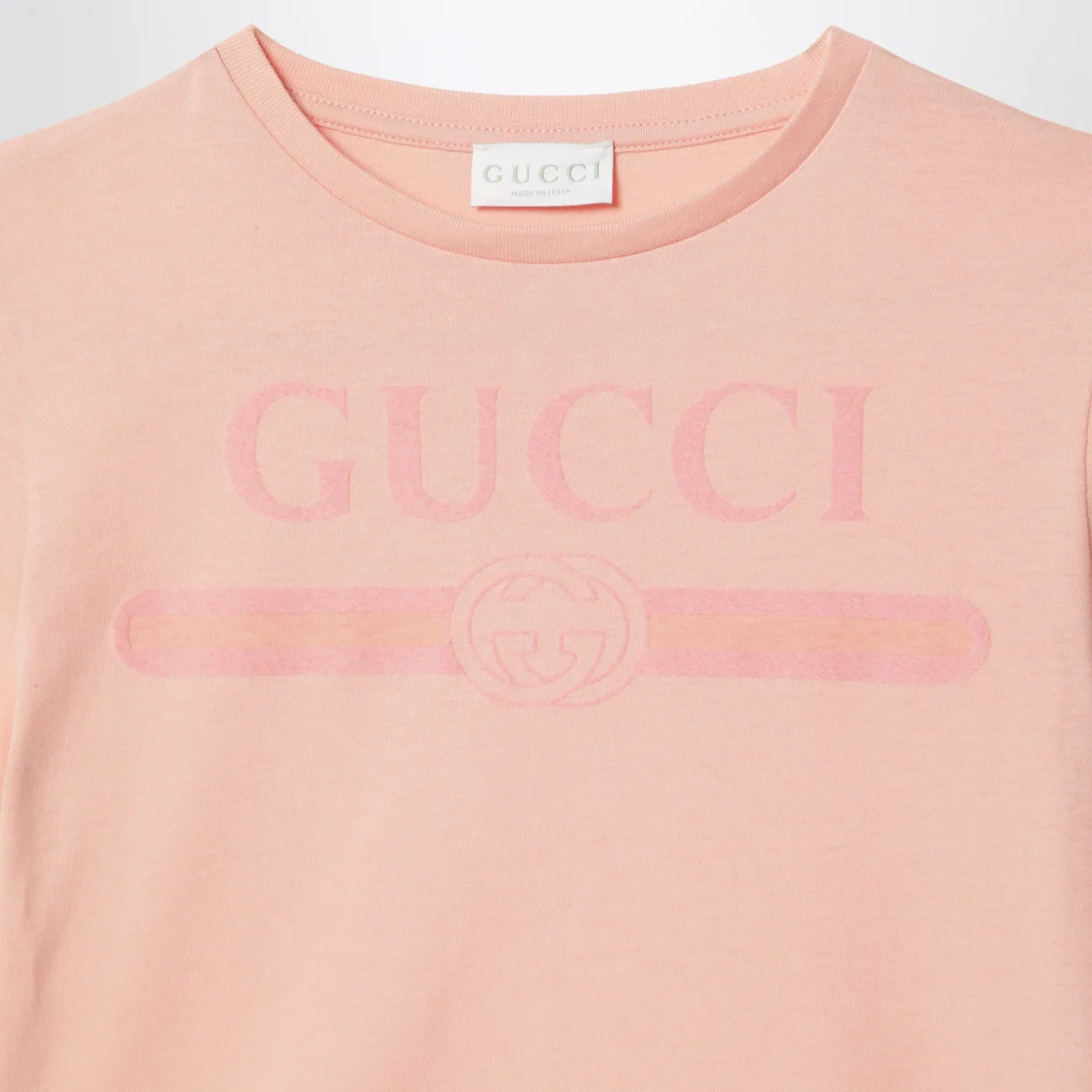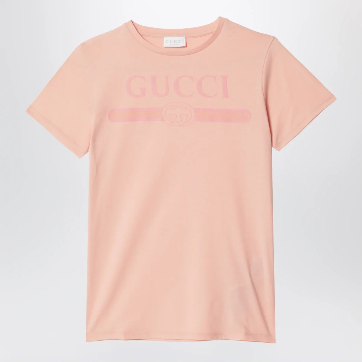 T-shirt girocollo di Gucci in cotone• Colore: Rosa• Maniche corte• Stampa logo lettering sul davanti