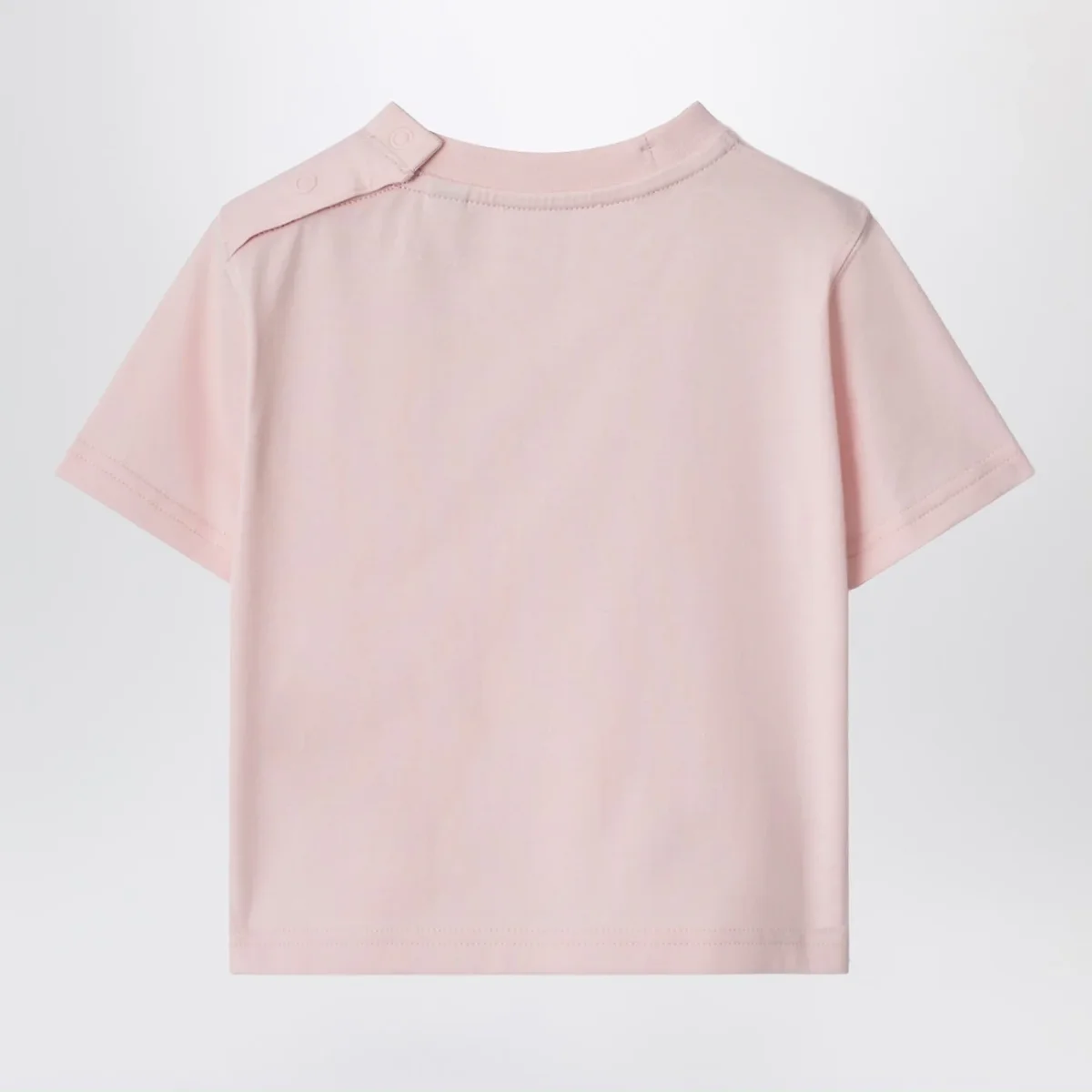 T-shirt di Burberry in jersey di cotone rosa chiara• girocollo a costine• maniche corte• bottoncini sulla spalla• stampa con orsetto Thomas con impermeabile• logo lettering a contrasto sul petto