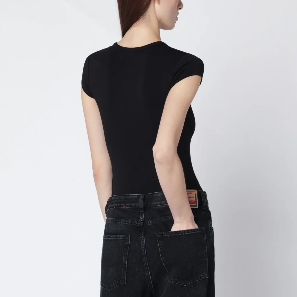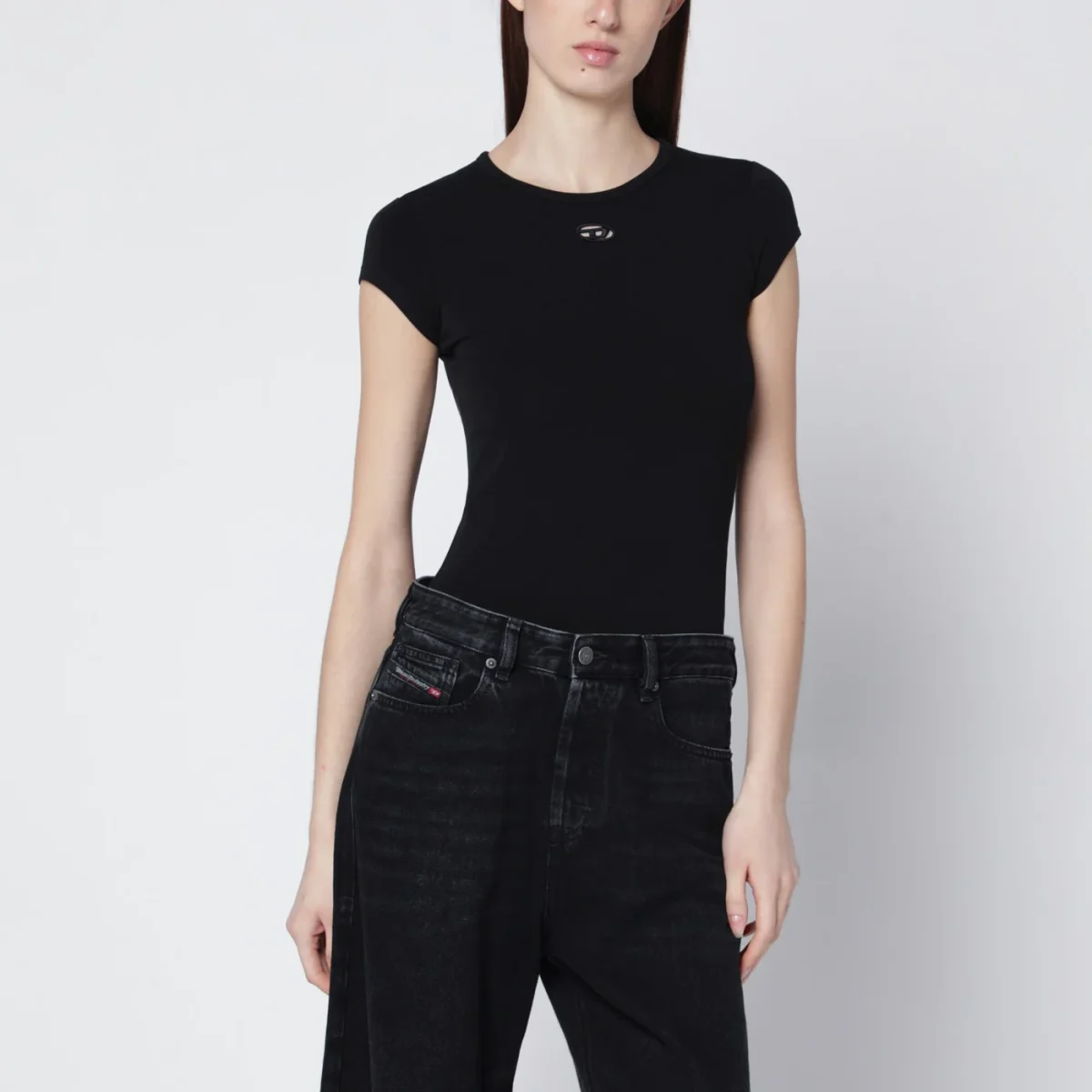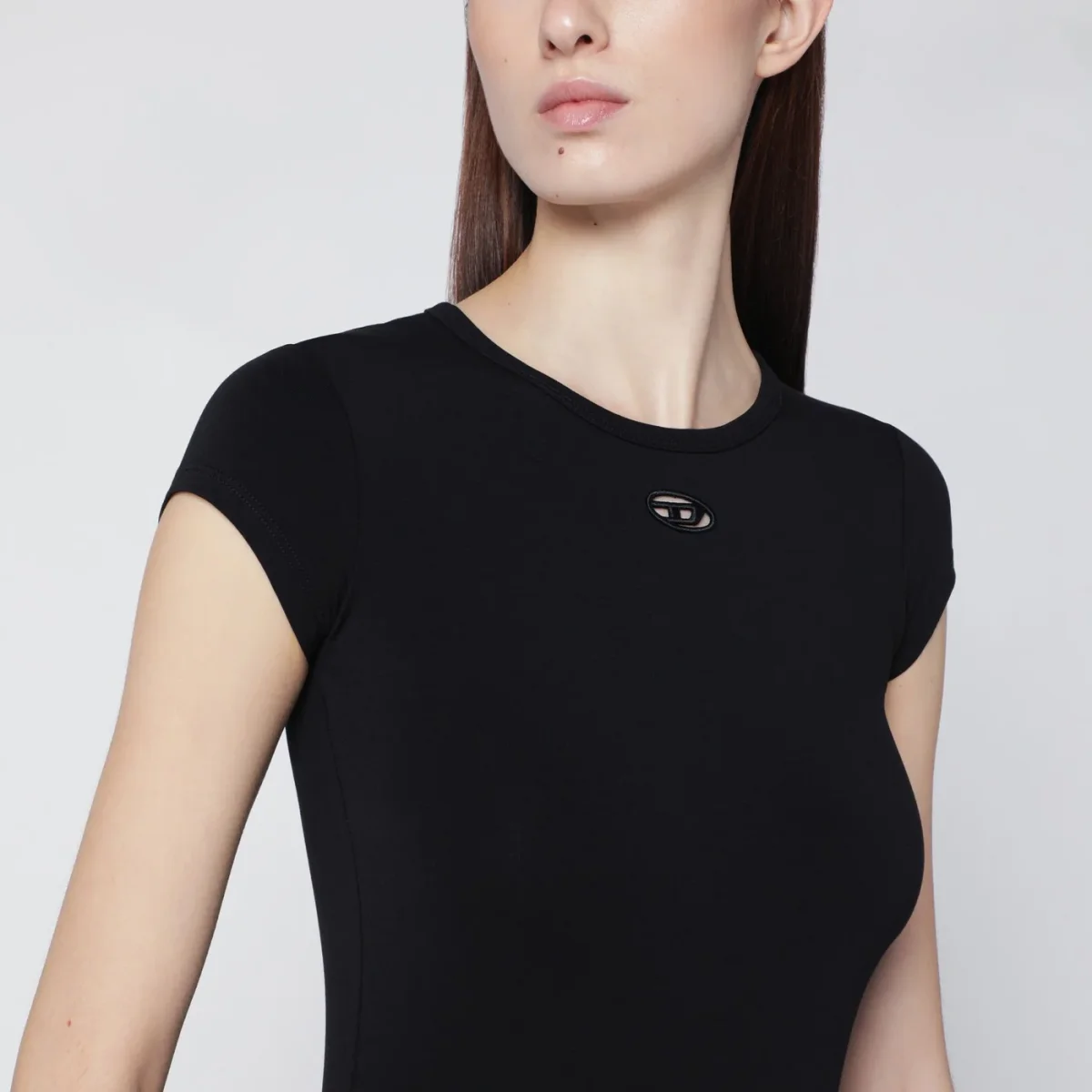 T-shirt di Diesel in misto cotone stretch aderente nera• girocollo a costine• maniche corte• logo Oval D laser-cut sul petto