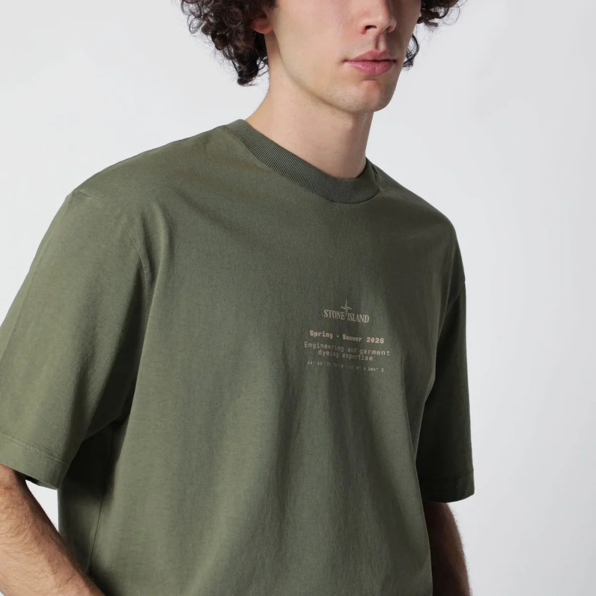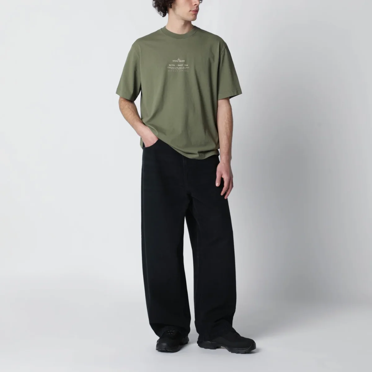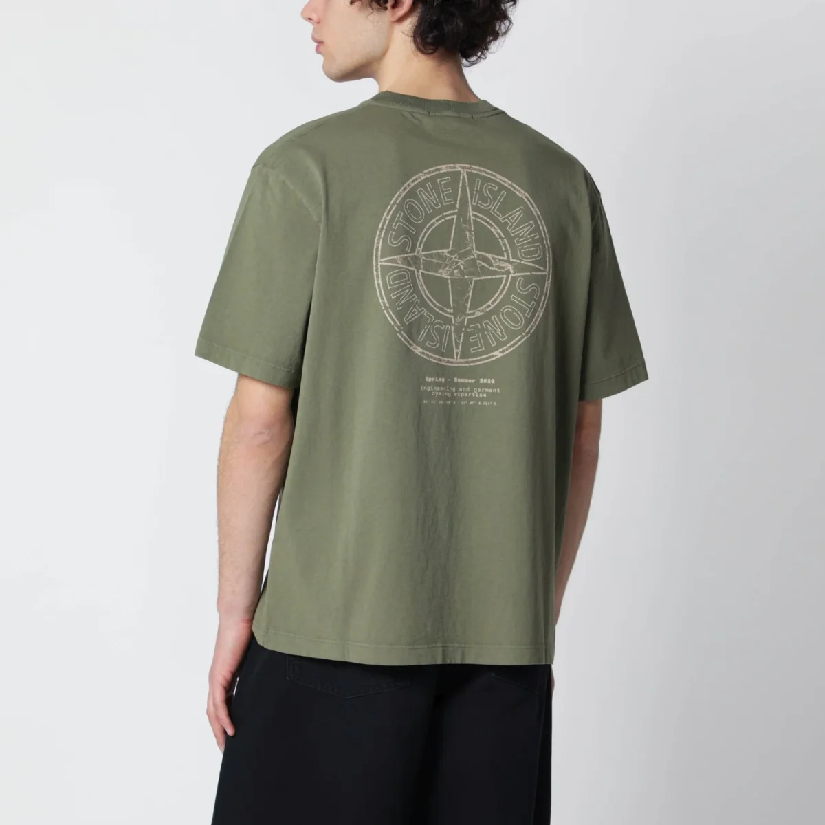 T-shirt di Stone Island in jersey di cotone verde militare• girocollo a costine• maniche corte• stampa logo sul davanti e sul retro effetto invecchiato• vestibilità regolare