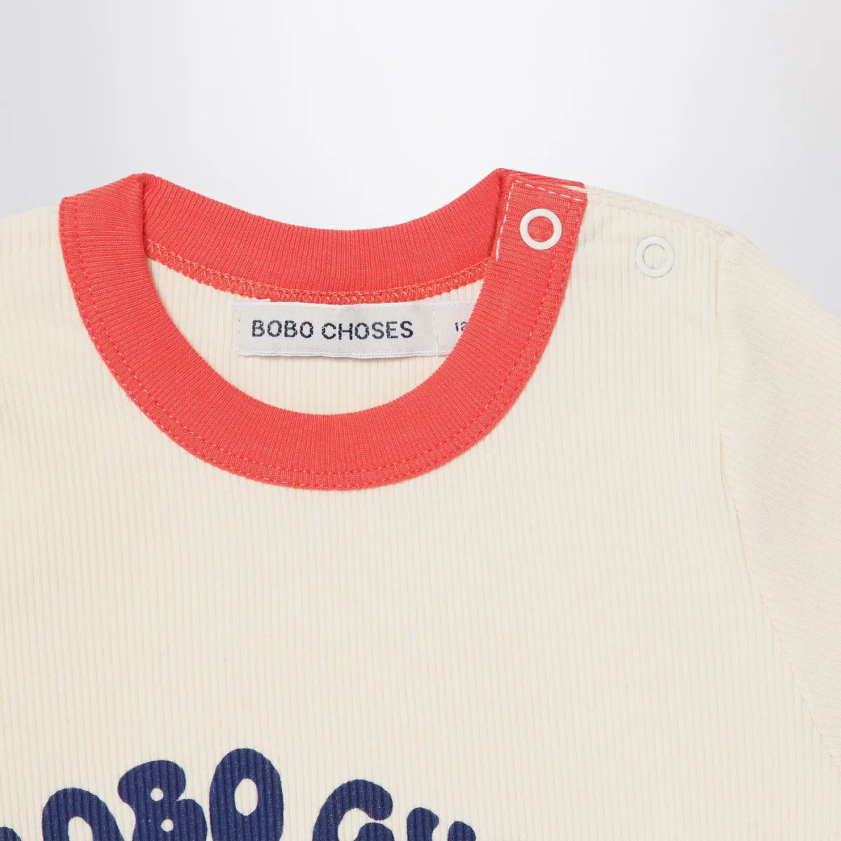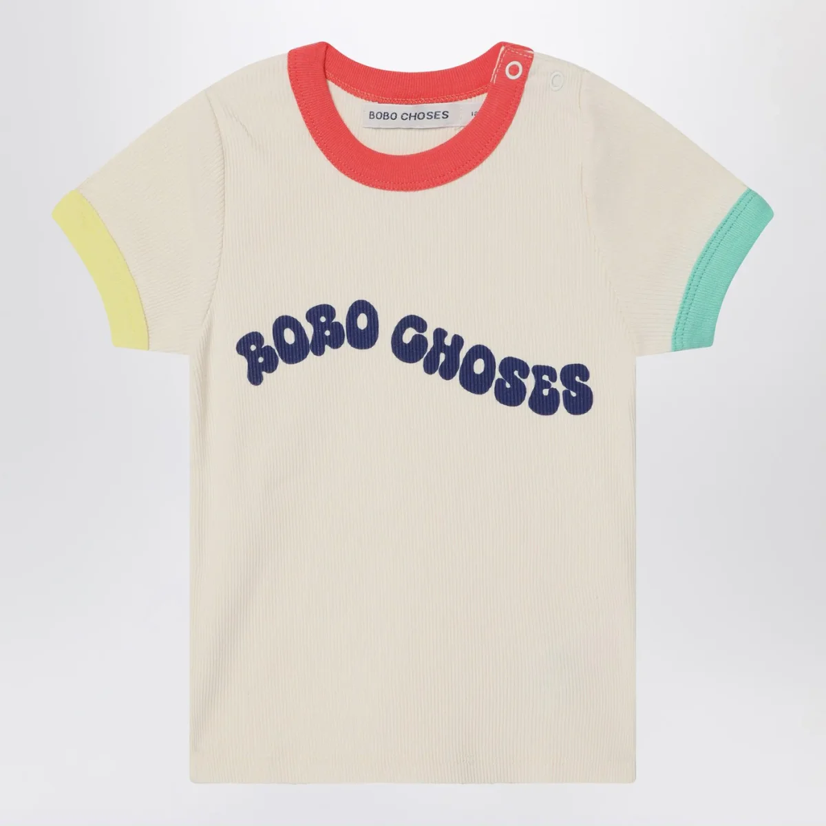 T-shirt girocollo di Bobo Choses in cotone organico avorio, caratterizzata da manica corta, bottoncini automatici sulla spalla, logo lettering a contrasto sul davanti, design costine e bordi colorati.