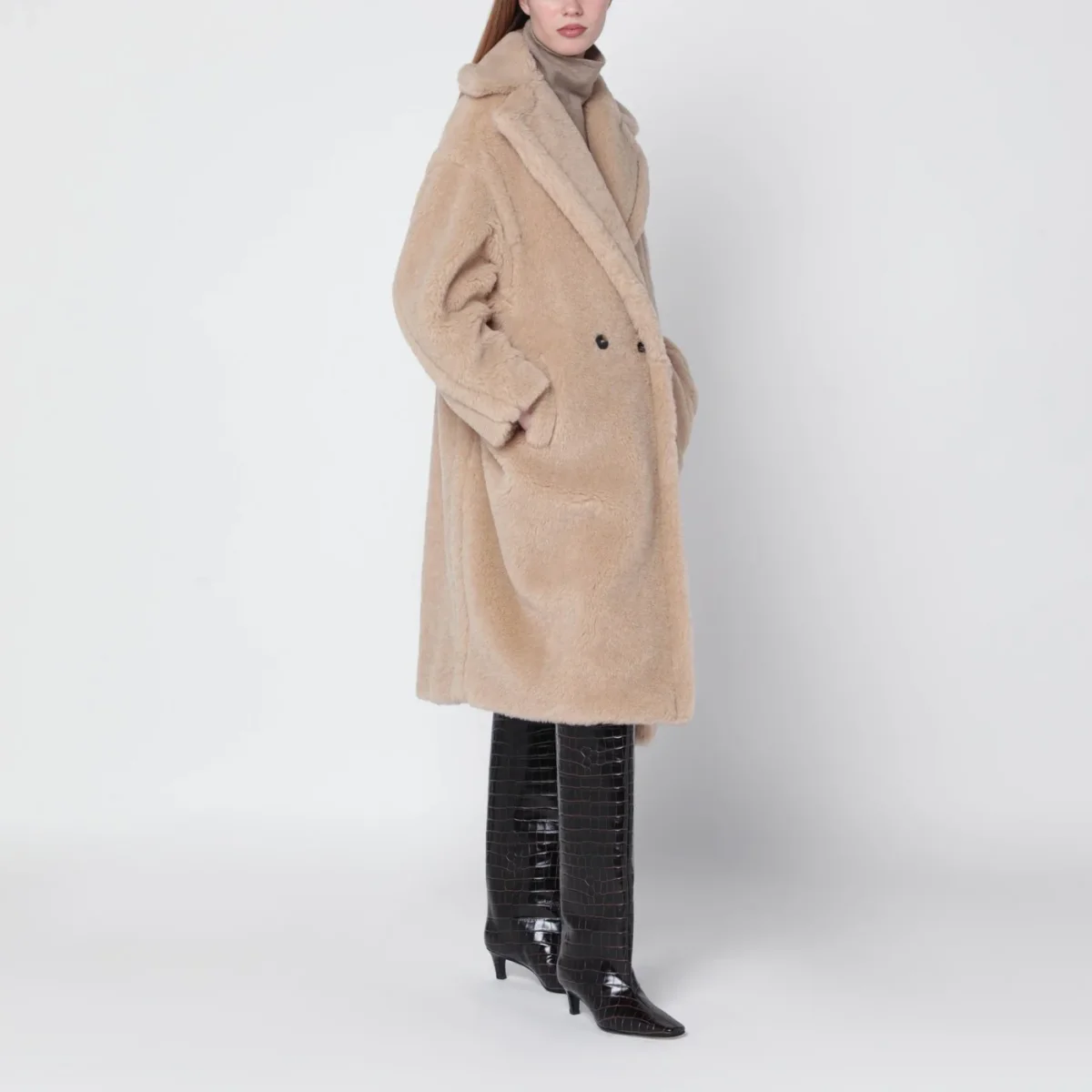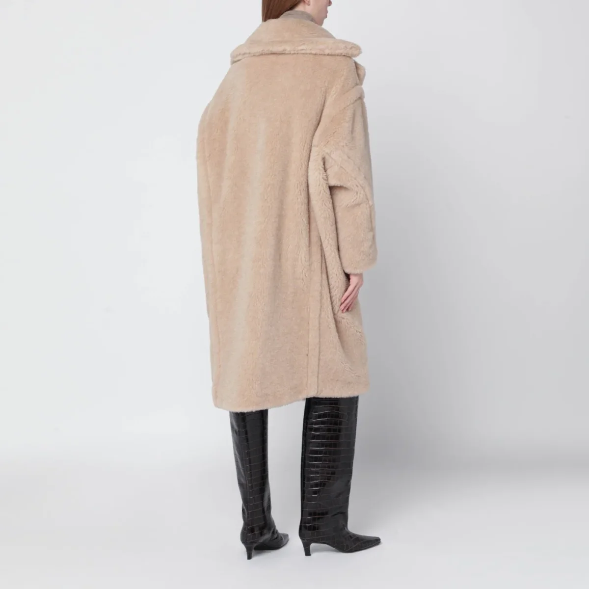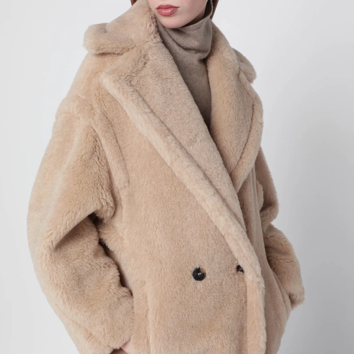 Cappotto Teddy di Max Mara in alpaca e lana su base di seta beige chiaro• revers ampio• manica lunga• chiusura doppiopetto frontale• due tasche a filetto laterali• vestibilità over