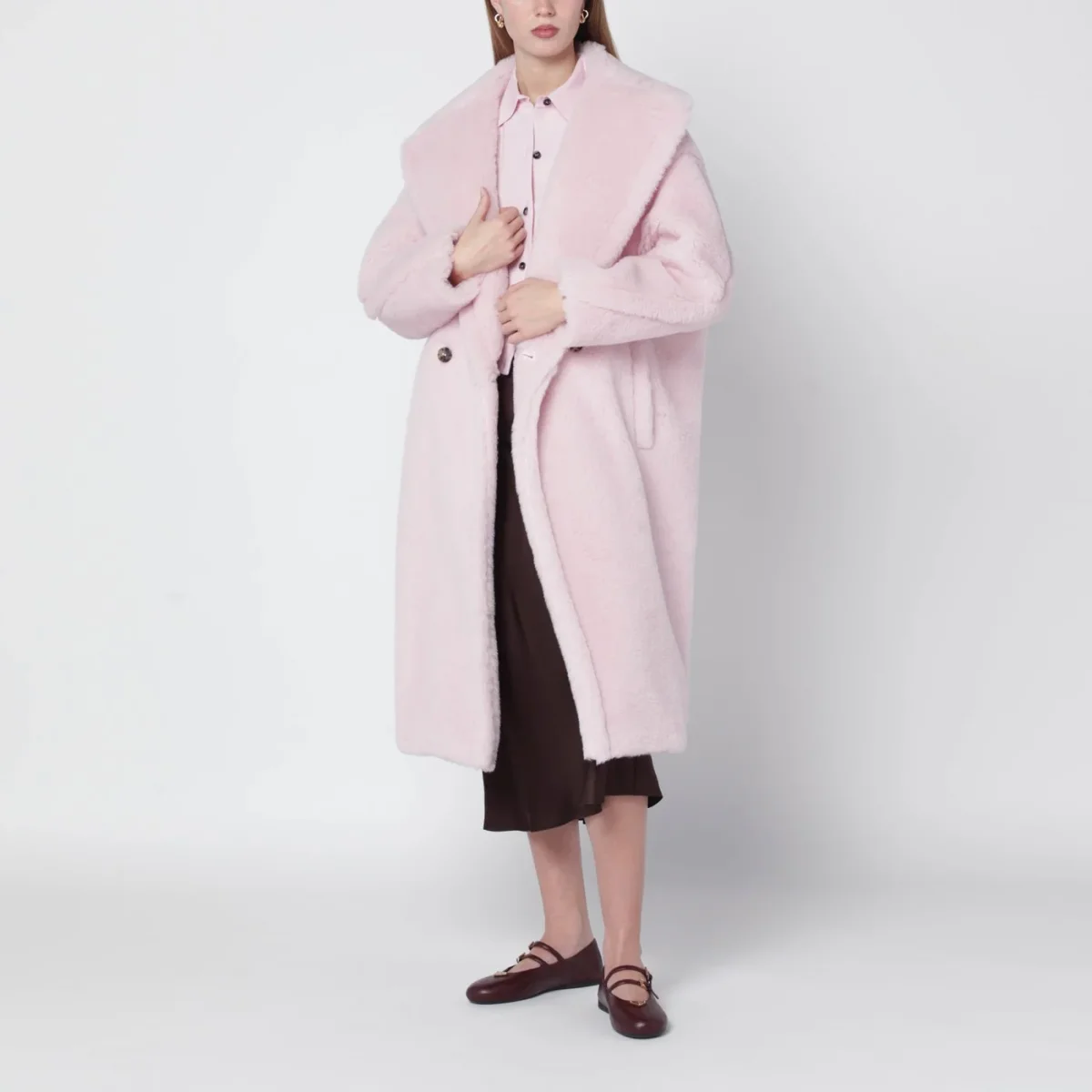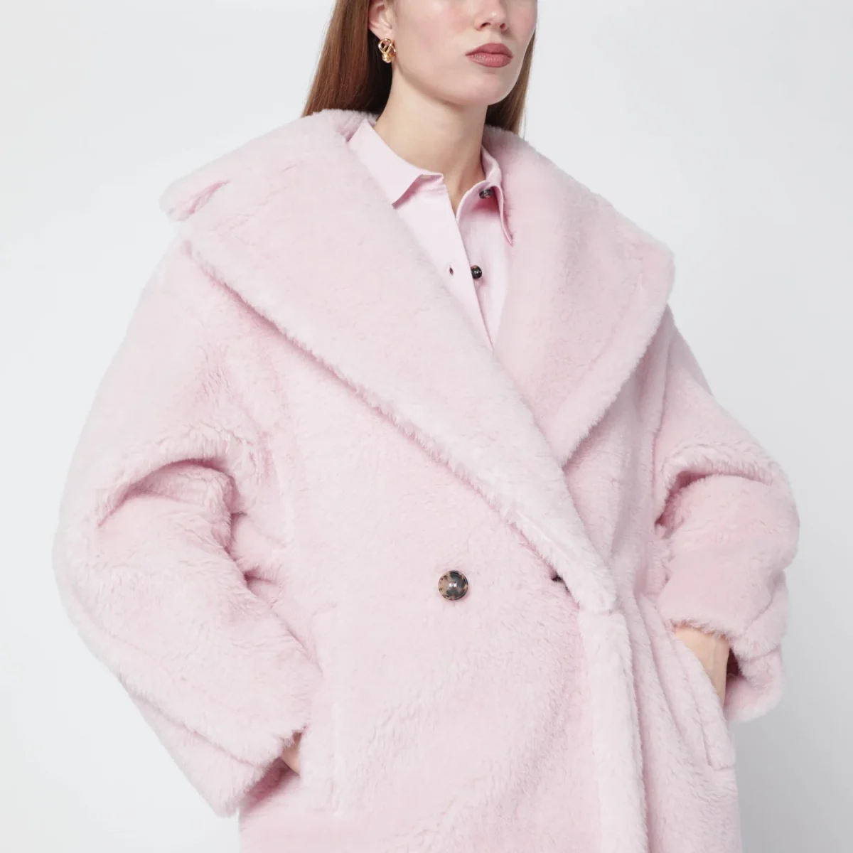 Cappotto Teddy di Max Mara in alpaca e lana su base di seta rosa chiaro• revers ampio• manica lunga• chiusura doppiopetto frontale• due tasche a filetto laterali• vestibilità over