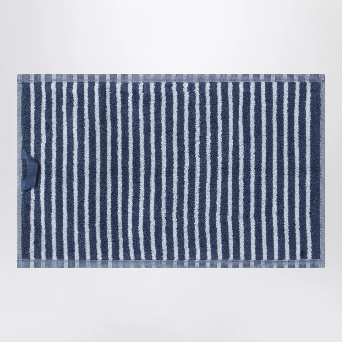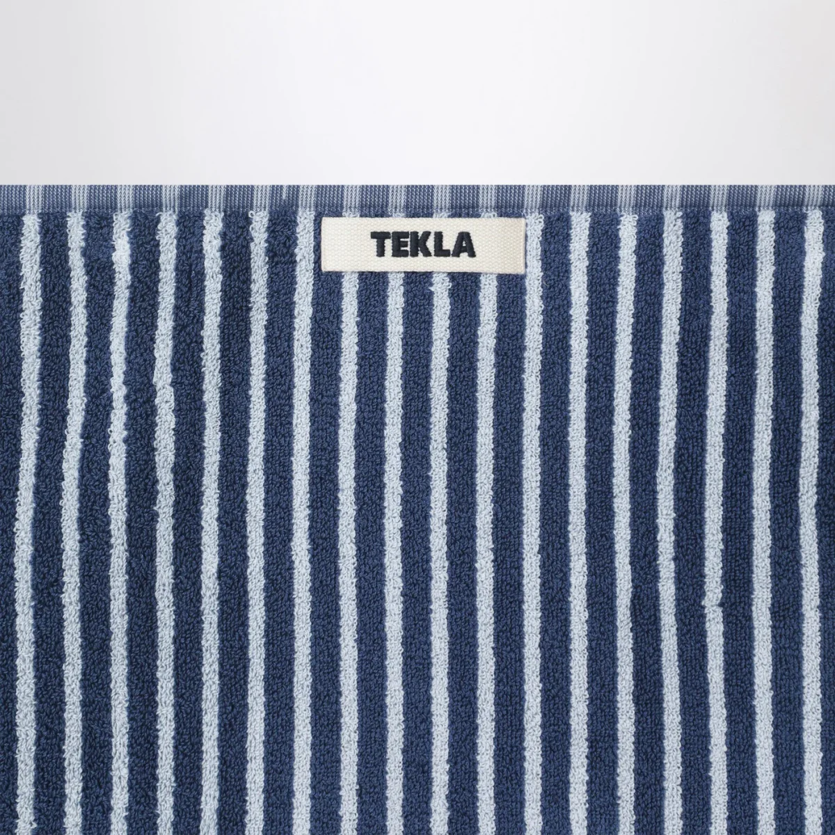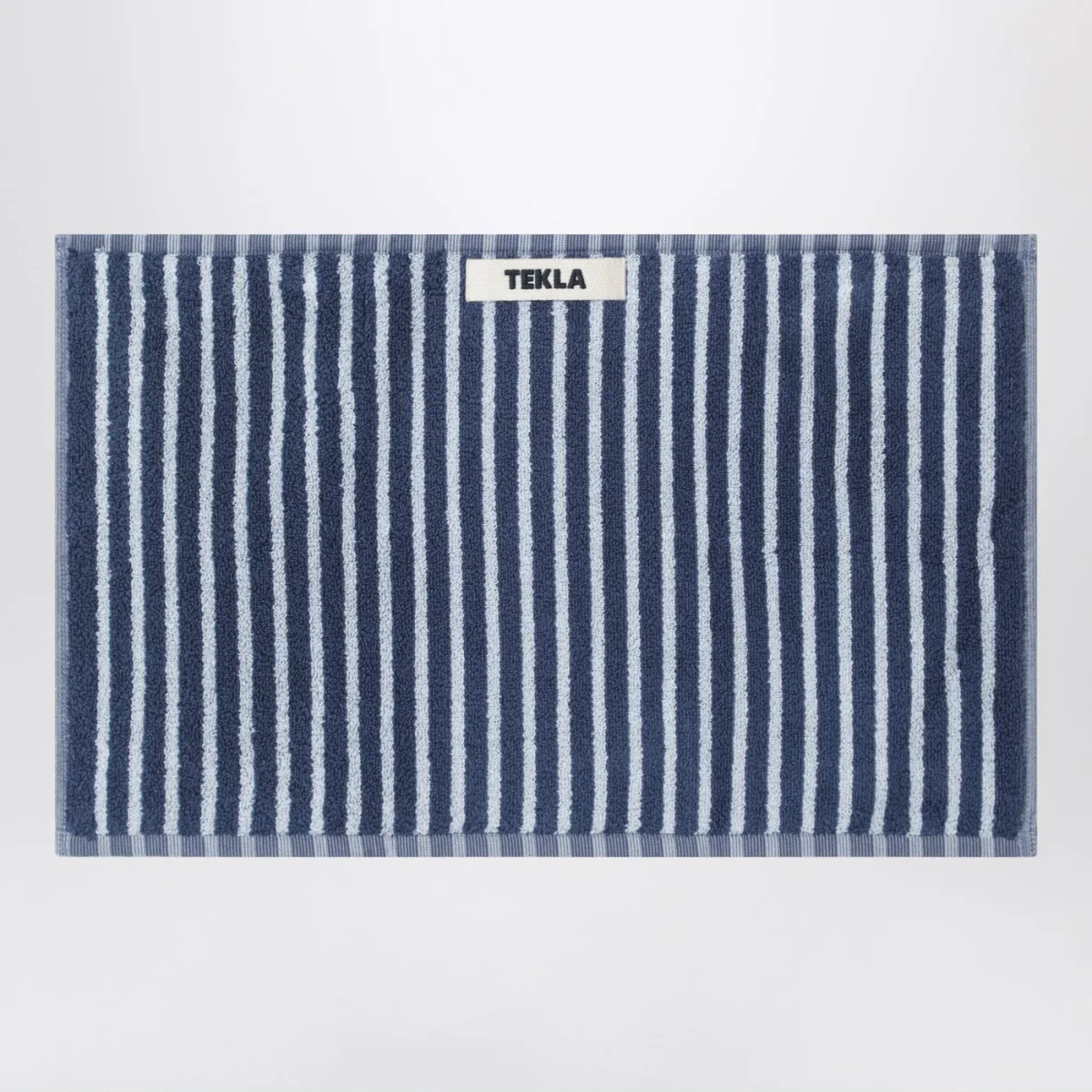 Telo bagno per ospiti di Tekla in spugna di cotone blu a righe azzurre, caratterizzato da anello per appendere e patch logo lettering sul lato.