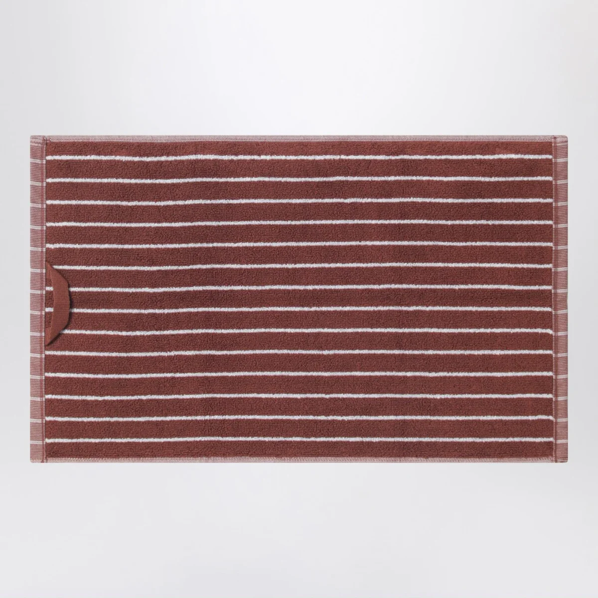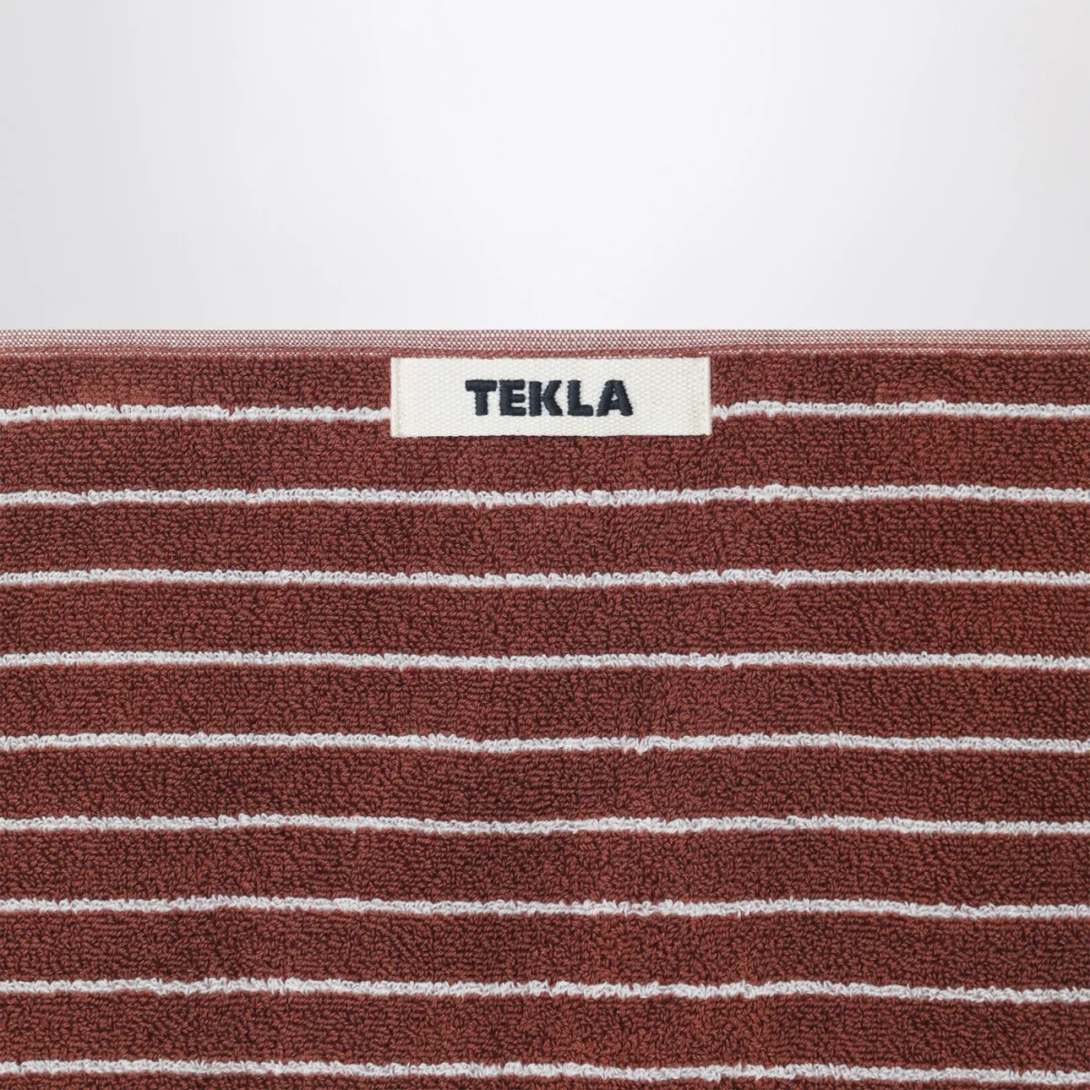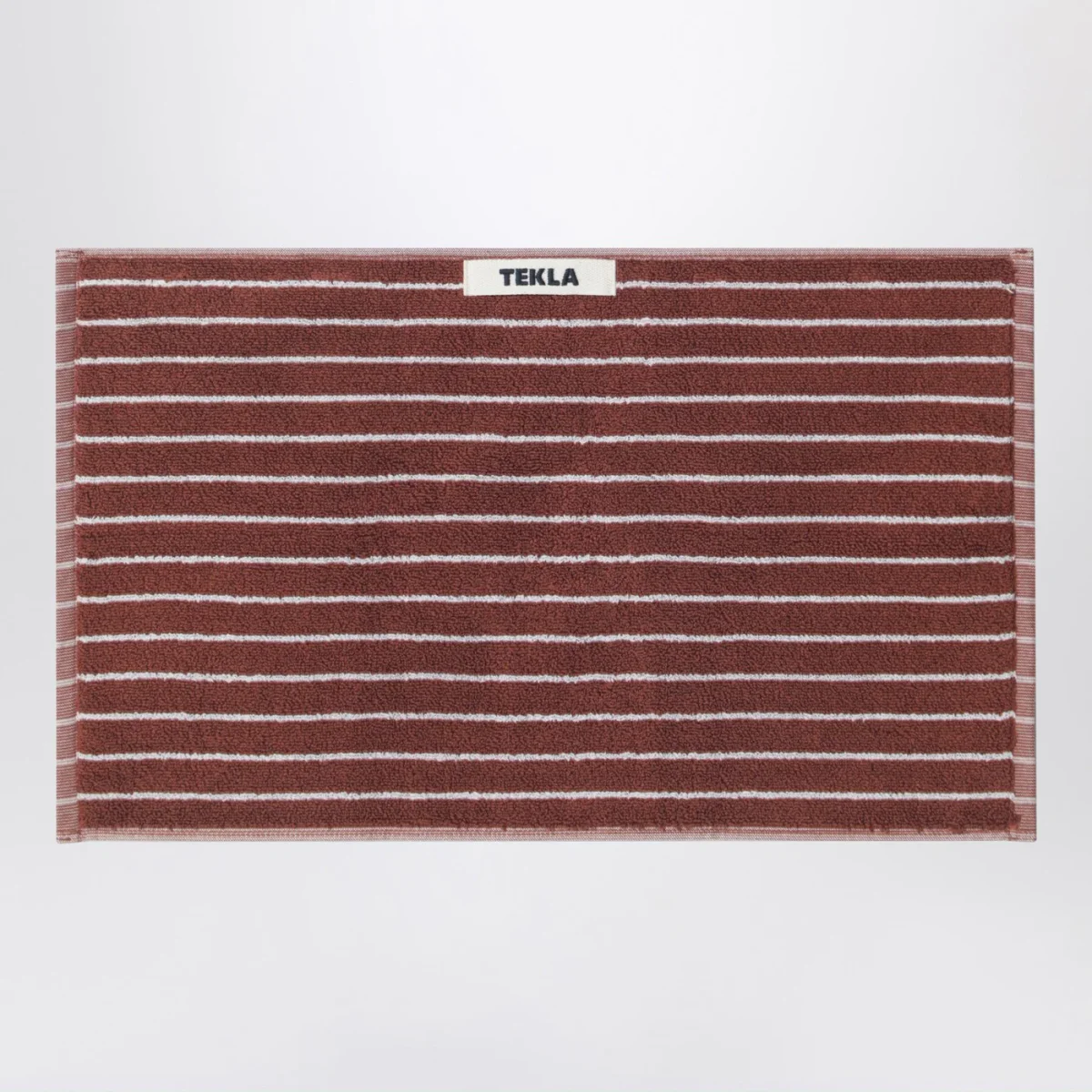 Telo bagno per ospiti di Tekla in spugna di cotone marrone rossastro a righe sottili bianche, caratterizzato da anello per appendere e patch logo lettering sul lato.