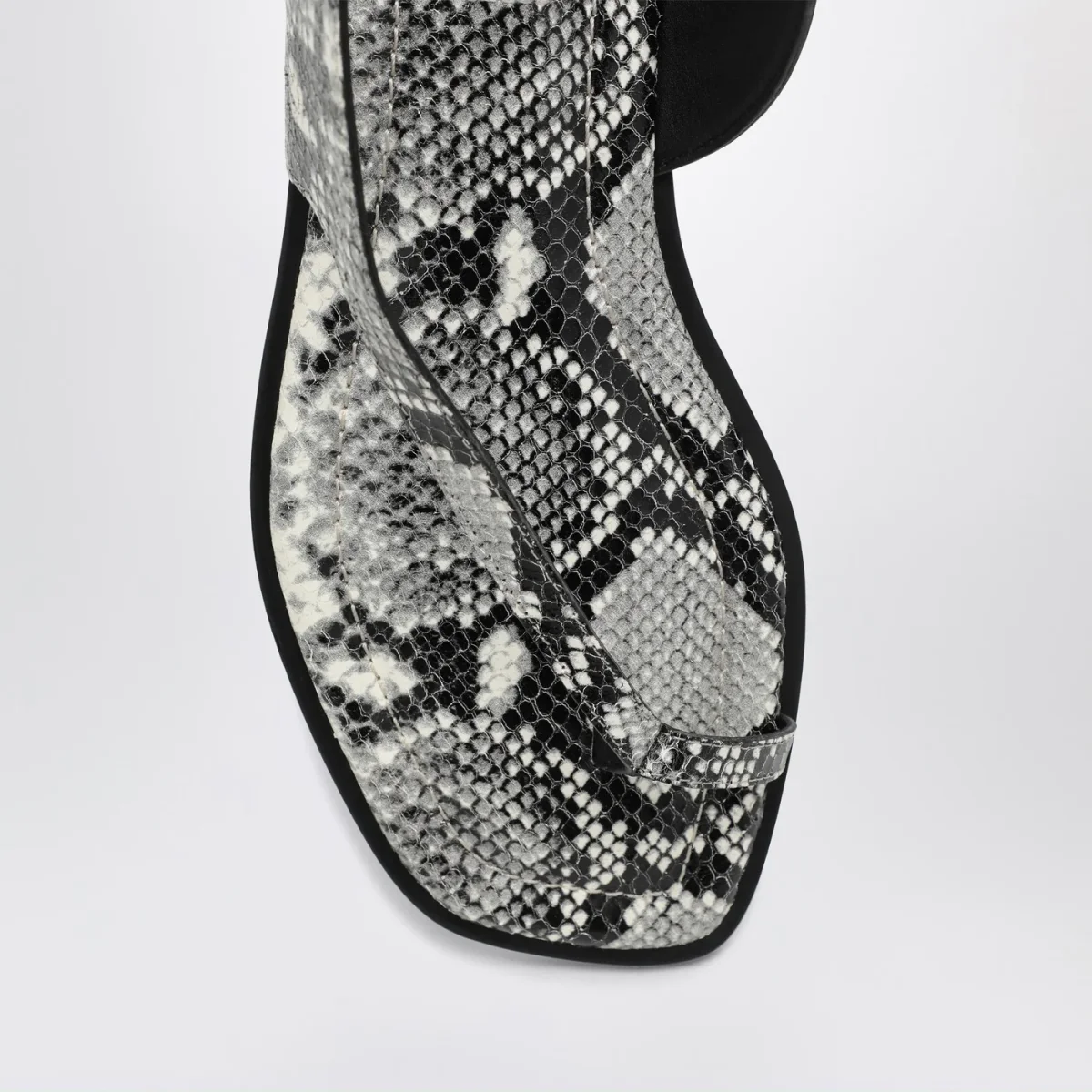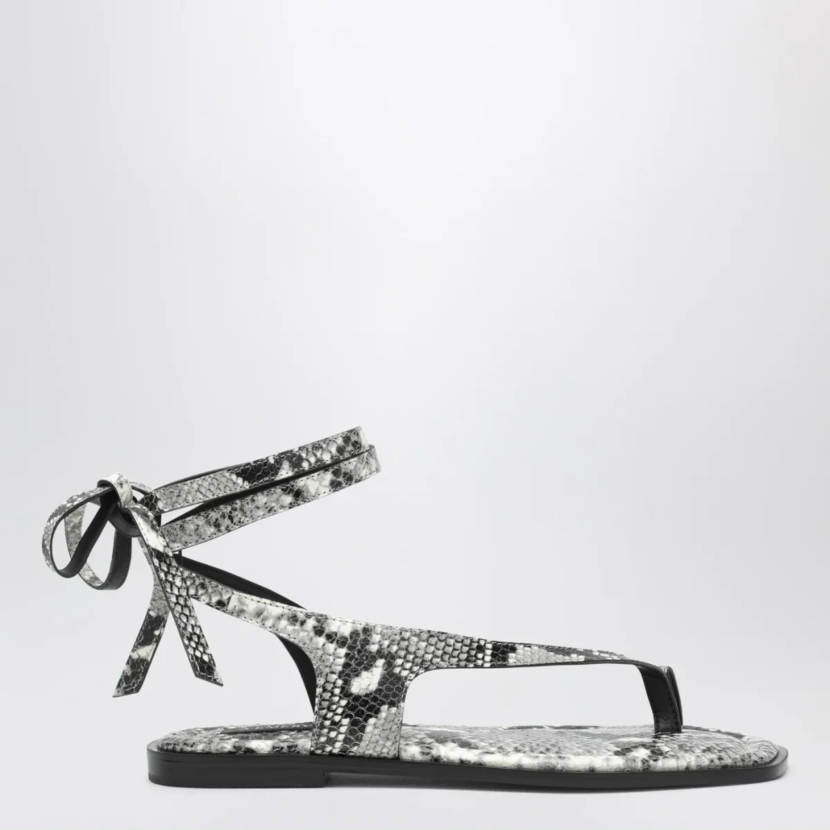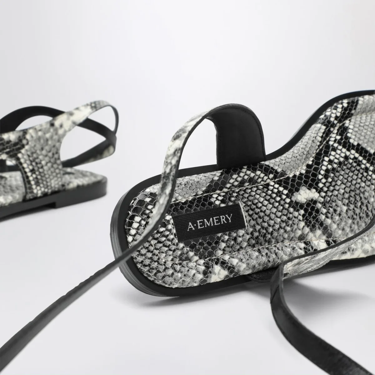Sandali infradito di A.Emery in pelle effetto coccodrillo avorio, caratterizzati da punta squadrata, plantare sottile imbottito, cinturino allacciato attorno alla caviglia e suola in cuoio.