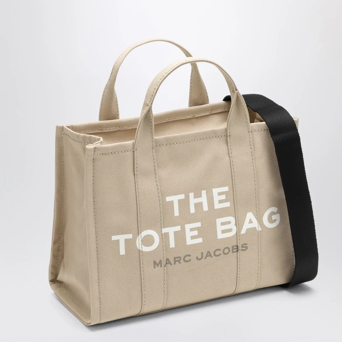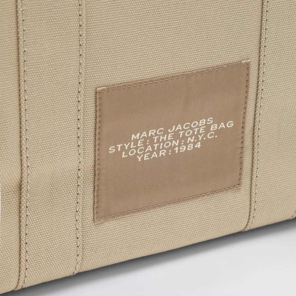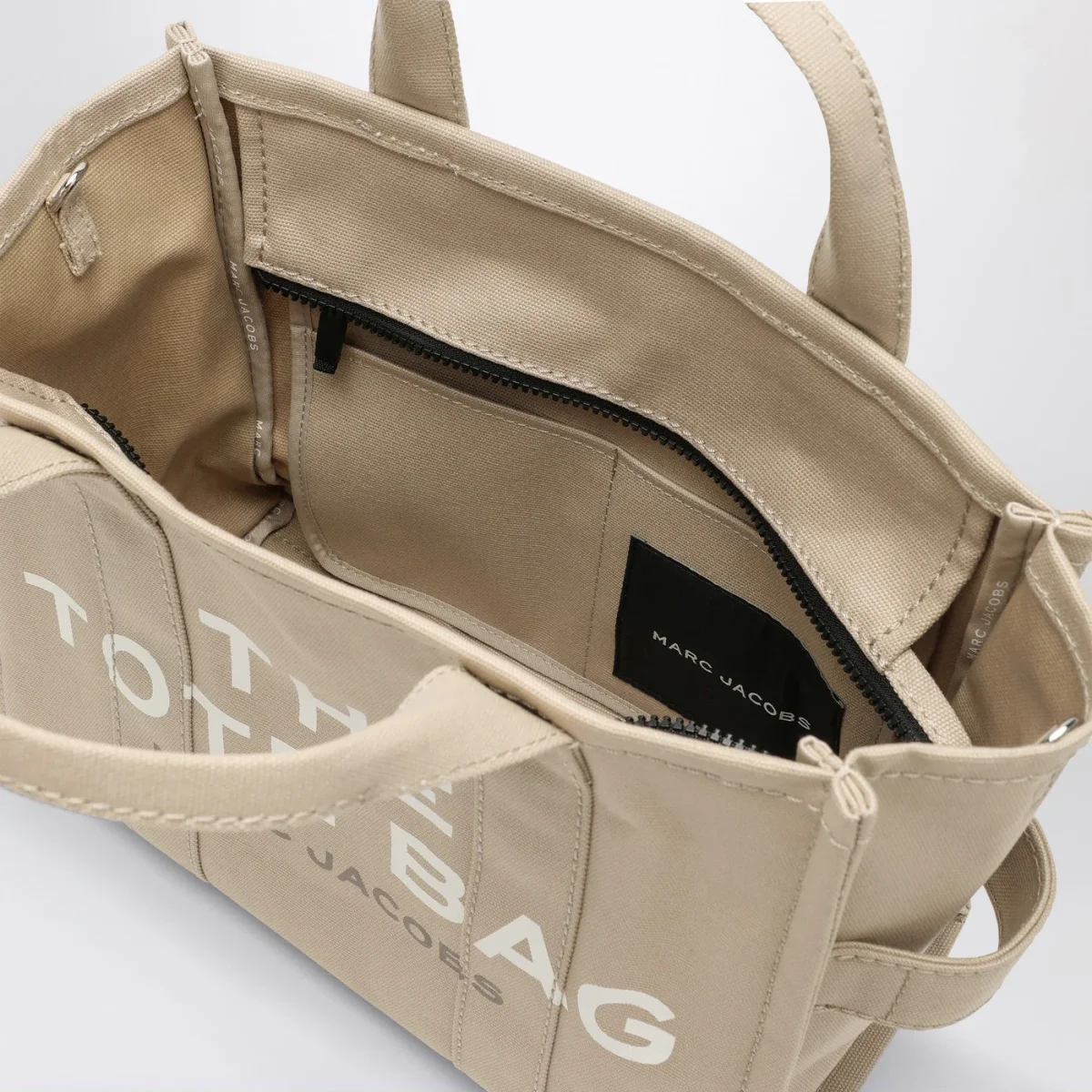 Borsa media di Marc Jacobs in tela di cotone beige, caratterizzata da due manici, chiusura con zip, tracolla regolabile e rimovibile e logo frontale a contrasto.