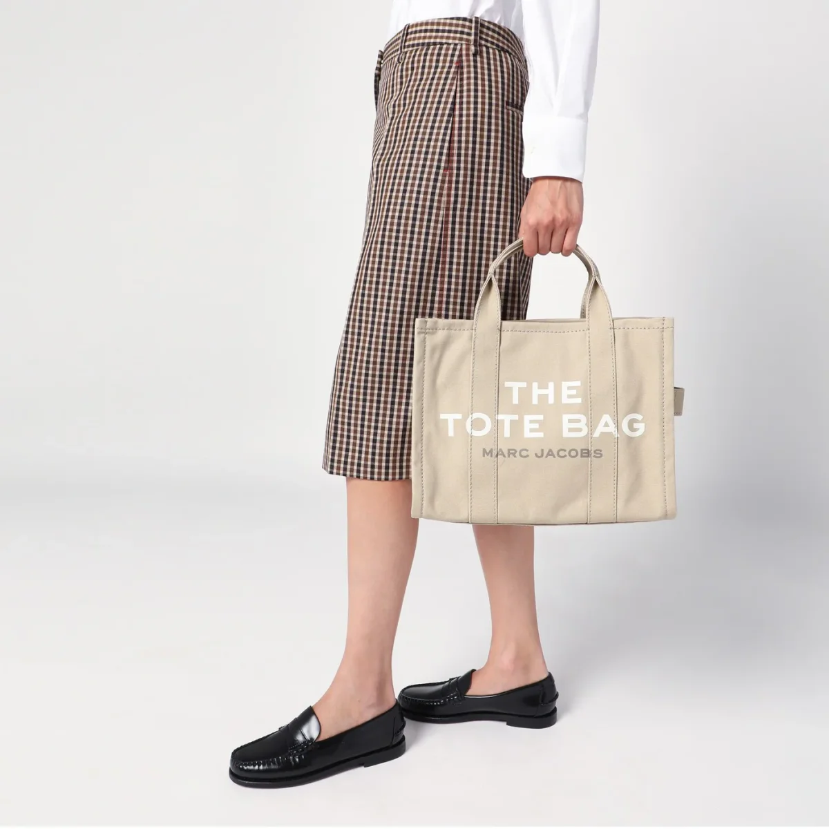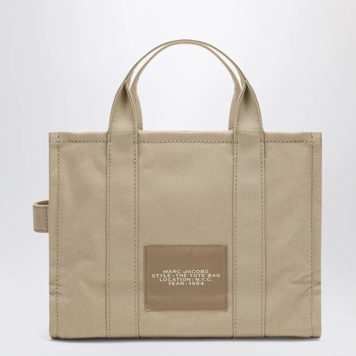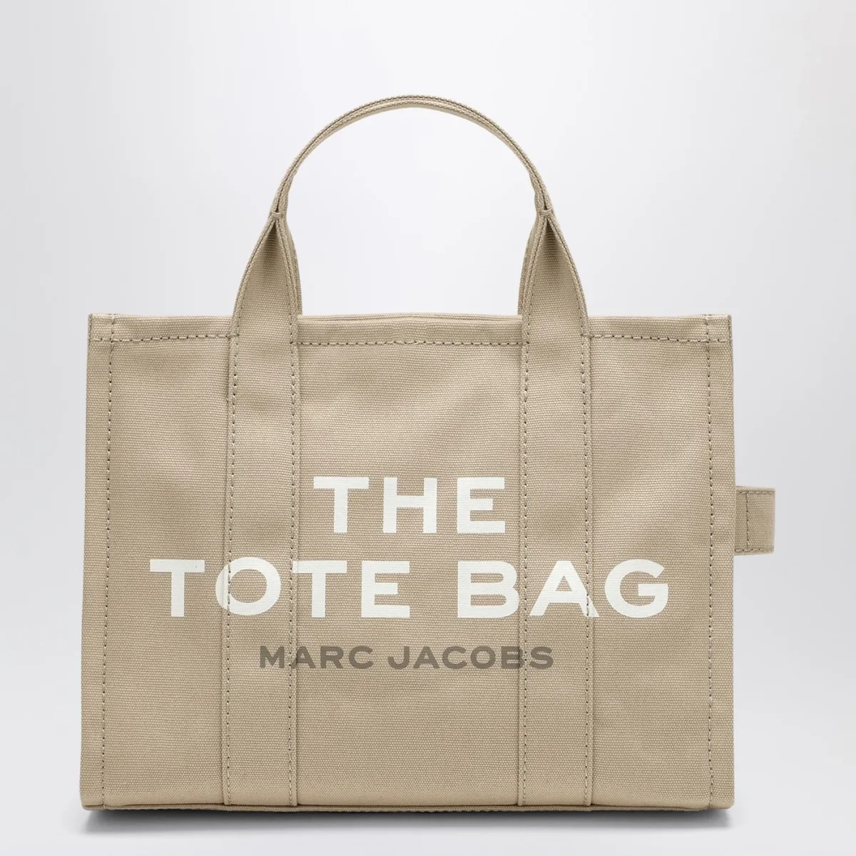 Borsa media di Marc Jacobs in tela di cotone beige, caratterizzata da due manici, chiusura con zip, tracolla regolabile e rimovibile e logo frontale a contrasto.