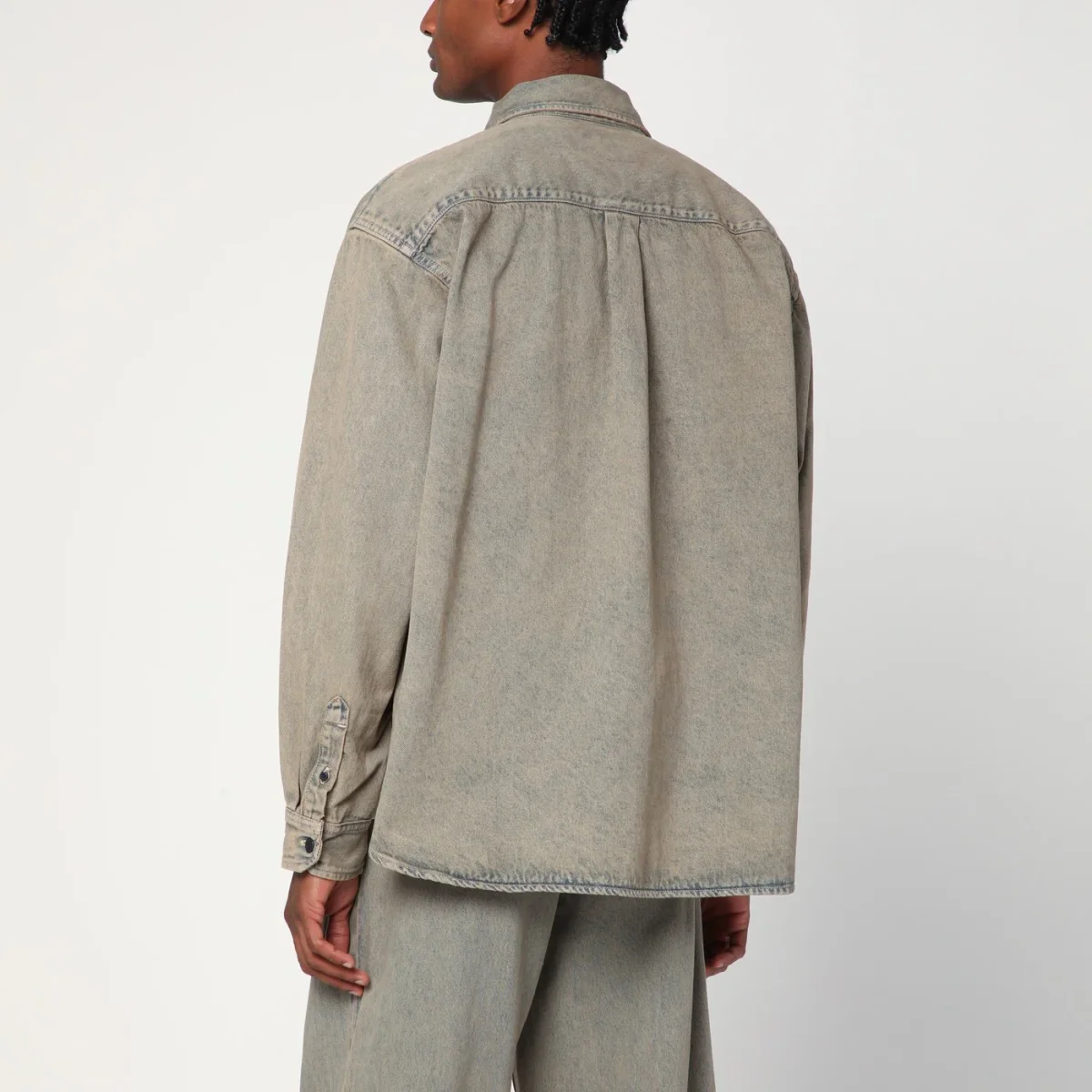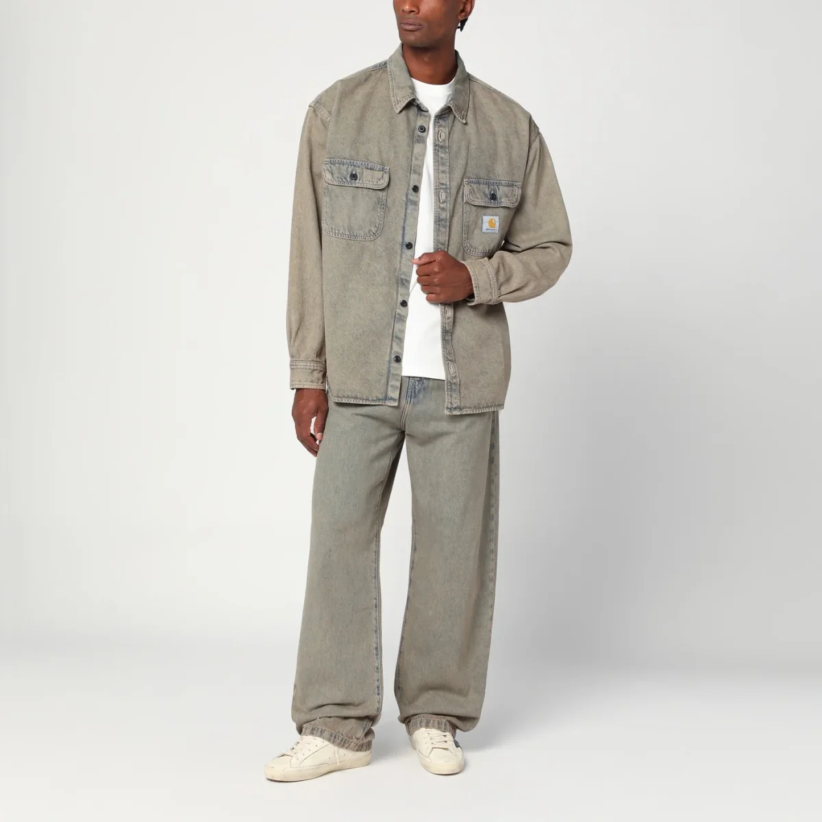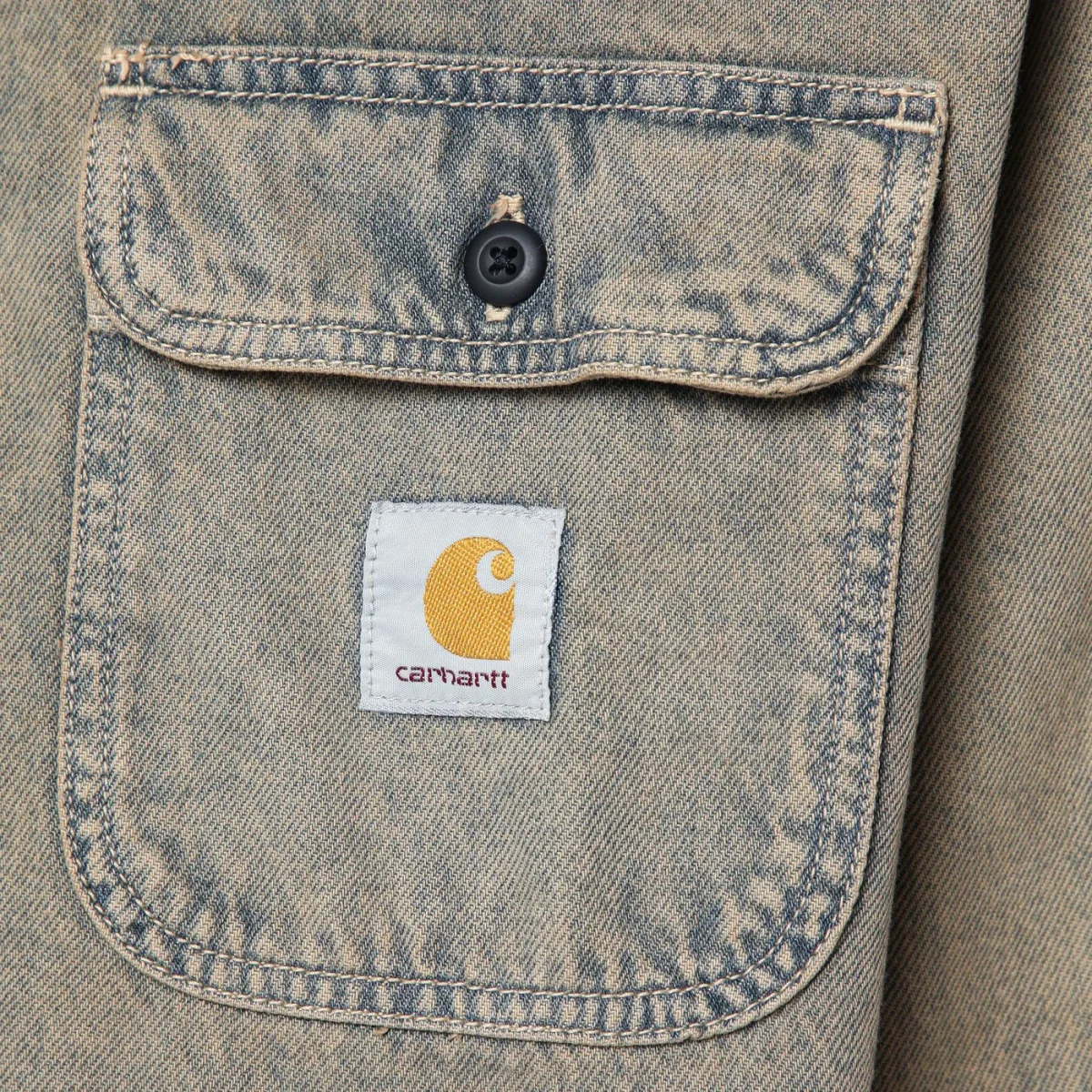 Giacca di Carhartt WIP in pesante denim di cotone senza fodera color Blue/Leather, caratterizzata da due tasche con bottoni sul petto una delle quali con etichetta logo quadrata in tessuto, chiusura anteriore con bottoni e maniche lunghe con polsi con bottoni.