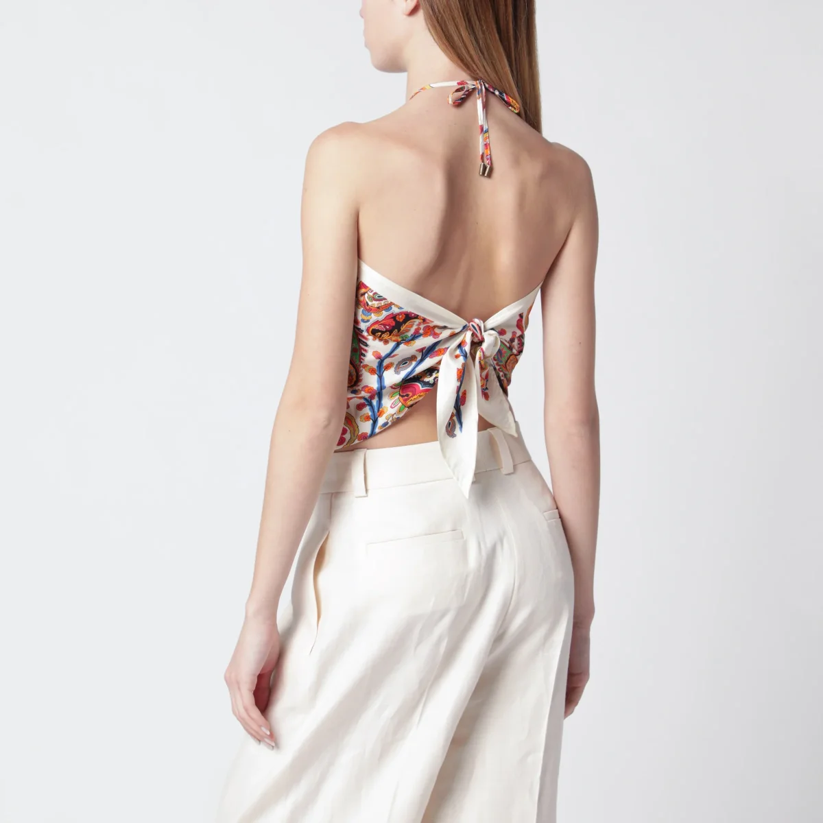 Top a bandana in twill di seta con motivo Paisley floreale