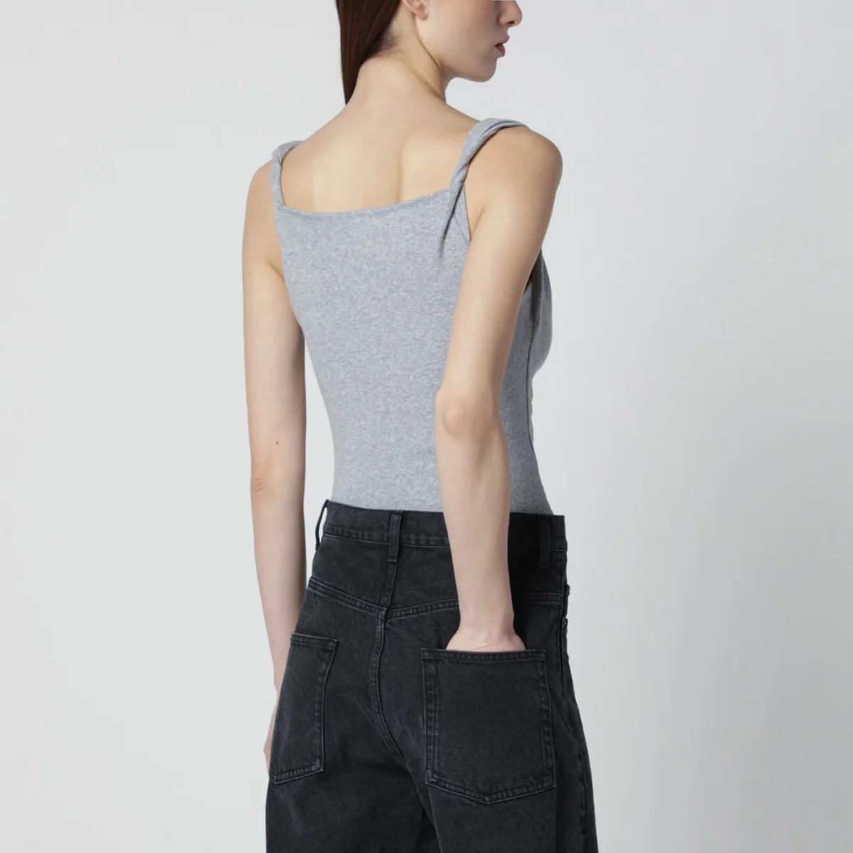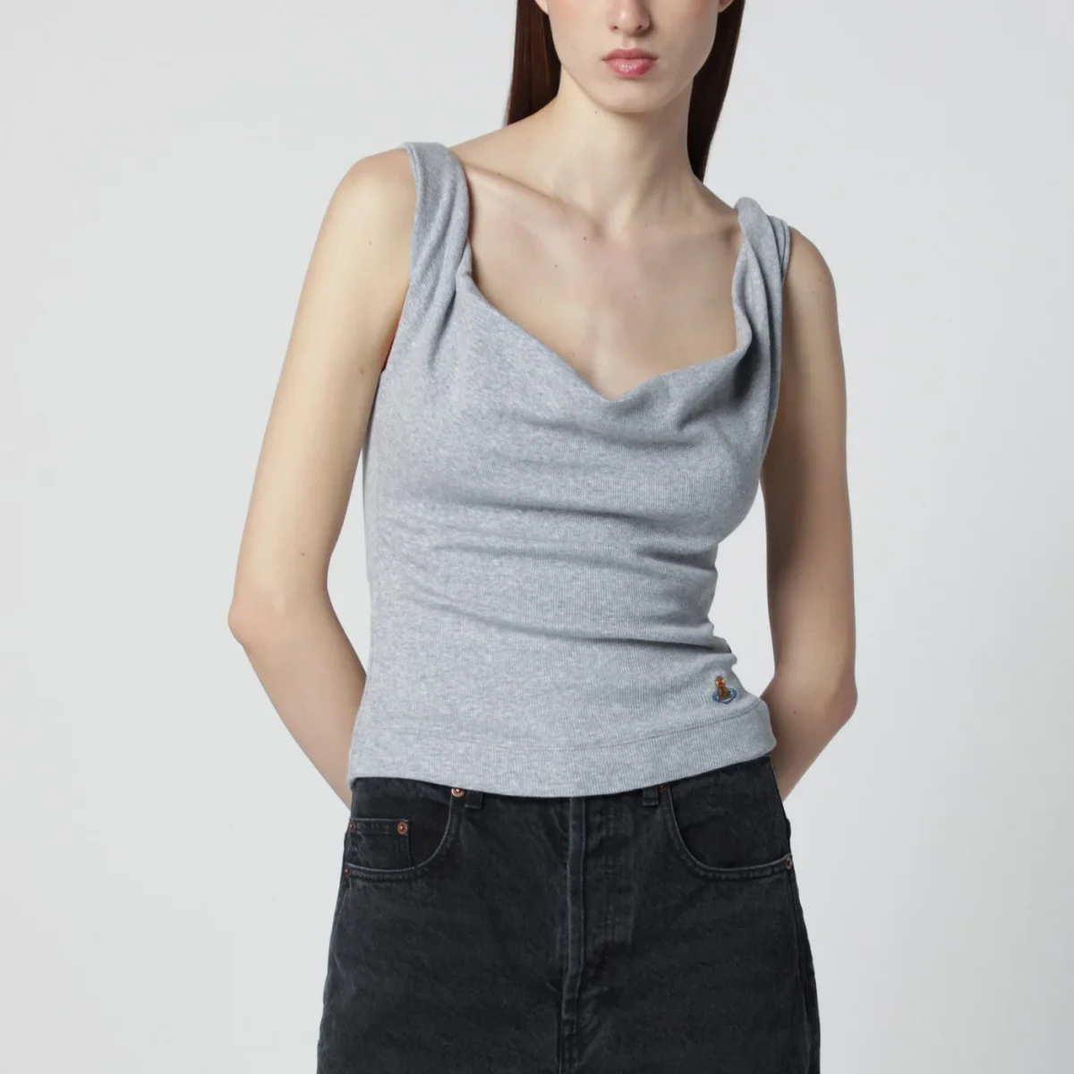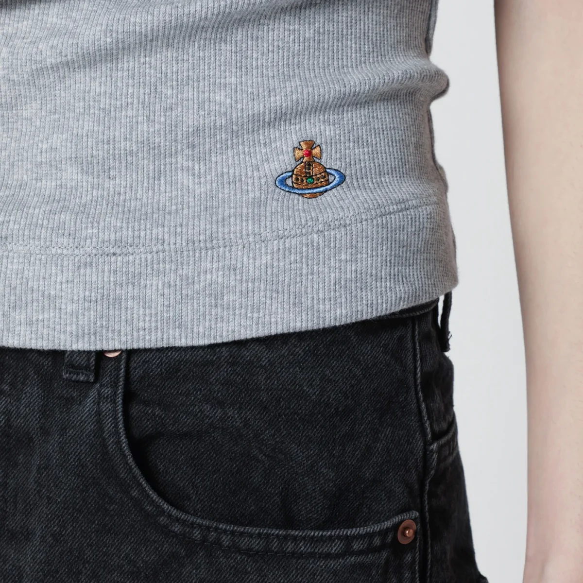 Top smanicato di Vivienne Westwood in cotone leggermente elasticizzato grigio, caratterizzato da logo Orb colorato ricamato sul davanti, design stile corsetto e scollo drappeggiato.