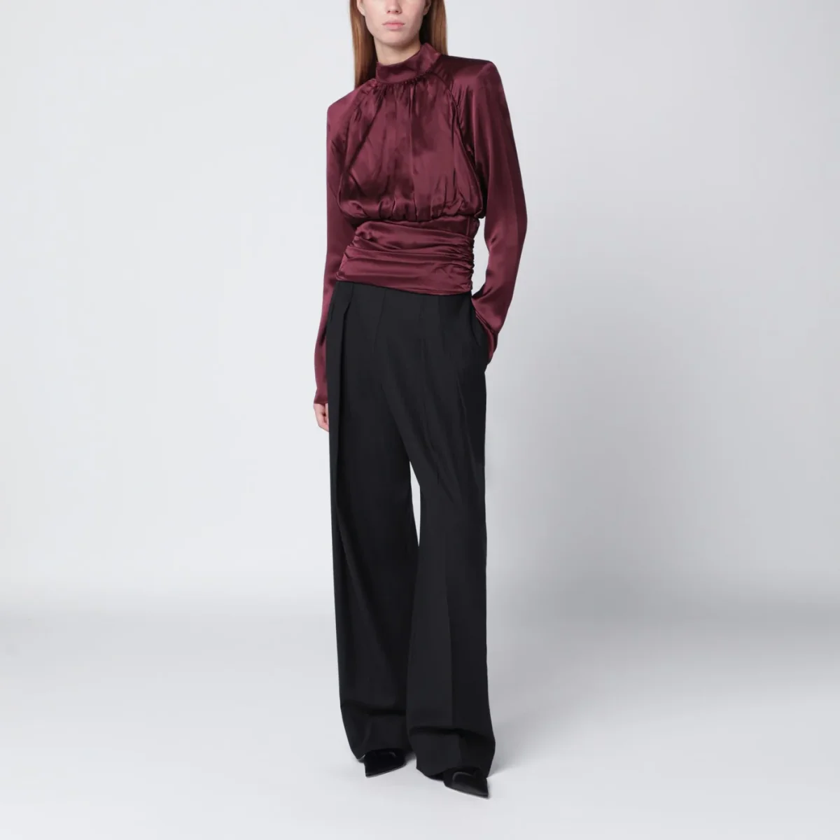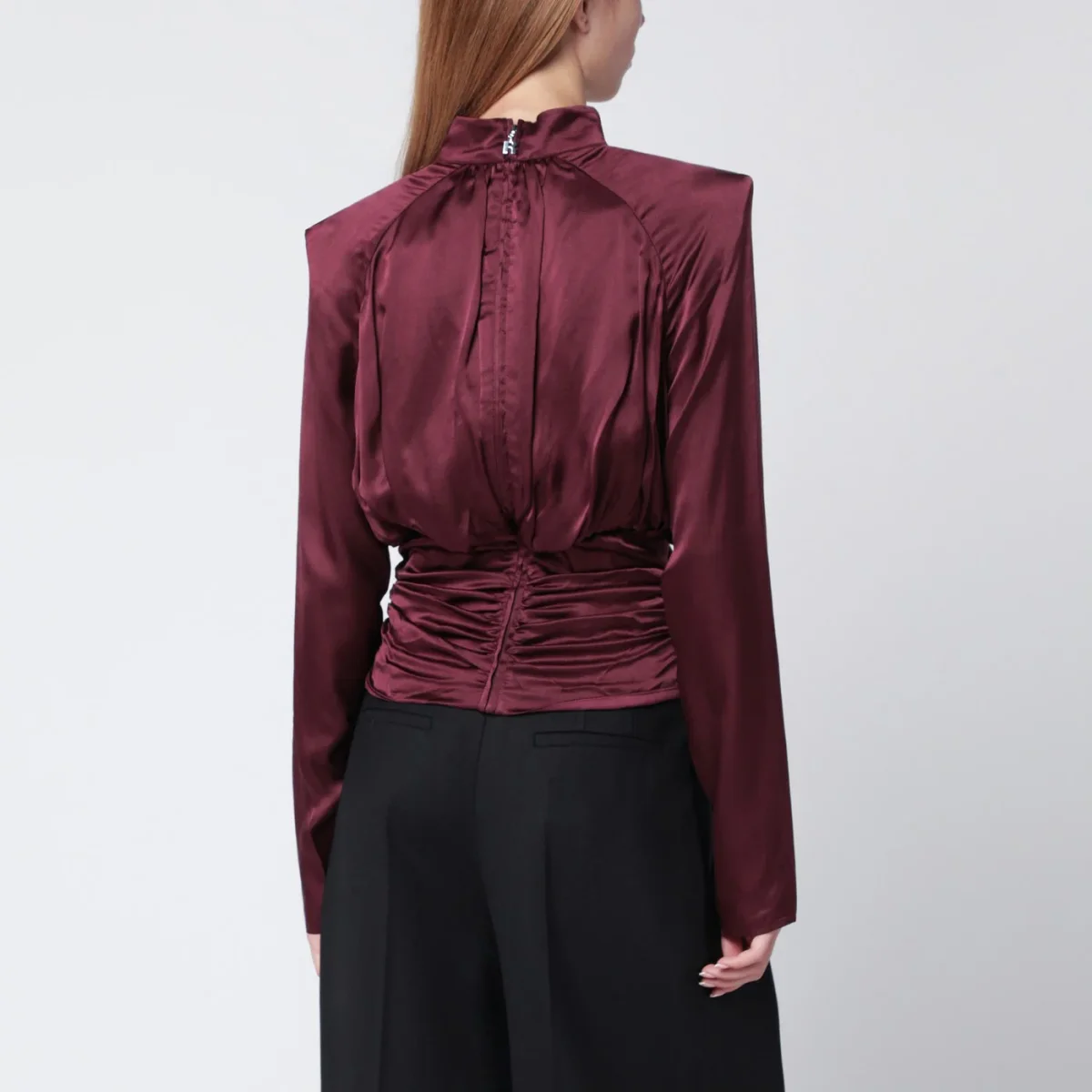 Top di Rotate in seta organica bordeaux, caratterizzato da maniche lunghe, chiusura posteriore con zip, scollo all’americana e arricciature strutturate lungo i fianchi.