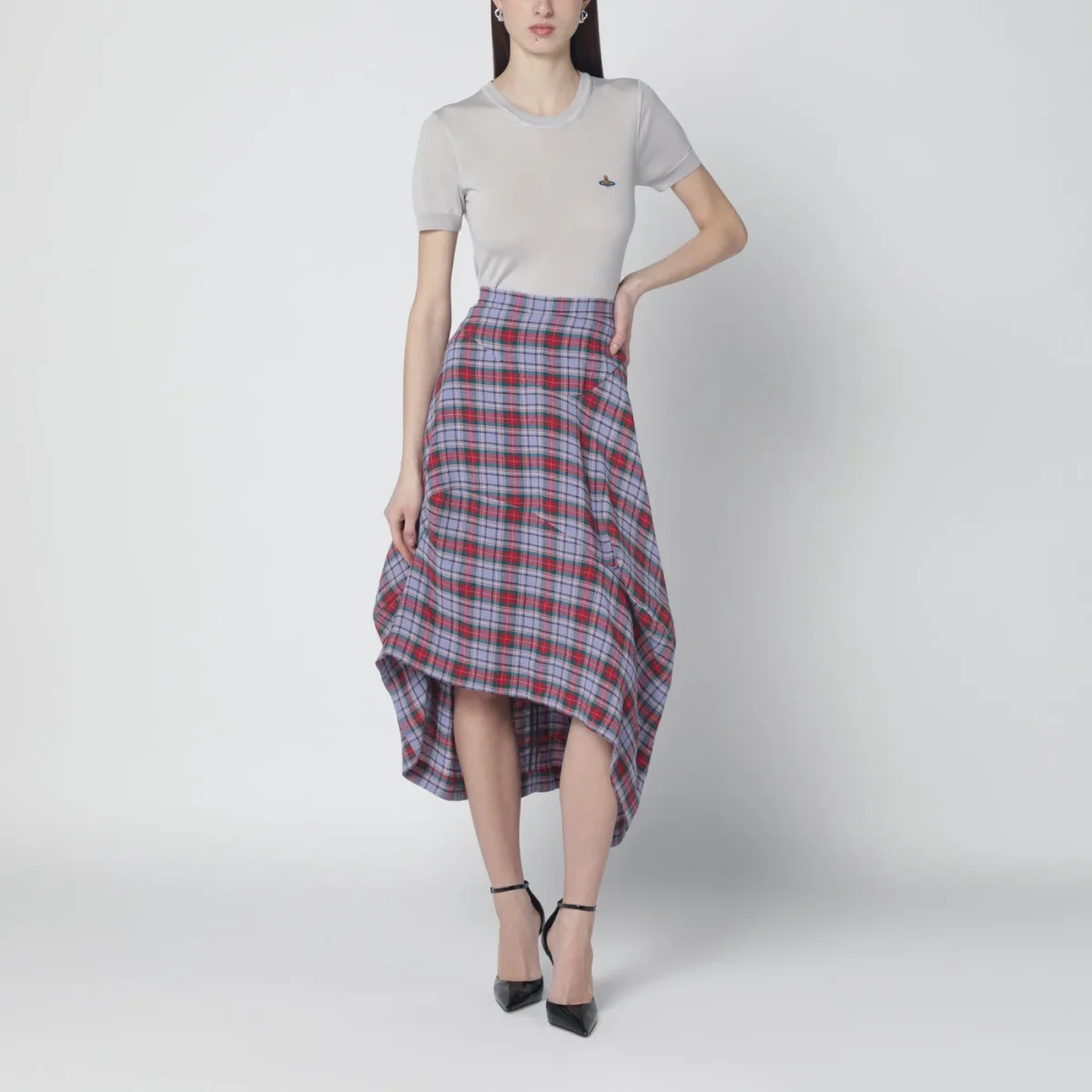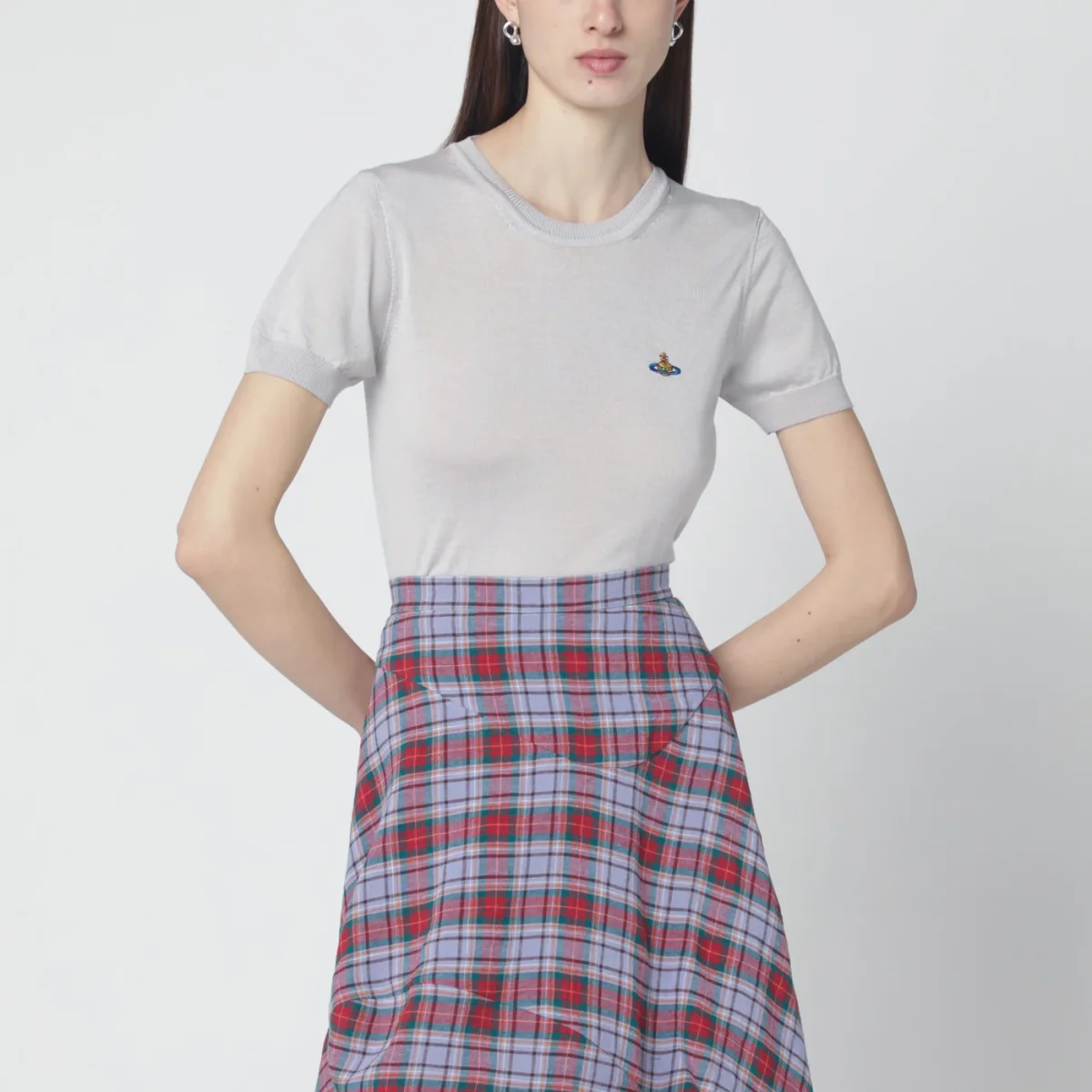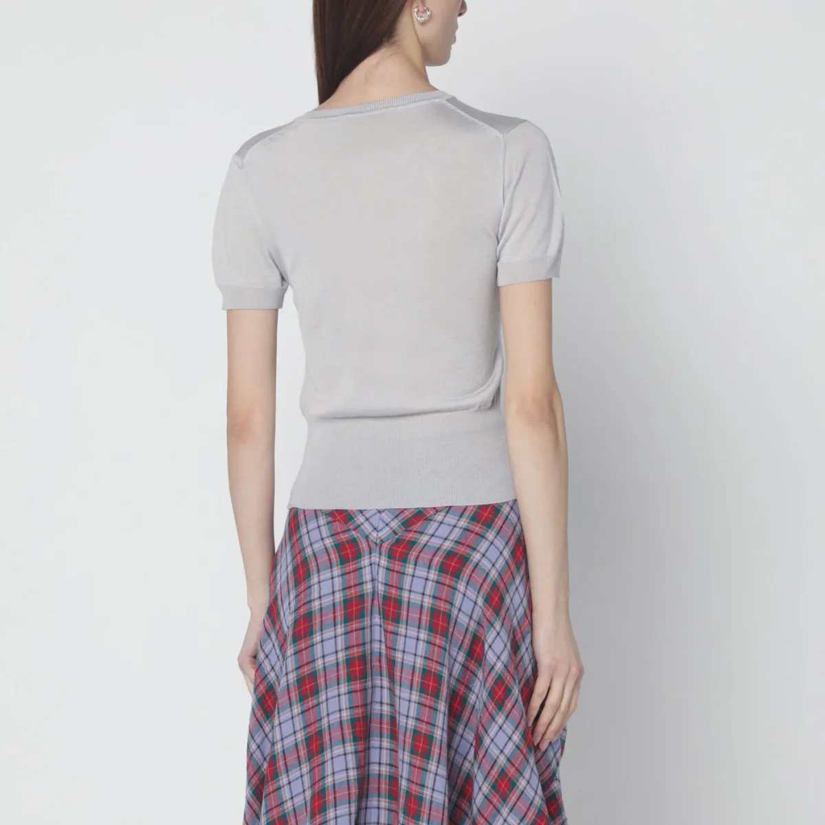 Top girocollo di Vivienne Westwood in lana e seta grigio chiaro• maniche corte• bordi a costine• logo Orb multicolore ricamato sul petto