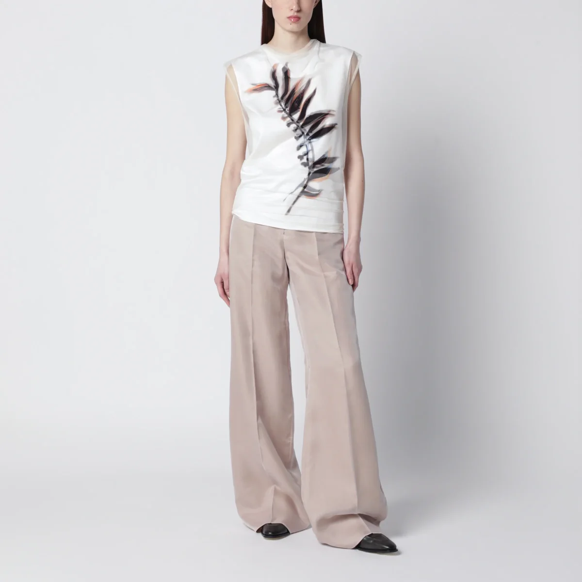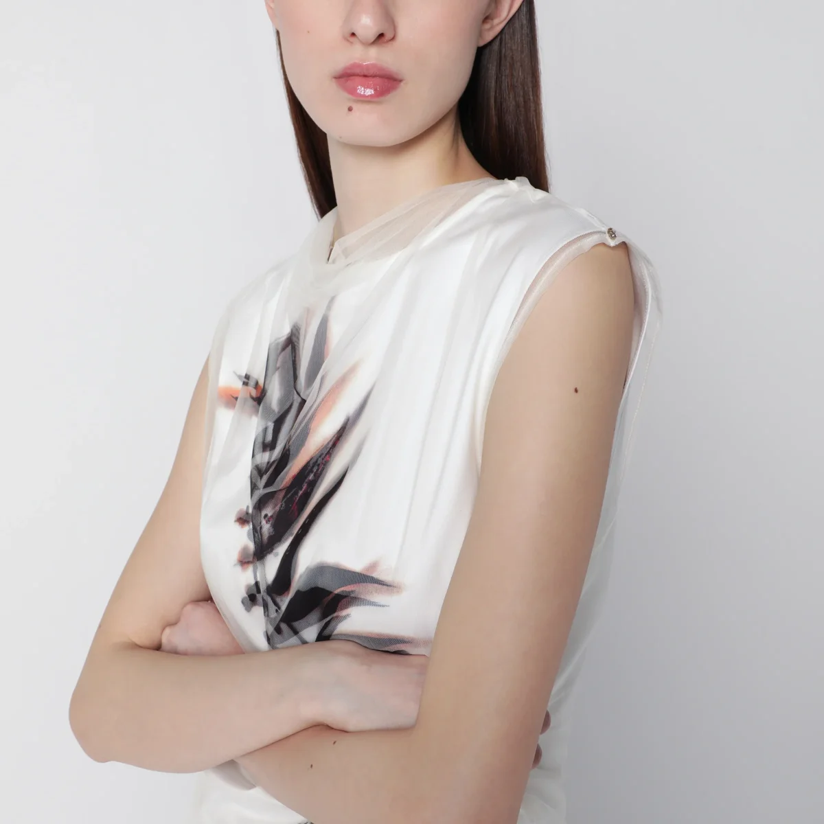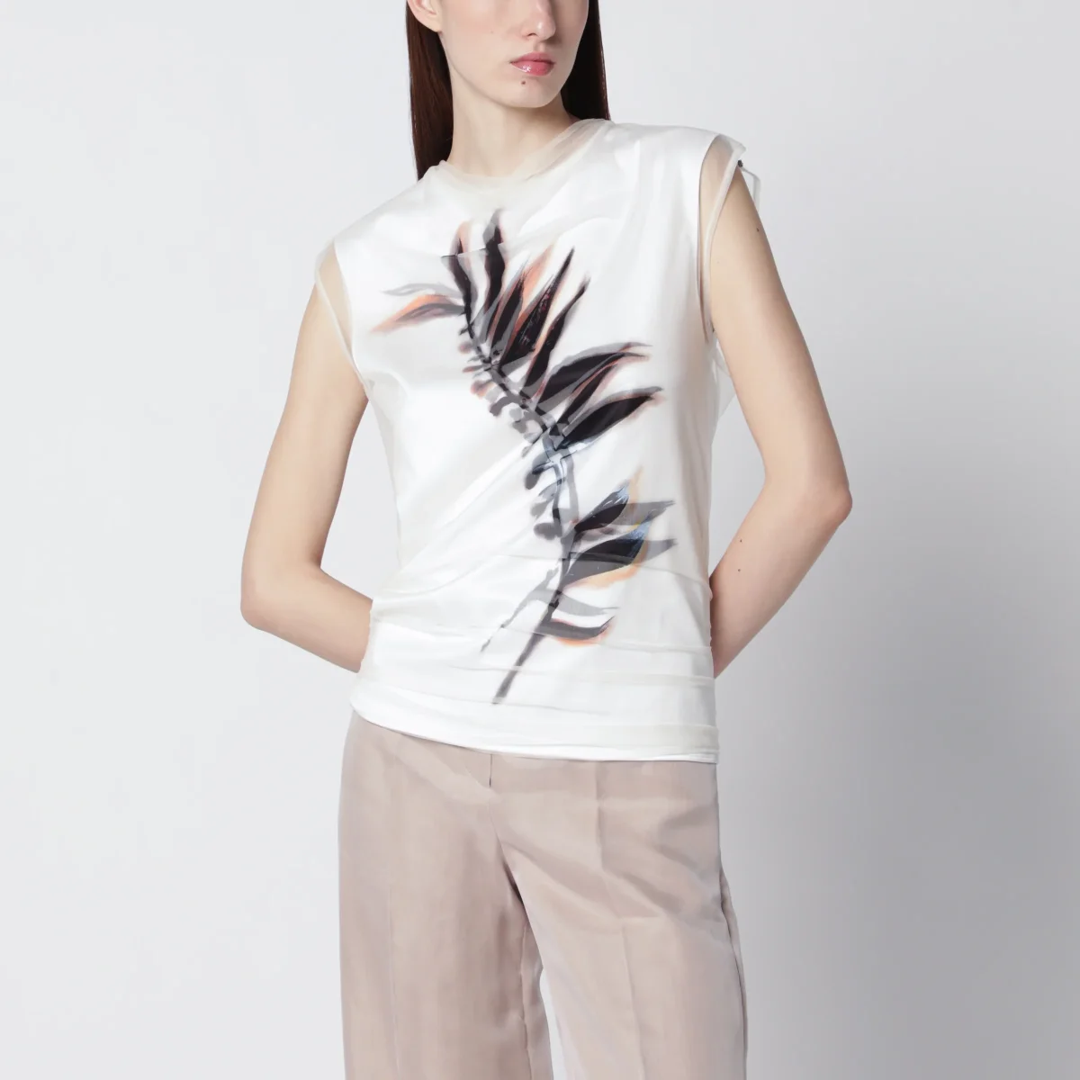 Top smanicato a doppio strato in raso e tulle di Sportmax• Colore: Bianco• Effetto sovrapposto trompe l’oeil• Top interno in raso con scollo stondato• Top esterno in tulle con collo rialzato leggermente drappeggiato• Stampa foliage sul davanti• Fit aderente e sagomato sul busto• Chiusura posteriore con zip• Vestibilità regolare