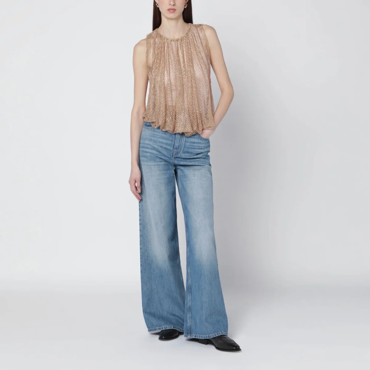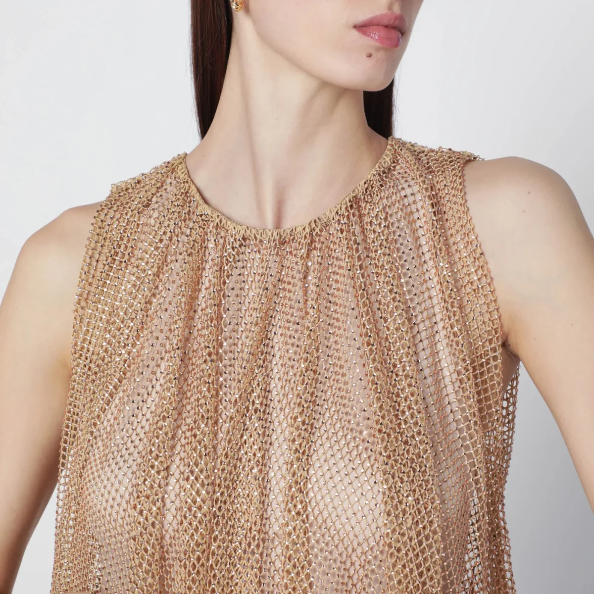 Top smanicato girocollo di Sportmax color cammello in rete• Cristalli on tone applicati all over• Inserto elastico sul fondo• Canotta in jersey abbinata• Vestibilità regolare