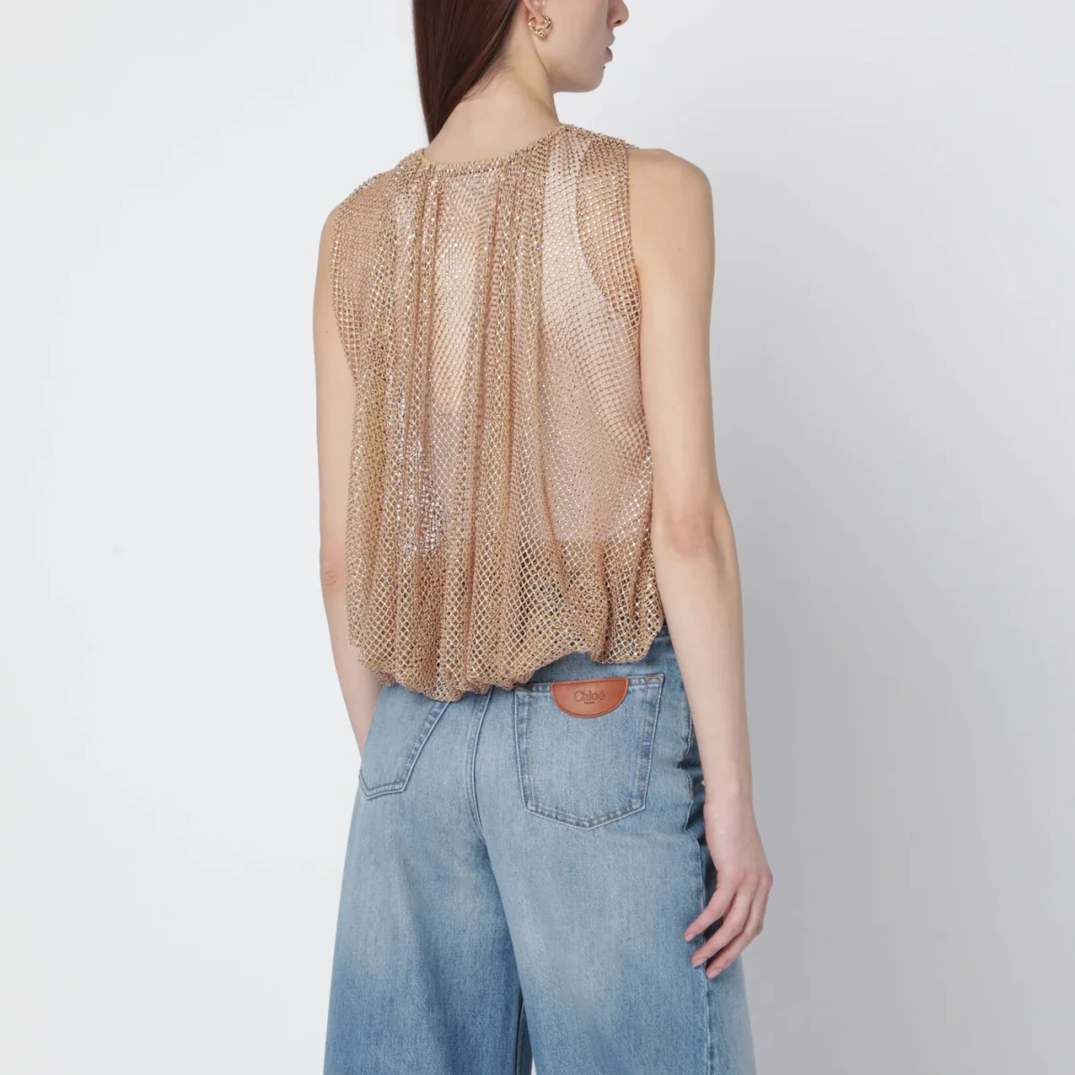 Top color cammello in rete con cristalli