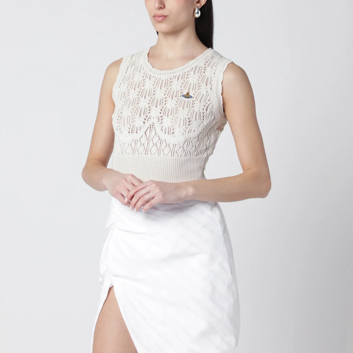 Top girocollo smanicato di Vivienne Westwood in crochet di cotone• Colore: Crema• Logo Orb ricamato sul petto a contrasto• Bordo a coste