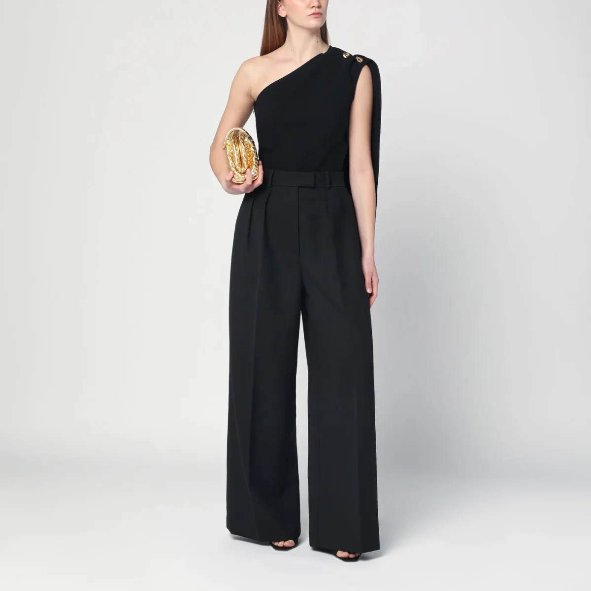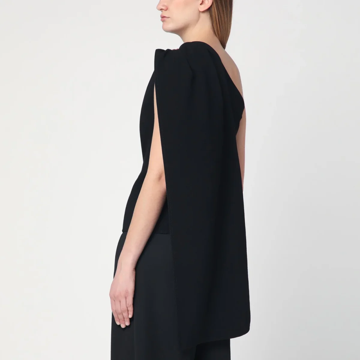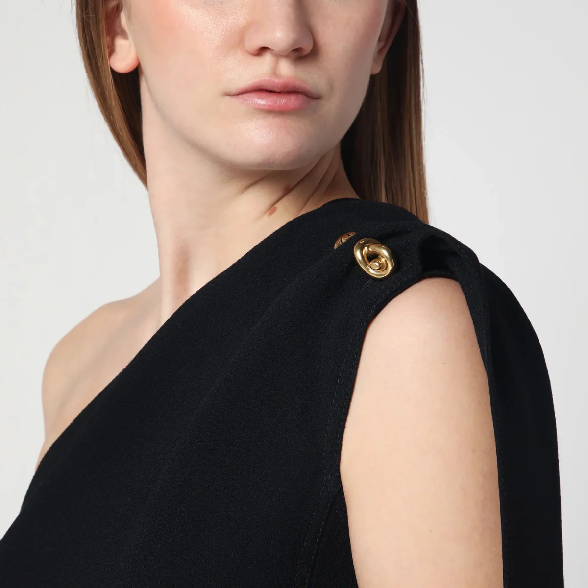 Top monospalla di Bottega Veneta in crêpe di lana e viscosa nero, caratterizzato da dettaglio con drappeggio e bottoni Knot in metallo sulla spalla e chiusura laterale con zip.